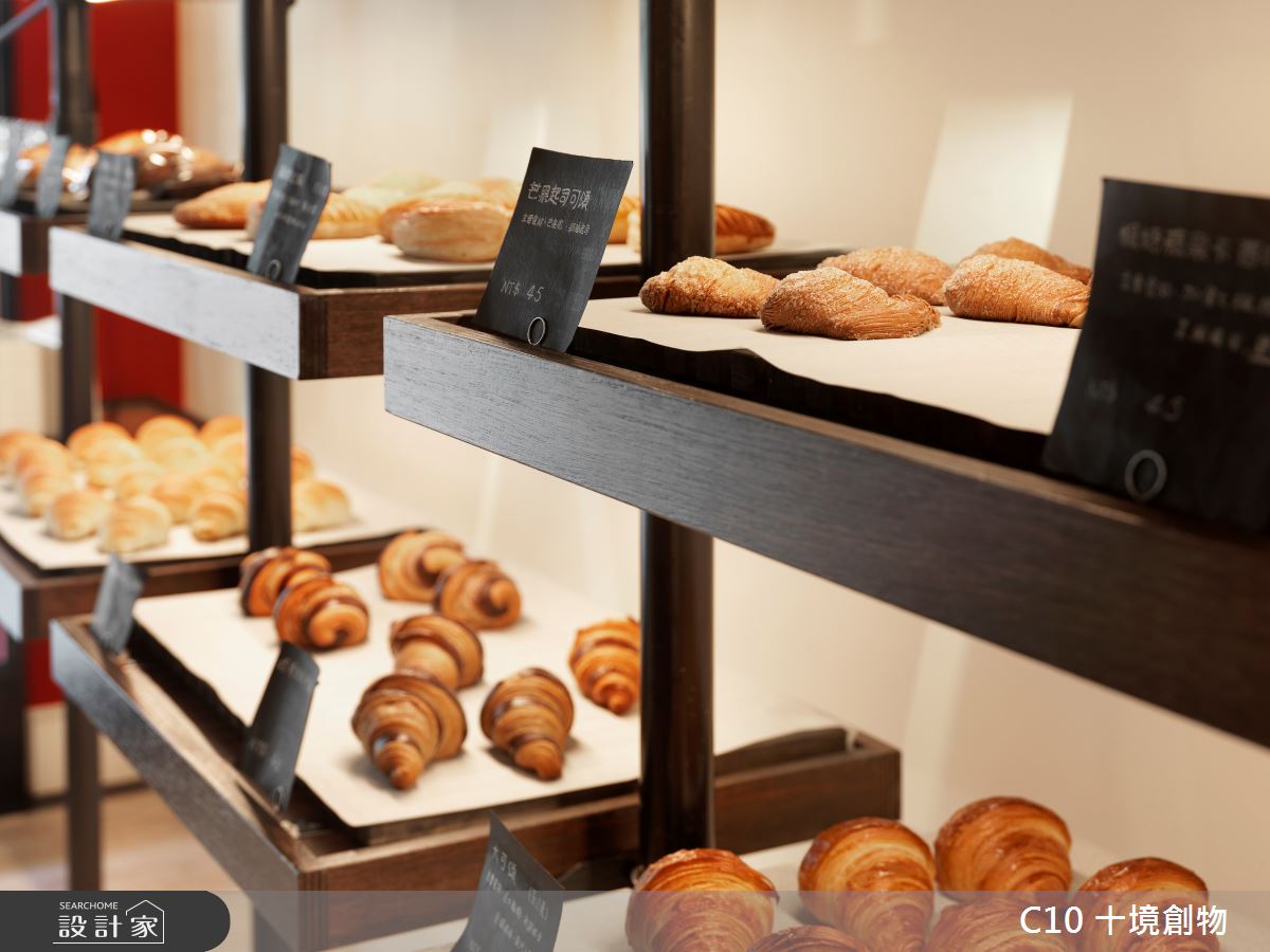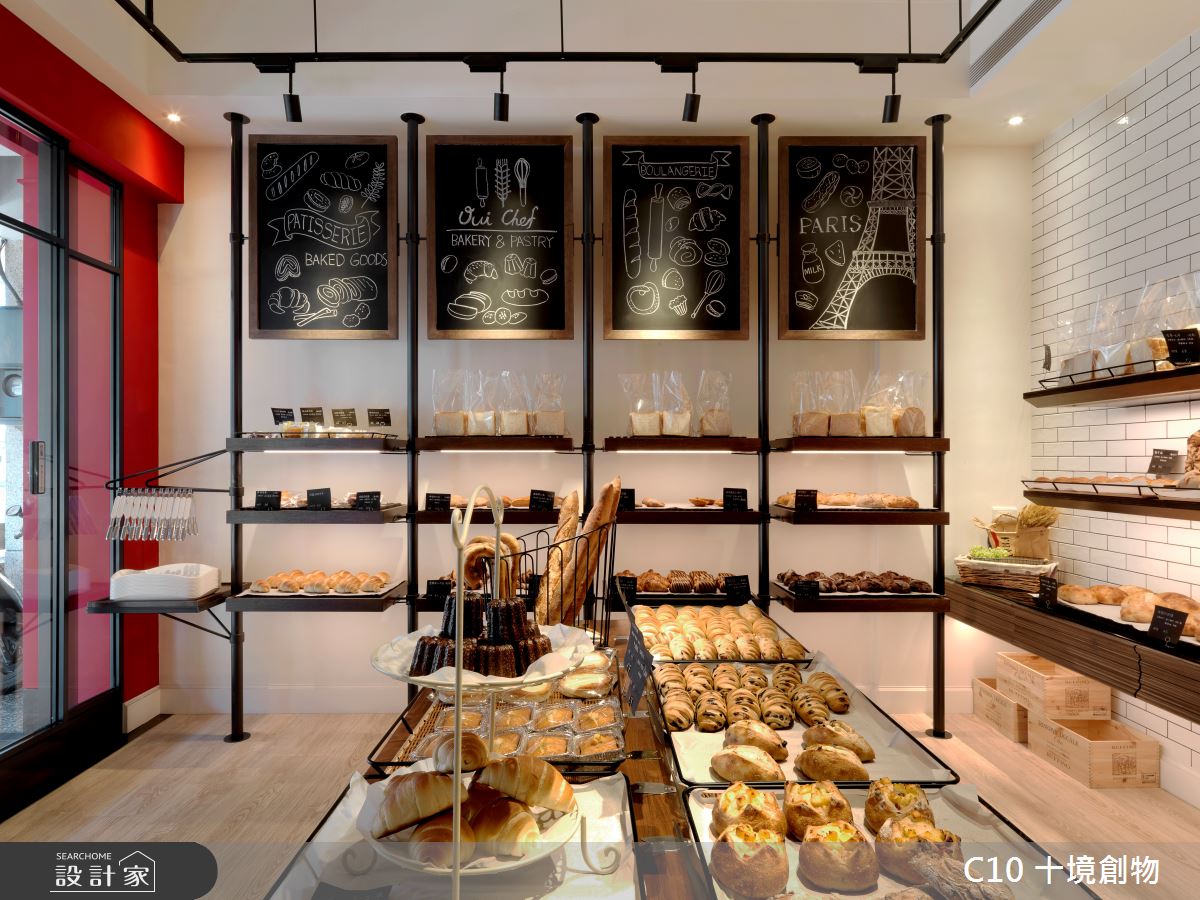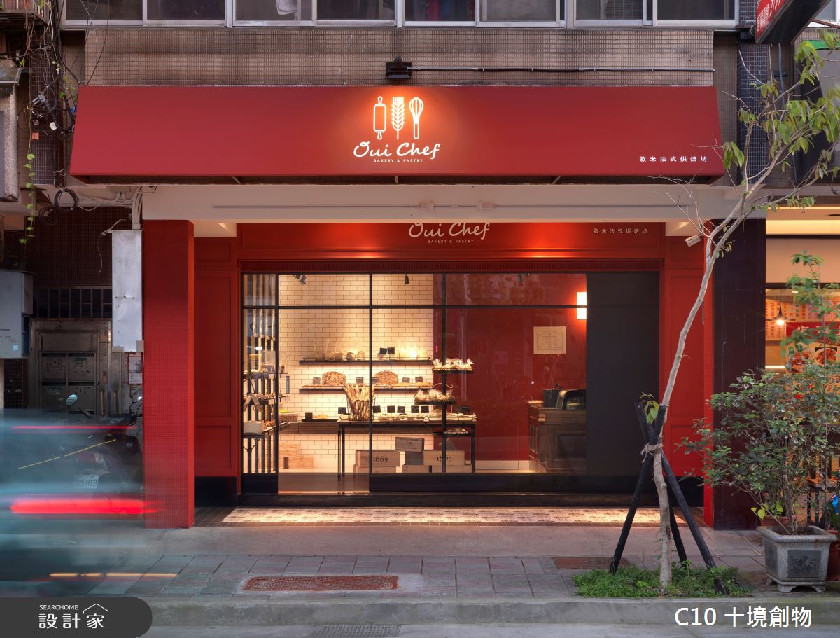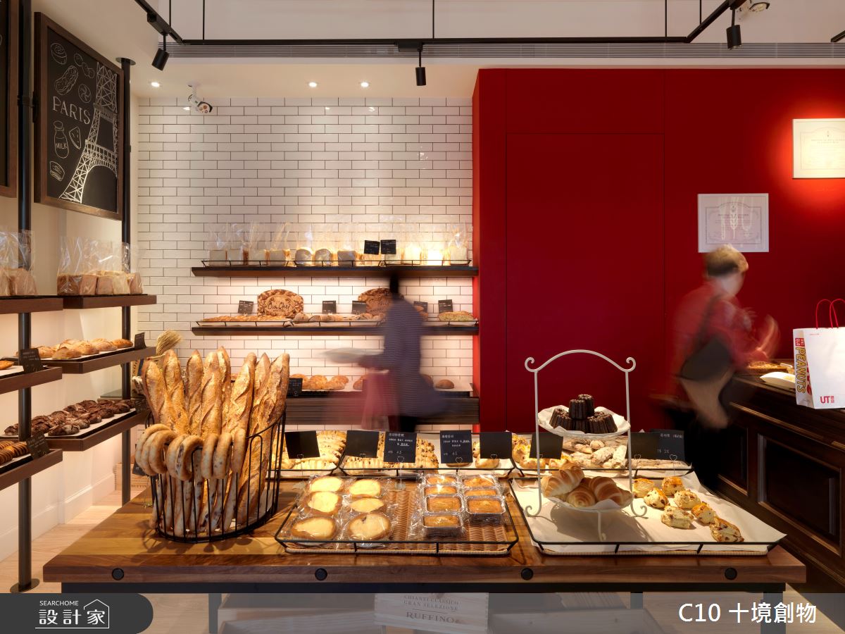 希望營造出人群中醒目的停留點,投射出異國情調,彷彿置身法國香榭麗舍大道的風情。讓顧客能在台灣體驗置身法國的感受。業主特別挑選有騎樓空間的店面做為麵包店的空間,讓顧客能有一個悠閒駐足的轉換空間,進而增加顧客購買意願。 利用了大篇幅的紅色,亦是法國的代表色來讓麵包店能在都市中吸引所有人的目光。店內僅利用鐵件串連所有結構來降低繁雜的裝修,呼應了法式簡約風格,好讓麵包這個主角能有更好的呈現舞台。(文字提供:十境創物)