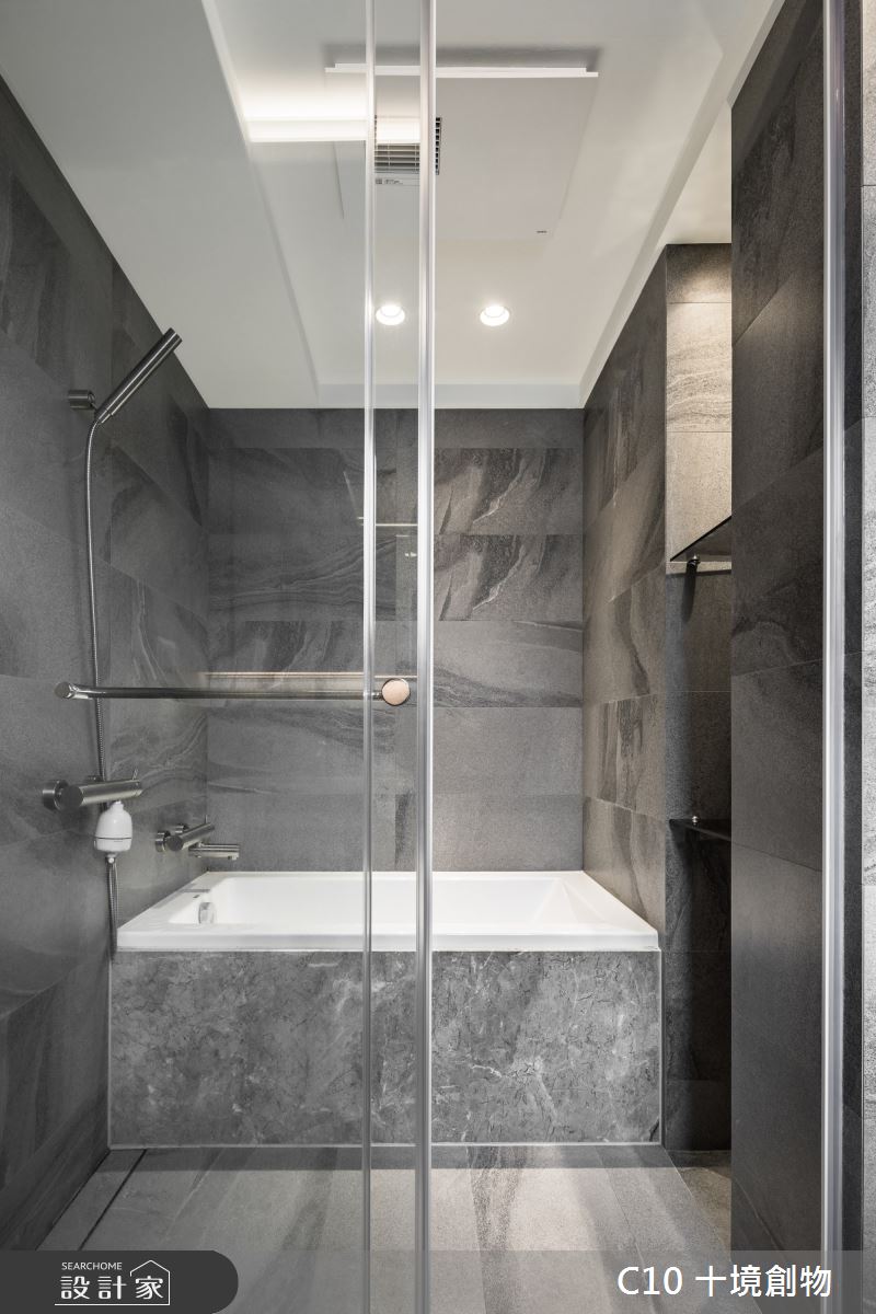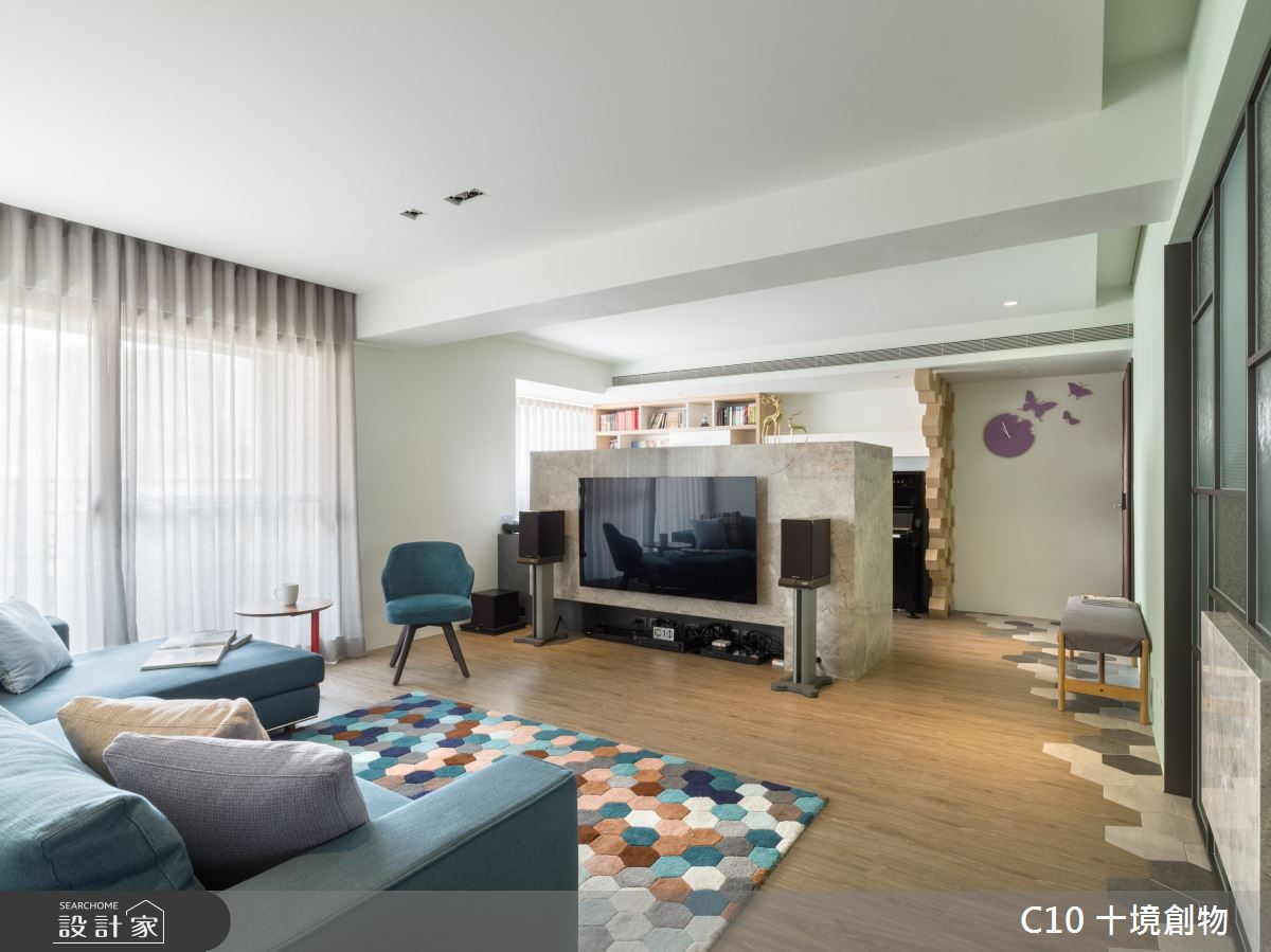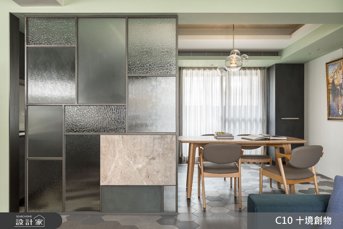 C10 十境創物以海島型木地板、大理石、人造石、黑鐵烤漆、橡木、玻璃磚、花崗石、實木格柵、胡桃木的搭配應用,呈現現代風居家氛圍,將此間60坪、三房、單層、新成屋(5年以下)打造成舒適愜意的家庭空間,完成2位大人、2位小孩全家人的夢想之居。