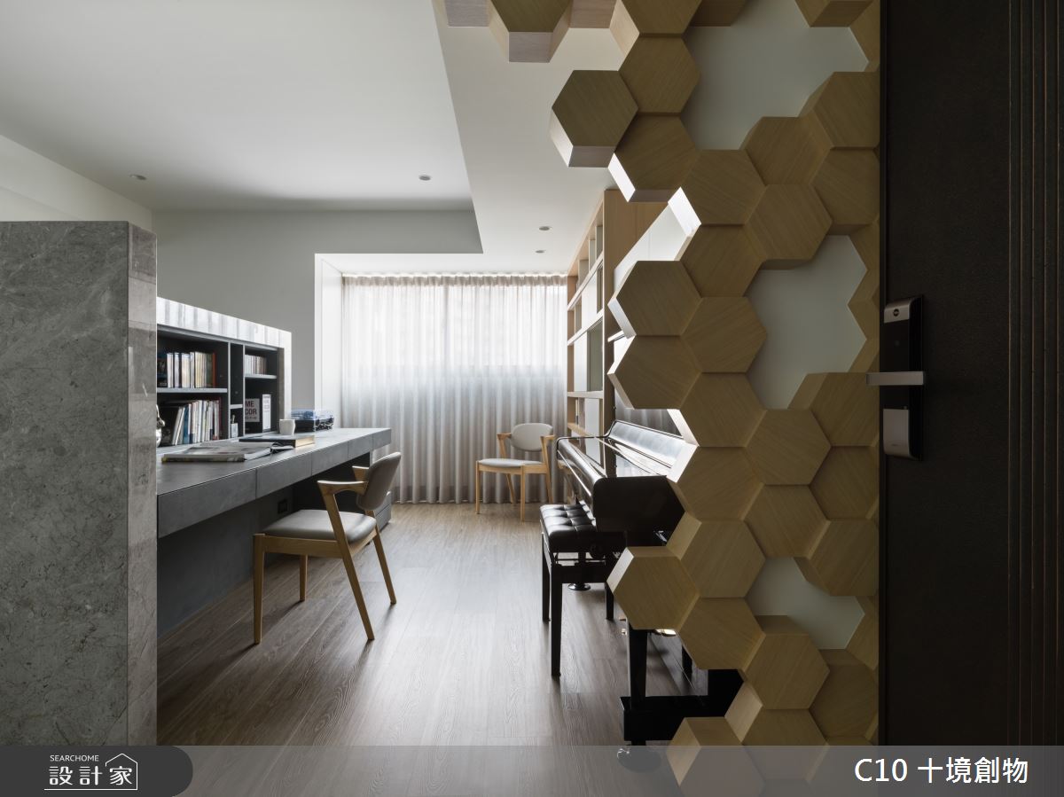 空間中希望營造出一抹自然的風味,藉由綠色塊及磁磚鋪面的滲透,區分出機能的使用方式,讓一切回歸自然質樸的生活原味。 以純粹的圖騰為基調,並嘗試置入蜂巢等元素,隱喻家庭成員有如蜂群般的親密關係,納入成為空間的一部分。 半高電視牆以石材作為區隔書房與客廳的機能,並以更開放的使用方式延續居家空間的穿透與互動,也藉以彰顯自然元素,再利用木質櫃體、木地板肌理與之呼應,提升空間暖度。吧檯區屏風以各式手做玻璃的分割引導視覺不受其他居家嫌惡設施的干擾,減輕量體壓迫感,同時滿足實用收納機能。 綠、白、木紋色彩,建構空間的主色調,不僅公共區如此,私領域臥房也延續相同色彩規劃。 全屋以簡約俐落的線條,搭配現代而不失溫暖的色彩,彰顯個人特質,讓整體空間更能感受到量身訂製的獨特氛圍。(文字提供:十境創物)