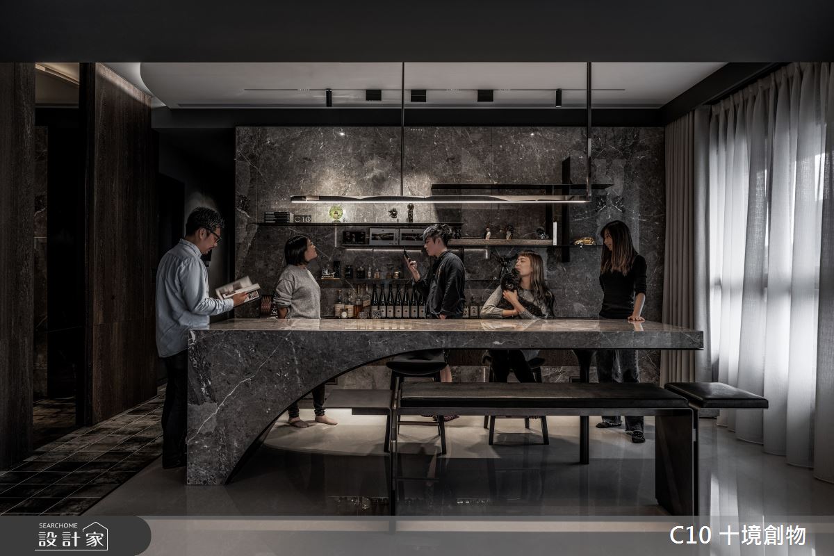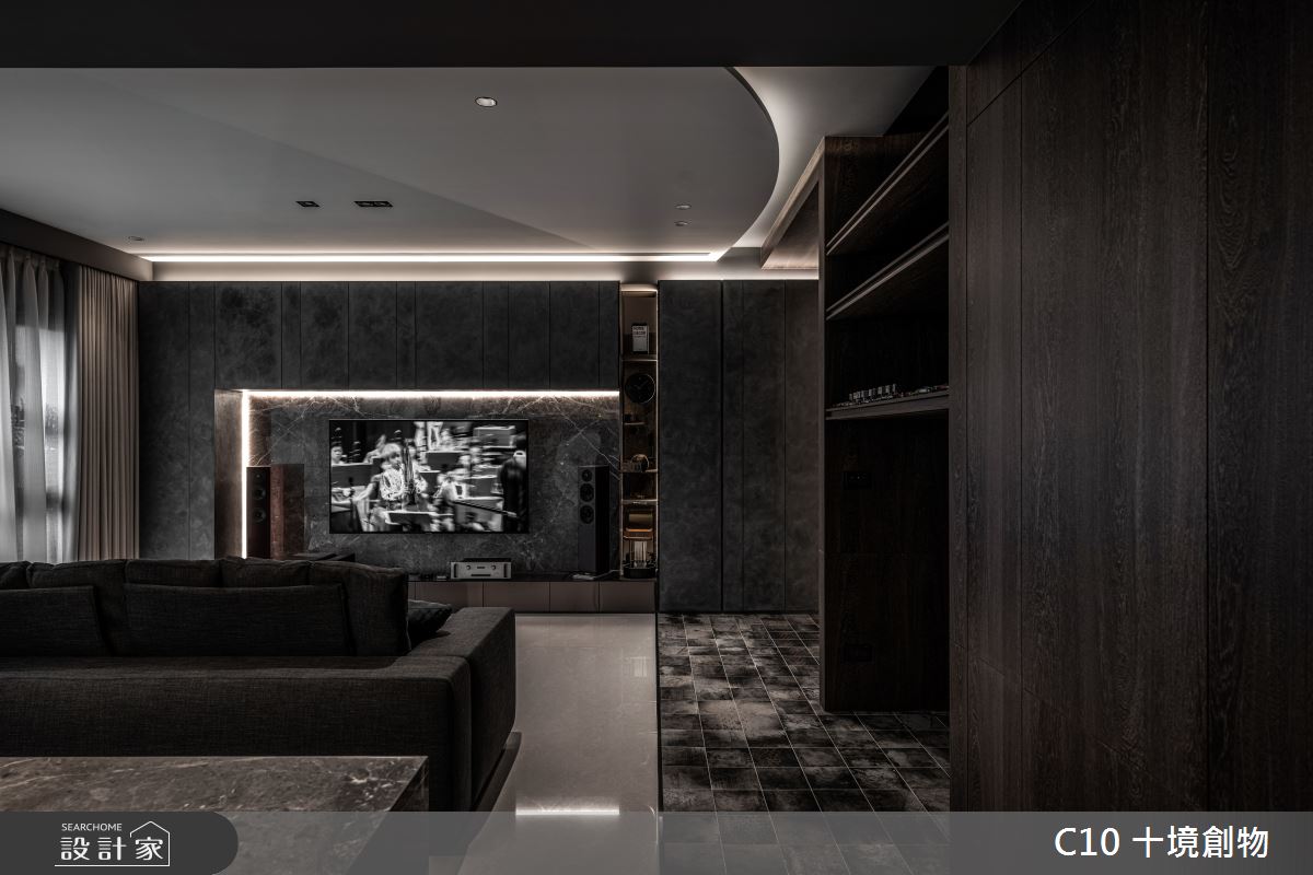 C10 十境創物以礦物塗料、黑鐵烤漆、超耐磨地板、大理石、雞翅木、木皮的搭配應用,呈現現代風居家氛圍,將此間37坪、四房、單層、新成屋(5年以下)打造成舒適愜意的家庭空間,完成2位大人、2位小孩全家人的夢想之居。