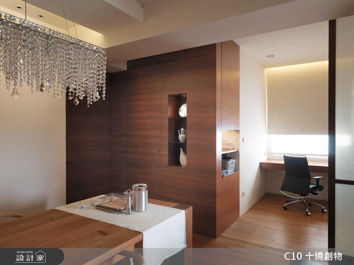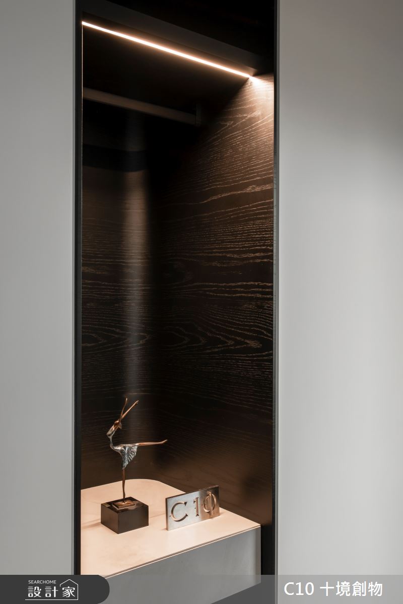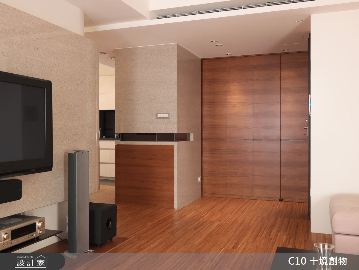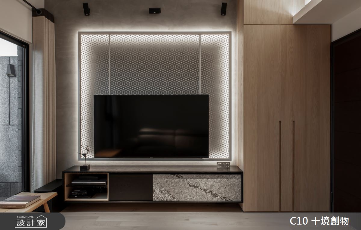 從70坪住宅移居至20坪空間,從成家至子女成長、開散葉,再度回歸兩人生活。屋主夫妻倆對空間的要求格外簡明,讓一切回歸自然質樸的生活原味。 保留天花板的挑高,捨棄浮誇的裝飾,以純粹自然的木石紋理為基調,並大膽嘗試置入輕工業風元素,讓與時俱進的都會風貌,納入成為空間的一部分。 電視牆以白色的鐵件網架,以柔和的燈光襯托,帶出漂浮的意象,柔化剛硬的線條,更符合居家空間的溫暖調性。鮮明的石材紋理,從客廳電視櫃的局部延續至餐廚區吧檯,彰顯自然元素,再利用木質櫃體、木地板肌理與之呼應,提升空間暖度。吧檯區以精鍊的比例設置吊櫃,減輕量體壓迫感,同時滿足實用收納機能。 清水模板材門片與立面,巧妙呼應客廳鐵件網架的輕工業風元素,帶出現代風格的素樸質感。 灰、白、木紋色彩,建構空間的主色調,不僅公共區如此,私領域臥房也延續相同色彩規劃。其中深色木紋開放式衣物吊掛櫃,刻意採弧形設計,展現細緻的工匠技藝,讓寢居空間調性變得更柔和。 全屋以簡約俐落的線條,搭配現代而不施溫暖的色彩,僅以女主人畫作當作餐桌主牆裝飾,彰顯個人特質,讓整體空間更能感受到量身訂製的獨特氛圍。(文字提供:十境創物)