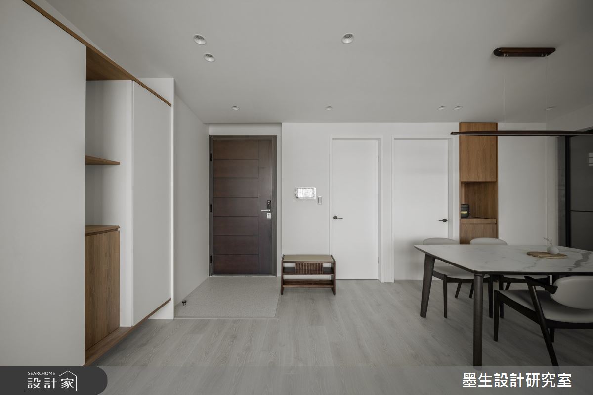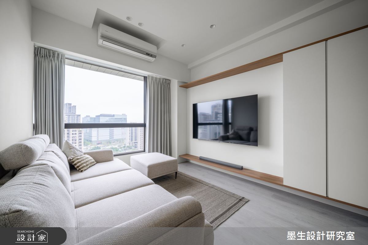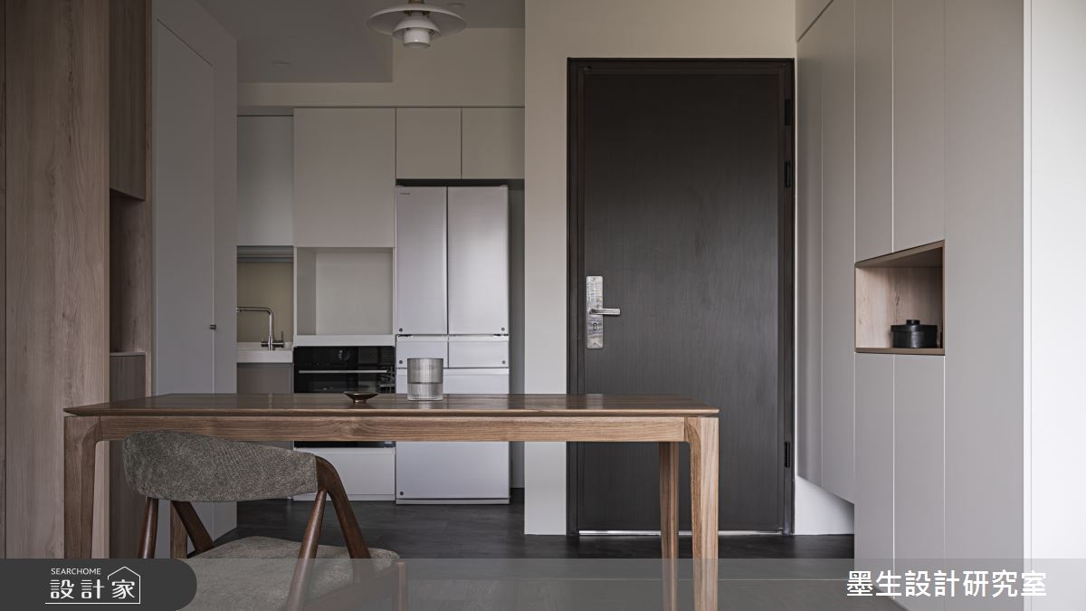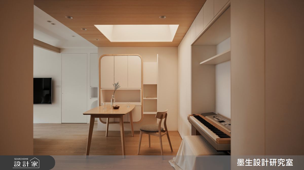 墨生設計研究室以木皮、系統板材、鏡面、美耐板的搭配應用,呈現現代風居家氛圍,將此間16坪、三房、單層、新成屋(5年以下)打造成舒適愜意的家庭空間,完成2位大人、1位小孩全家人的夢想之居。