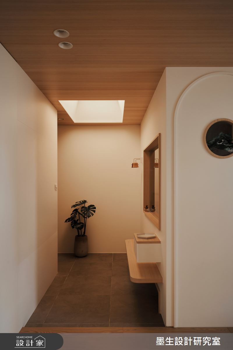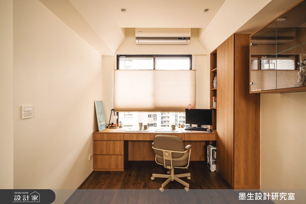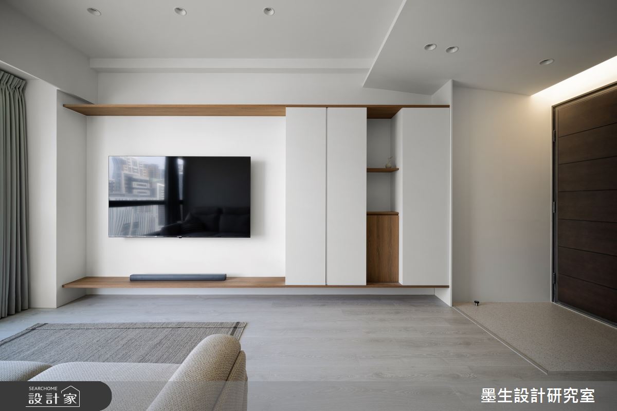 墨生設計研究室以木皮、系統板材、鏡面、美耐板的搭配應用,呈現現代風居家氛圍,將此間16坪、三房、單層、新成屋(5年以下)打造成舒適愜意的家庭空間,完成2位大人、1位小孩全家人的夢想之居。