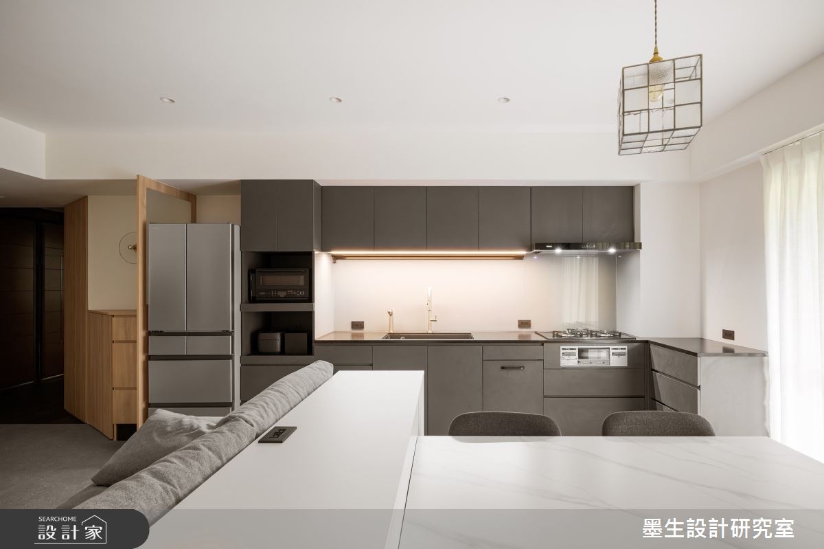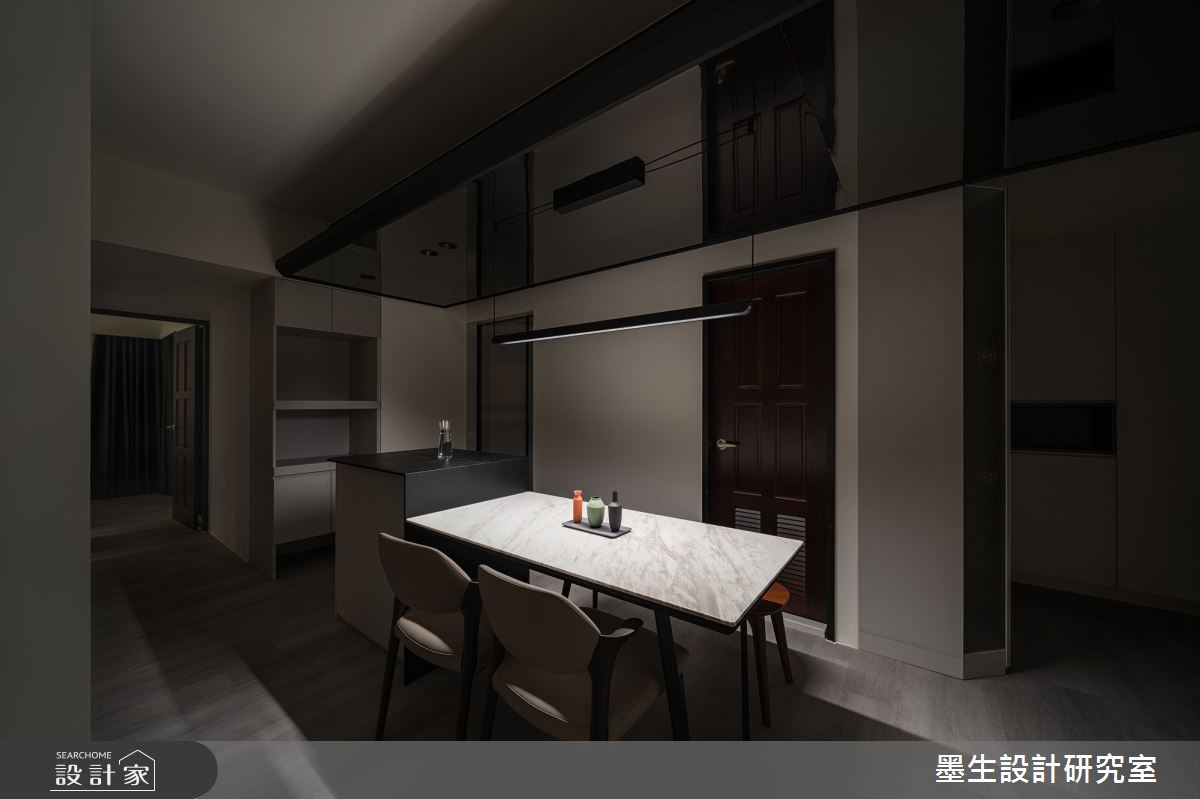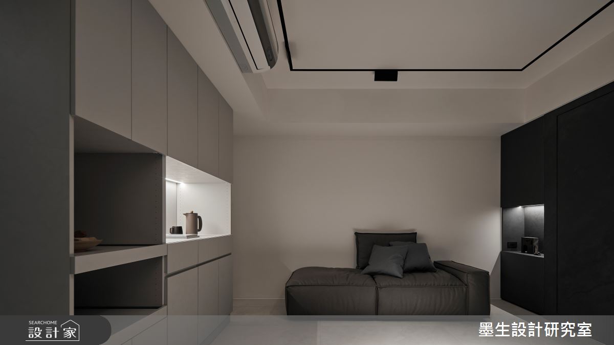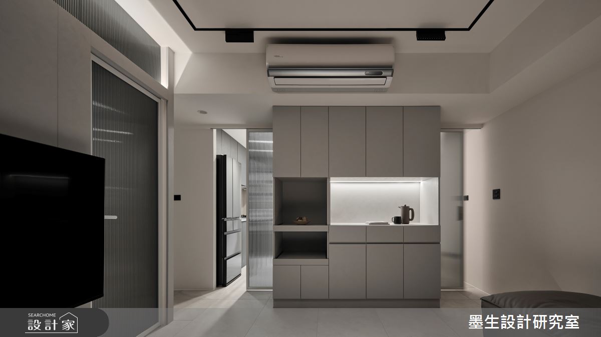 來自墨生設計研究室的13坪現代風住宅案,屋主一家人共有2位大人,是一間單層新成屋(5年以下)的兩房格局,設計師藉由建材以灰鏡、磁磚、特殊塗料、系統櫃、灰長虹玻璃、燈帶、天際線(燈具)、燈箱的搭配應用,實現一家人的理想生活。