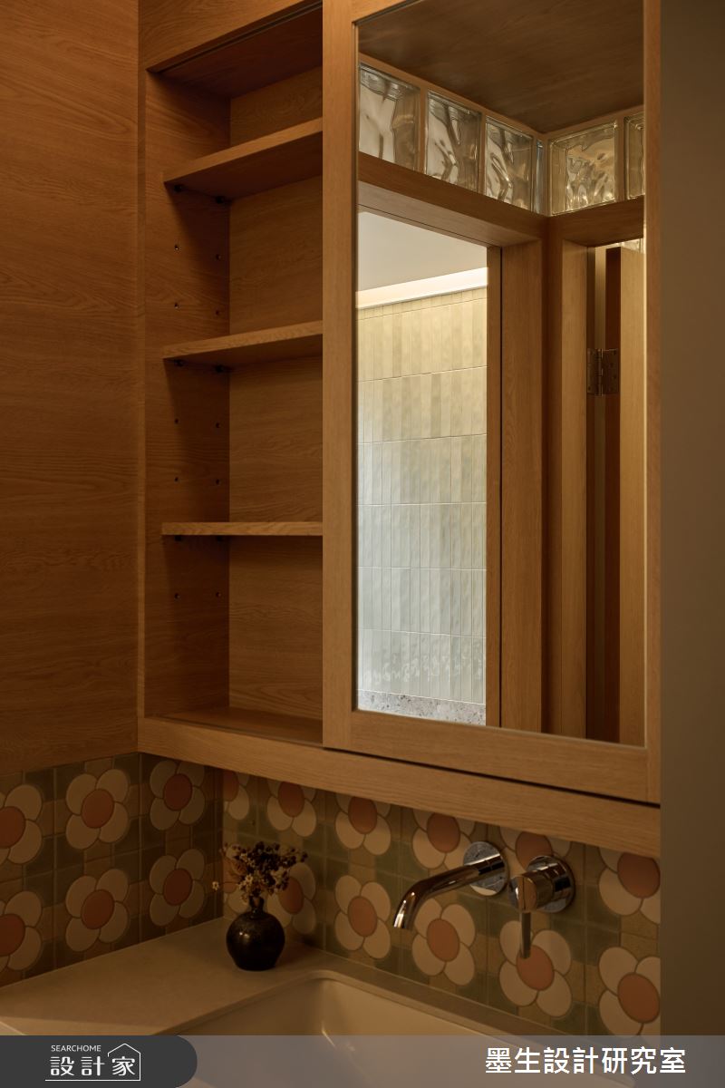 墨生設計研究室以乳膠漆、馬賽克磁磚、磁磚、樺木夾板、訂製手工磚、水波紋玻璃、鐵件、系統櫃、間接照明、烤漆、玻璃磚、美耐板、超耐磨地板、崁燈的搭配應用,呈現混搭風居家氛圍,將此間28坪、三房、單層、老屋(50年以上)打造成舒適愜意的家庭空間,完成2位大人全家人的夢想之居。