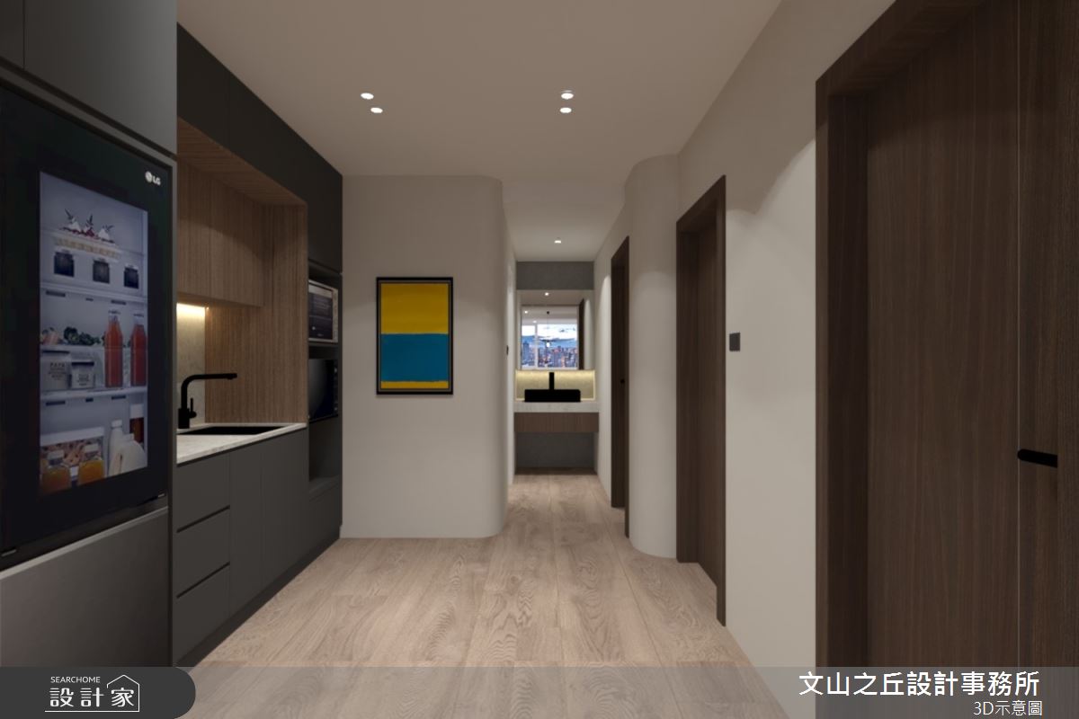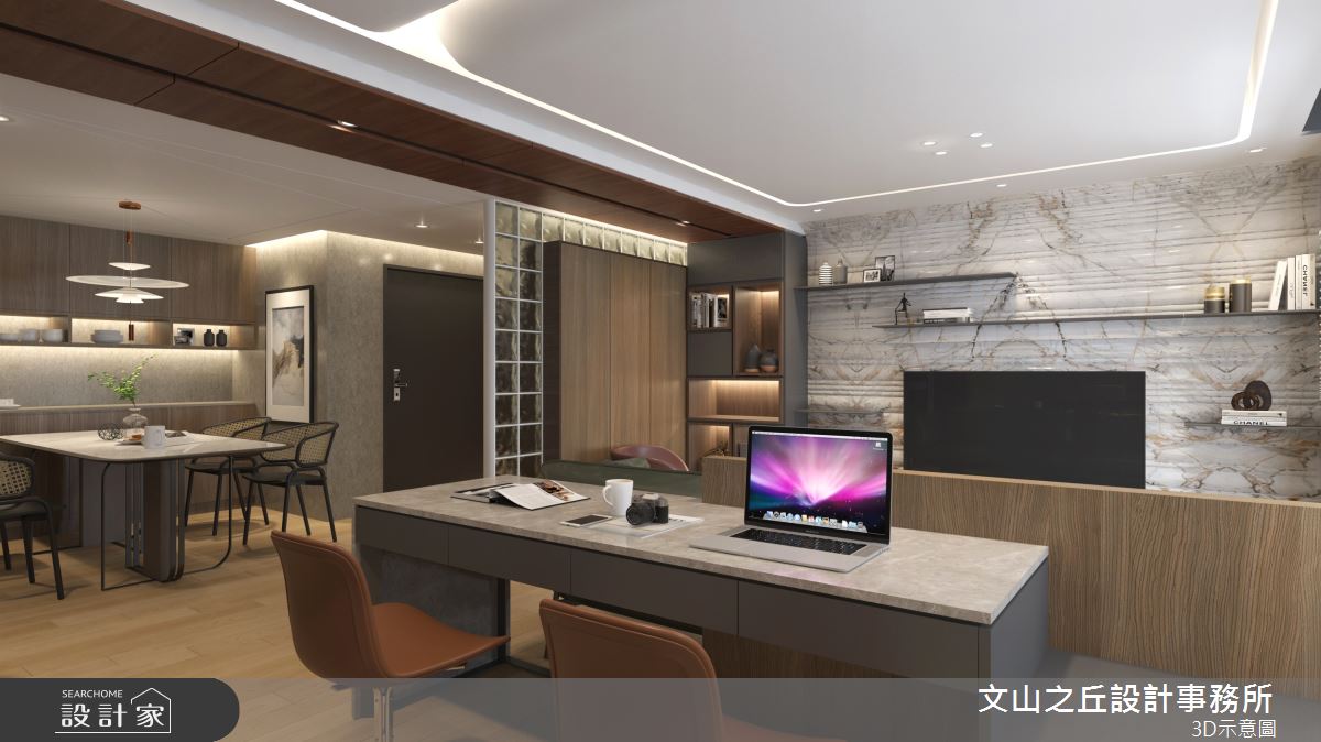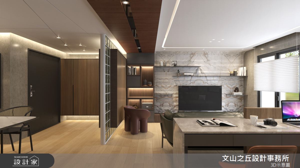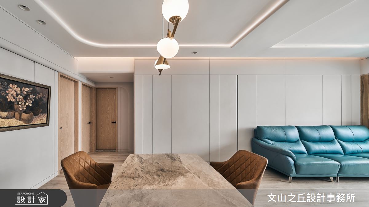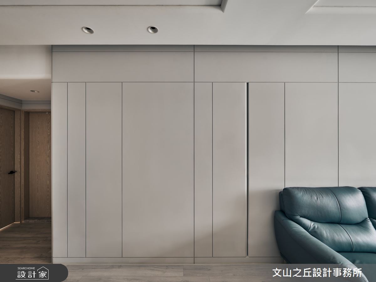 由文山之丘設計事務所精心規劃的35坪三房住宅空間,家庭成員一共有2位大人、2位小孩。因應屋主需求,設計師運用現代風作為主軸,搭配乳膠漆、海島型木地板、石英磚/拋光石英磚、鐵件、鍍鈦金屬、木作貼皮、系統板材、大理石、水泥/水泥粉光、人造石、軌道燈,打造全家人的夢想家居。