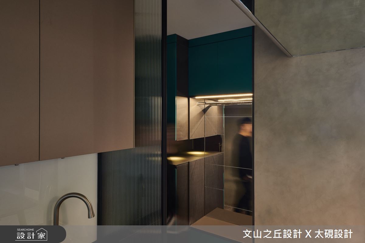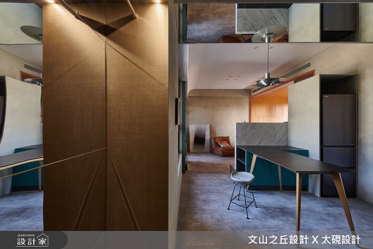 文山之丘設計事務所以乳膠漆、六角磚/蜂巢磚、超耐磨木地板、鍍鈦金屬、木作貼皮、樂土、人造石的搭配應用,呈現混搭風居家氛圍,將此間10坪、一房、套房、中古屋(5~15年)打造成舒適愜意的家庭空間,完成2位大人全家人的夢想之居。
