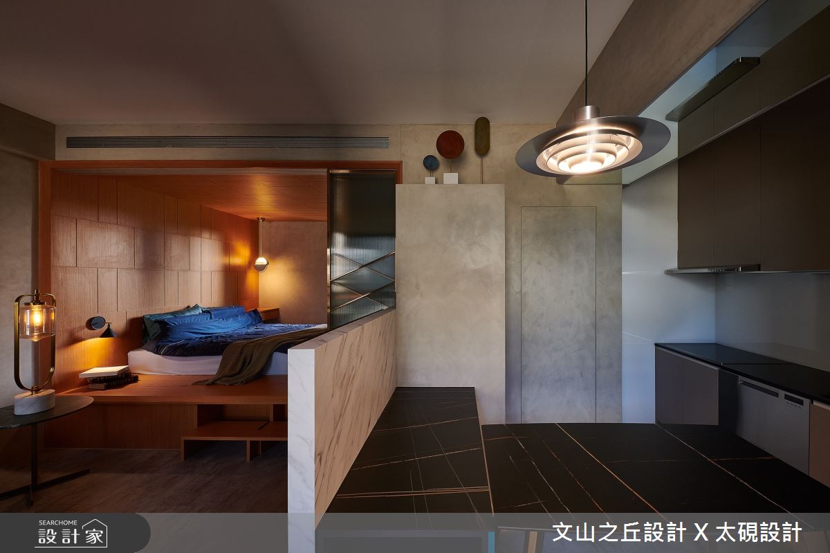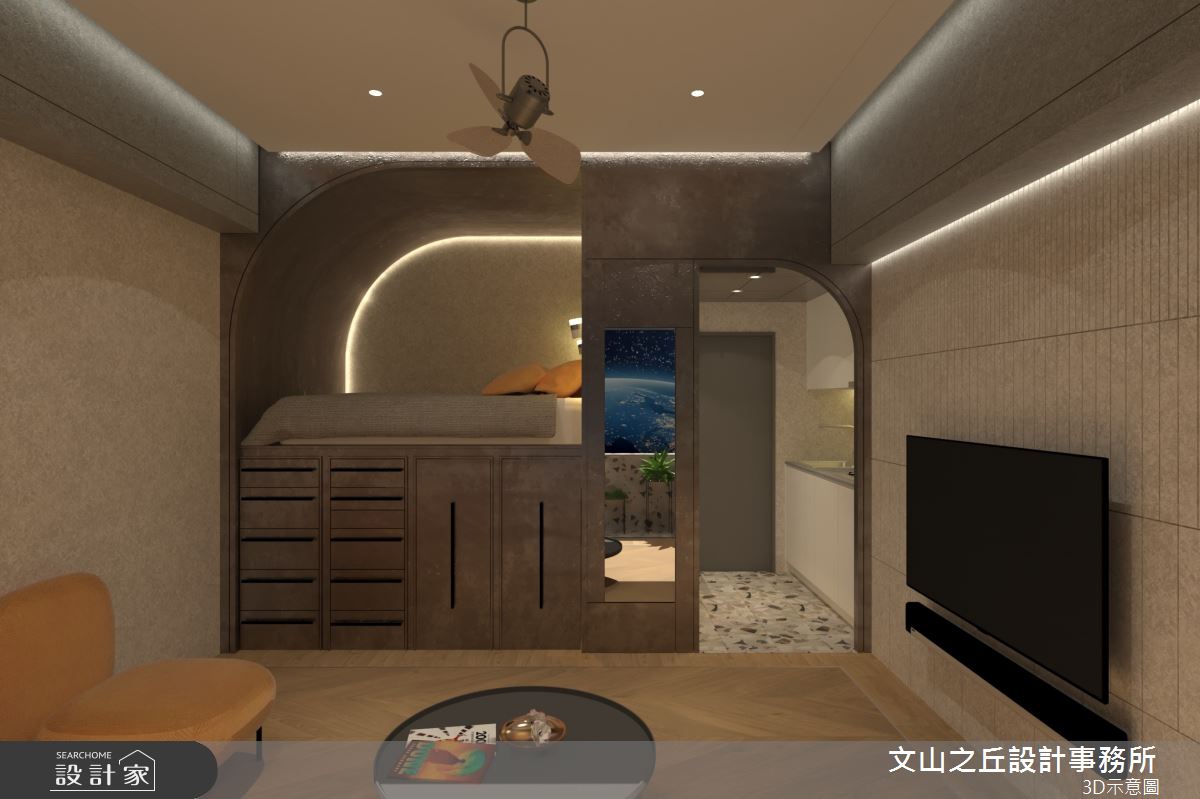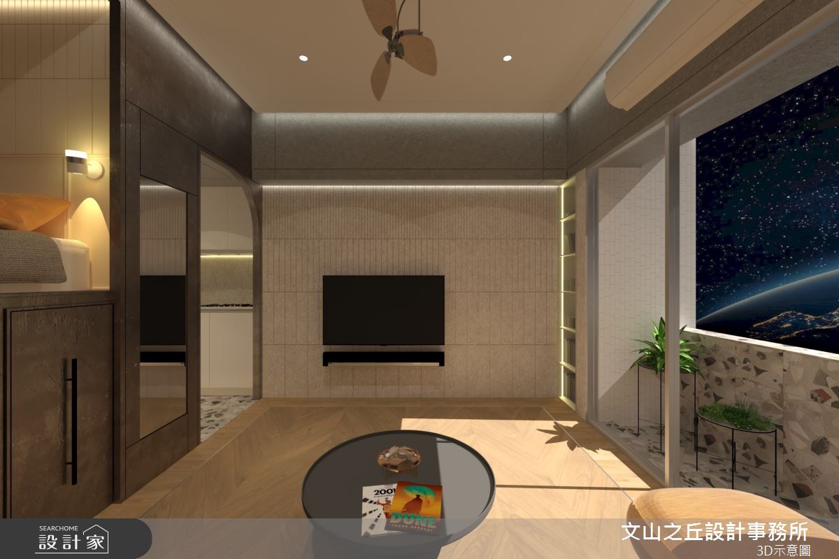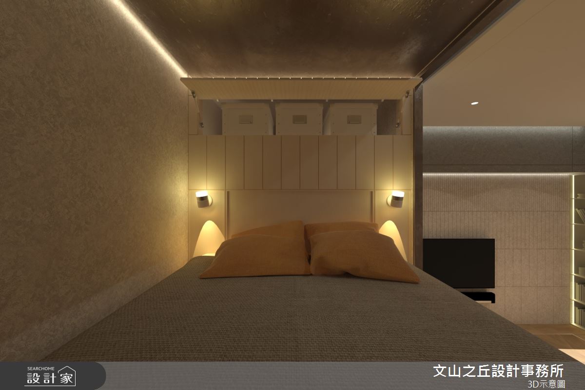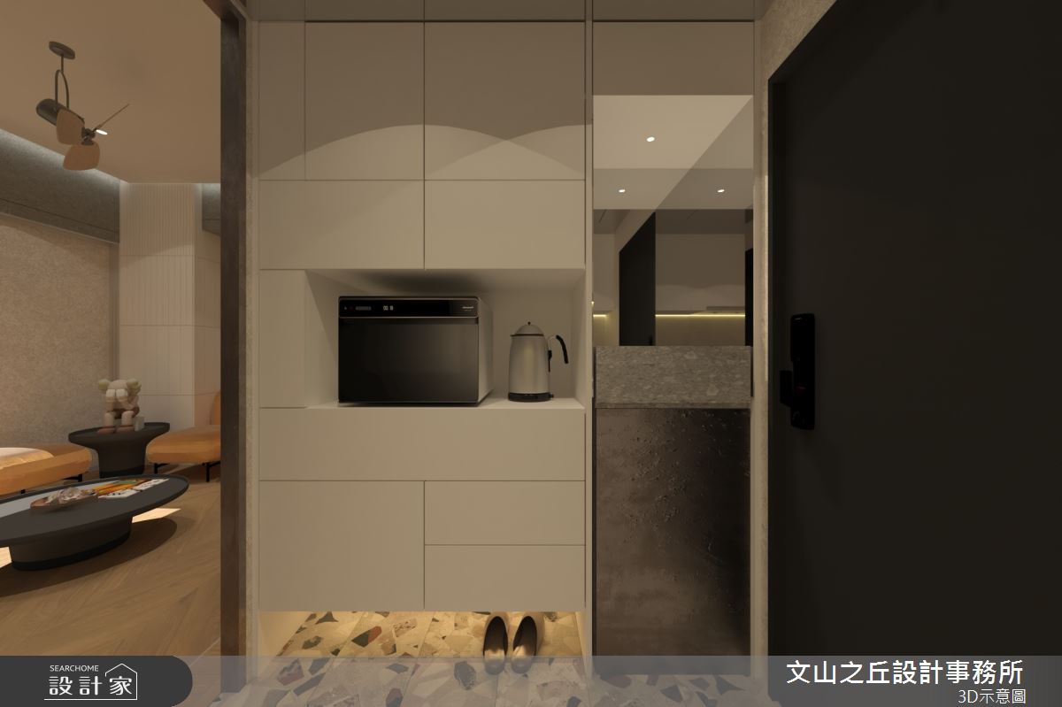 本案為文山之丘設計事務所的8坪混搭風新成屋(5年以下)設計作品,格局為套房一房的居住空間。居住成員包含1位長輩。全室建材的搭配,應用乳膠漆、超耐磨木地板、鐵件、木作貼皮、系統板材、水泥/水泥粉光、人造石,展現溫馨的居家氛圍。