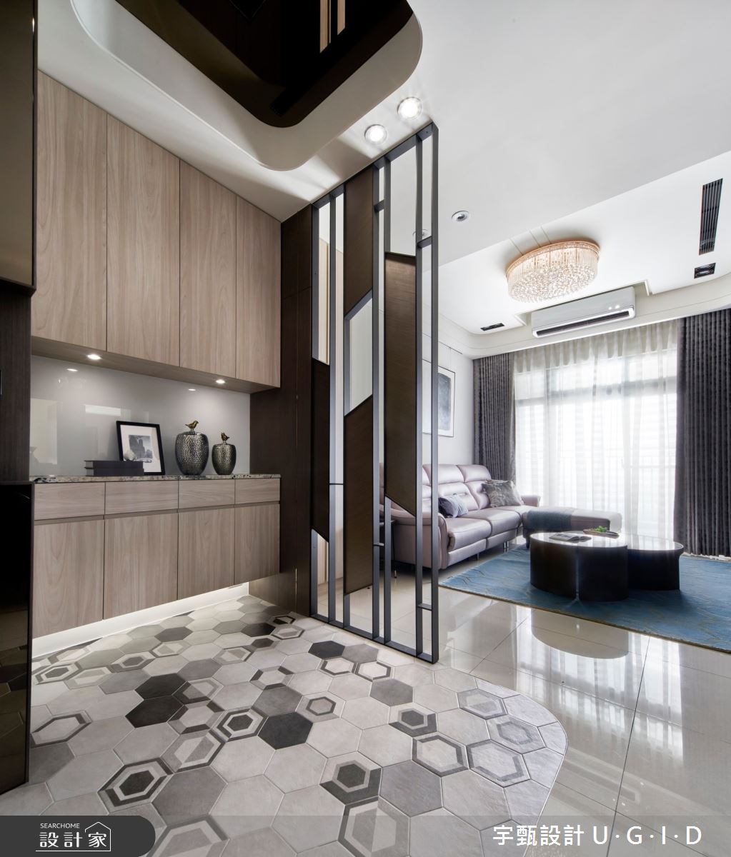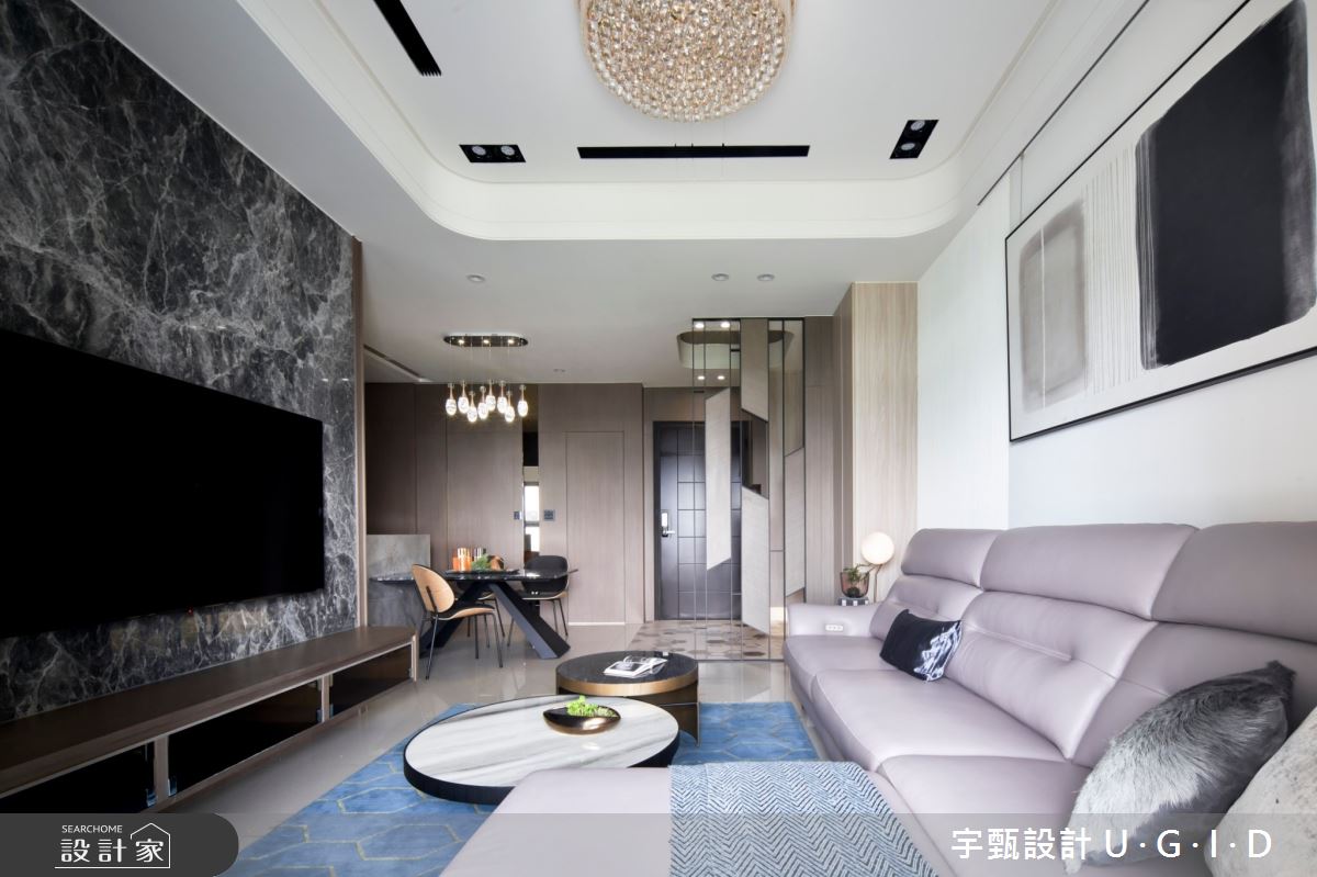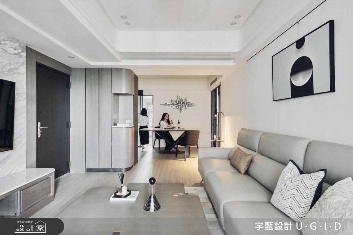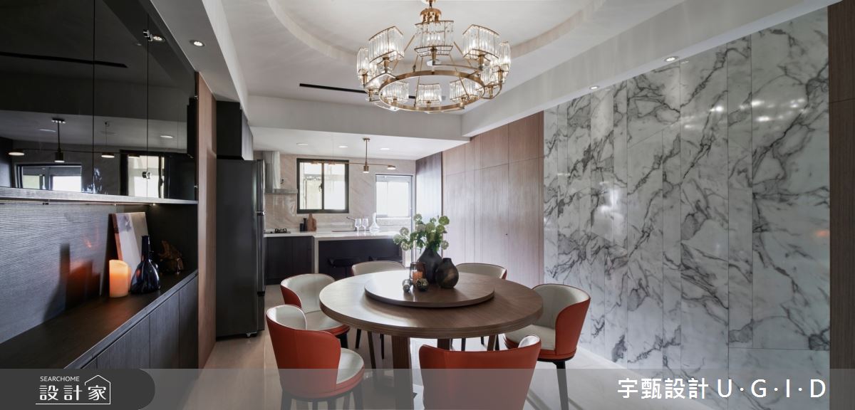 由宇甄設計 U.G.I.D精心規劃的36坪三房住宅空間,家庭成員一共有3位大人、1位小孩。因應屋主需求,設計師運用現代風作為主軸,搭配超耐磨木地板、大理石、花崗石、實木皮板、茶鏡、跳色漆,打造全家人的夢想家居。