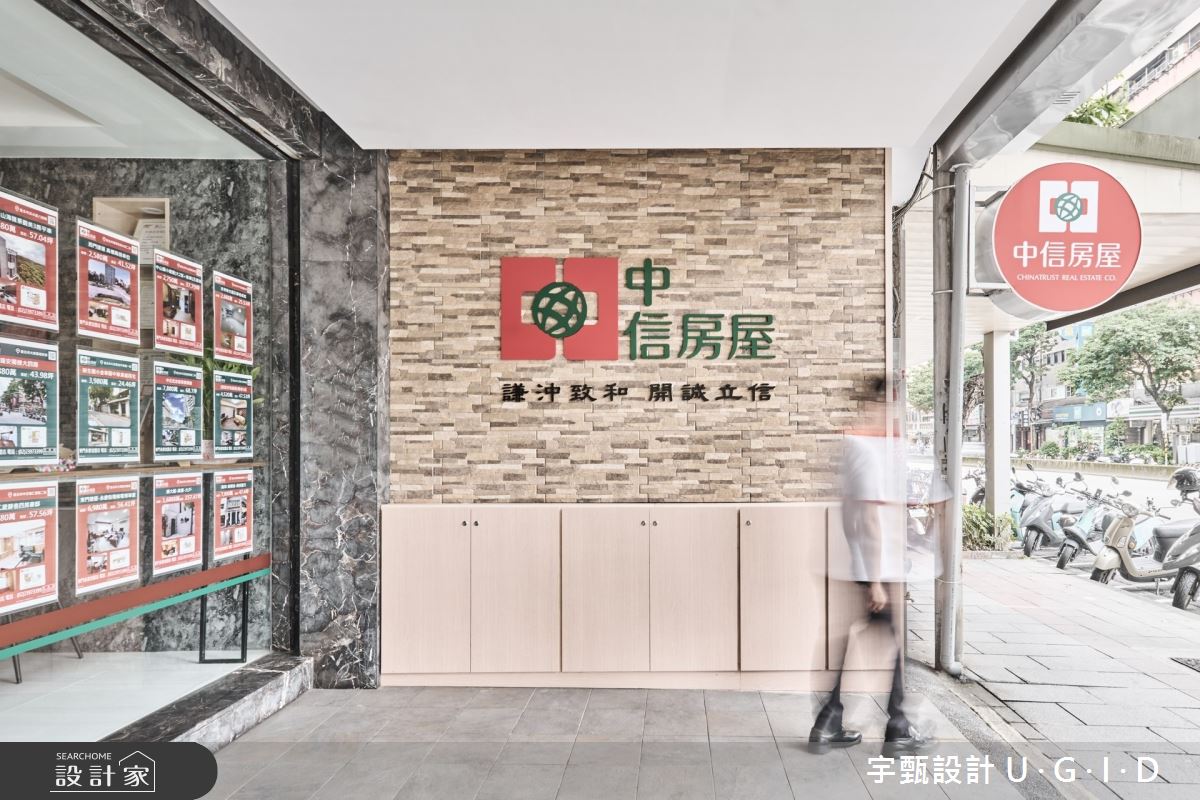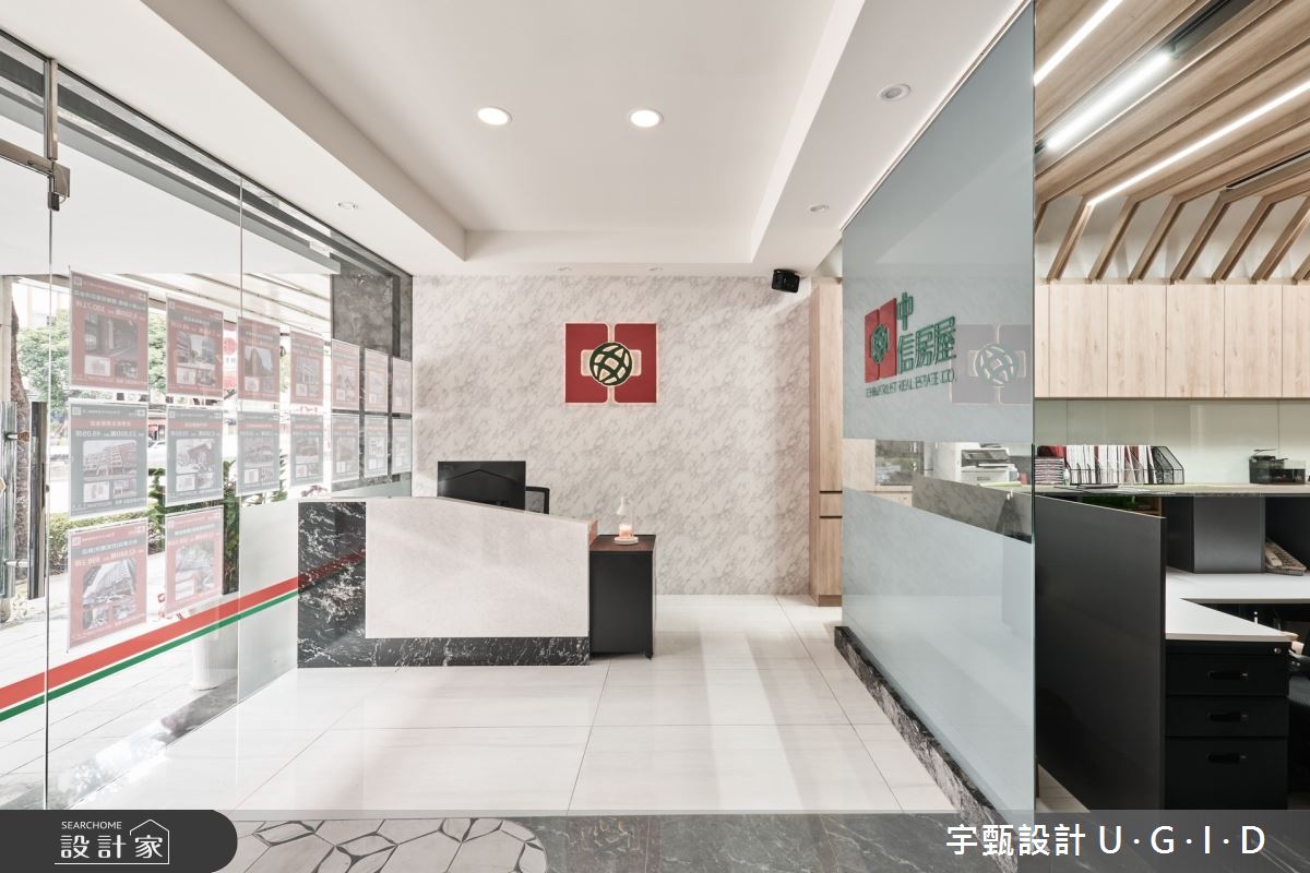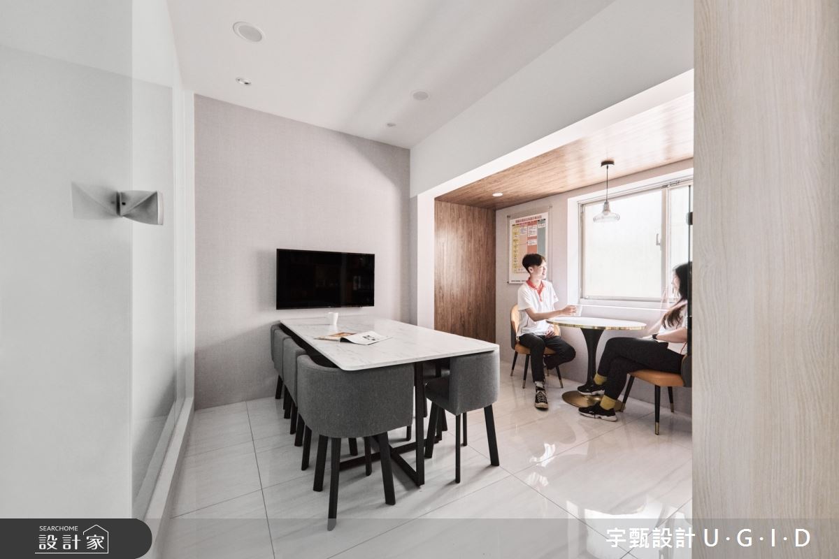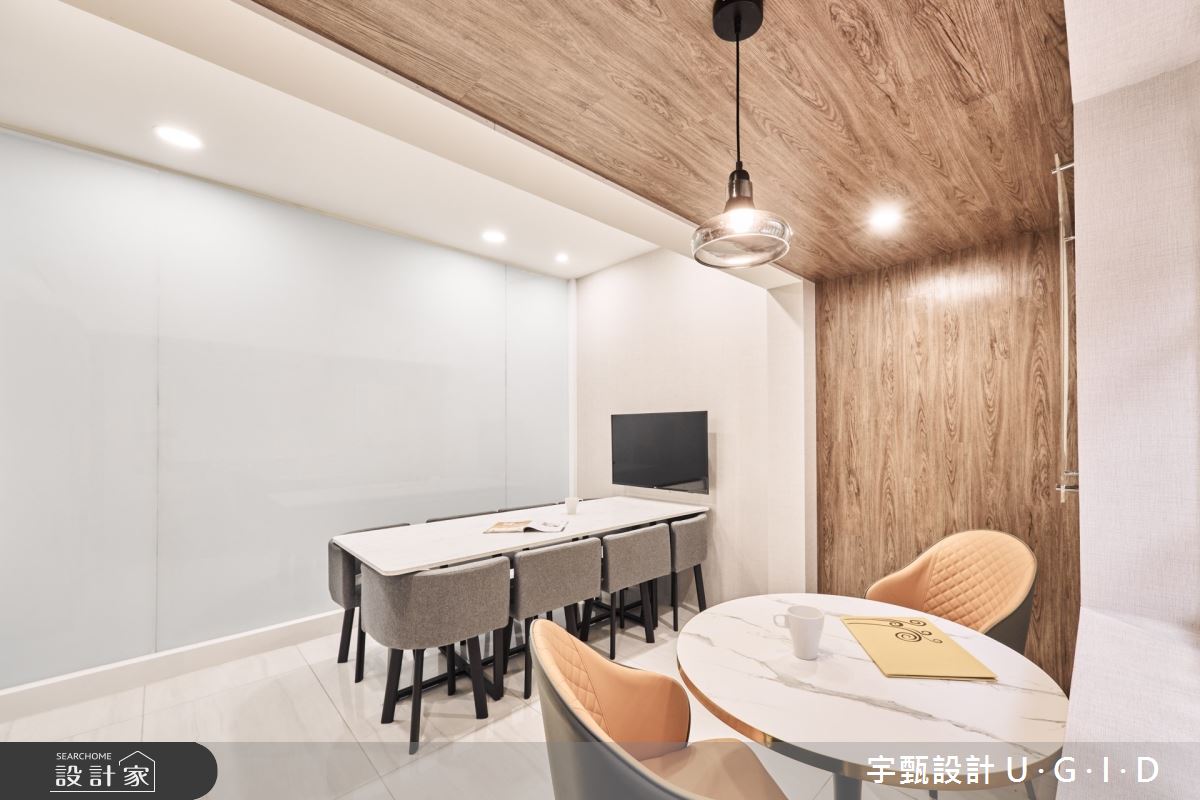 宇甄設計 U.G.I.D以拋光石英磚、大理石、金屬件、矽酸鈣板、烤漆玻璃、系統櫃的搭配應用,呈現現代簡約風的風格氣息,將此間28坪老屋(16~30年)優雅詮釋成舒適愜意的商業空間。