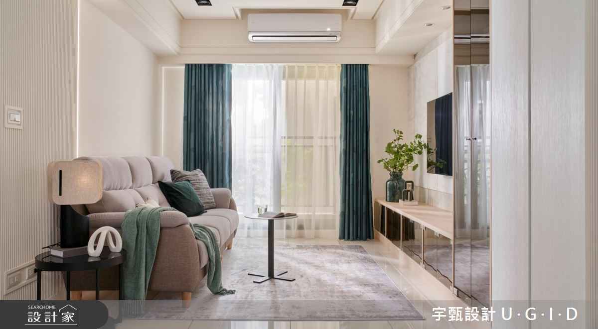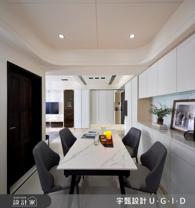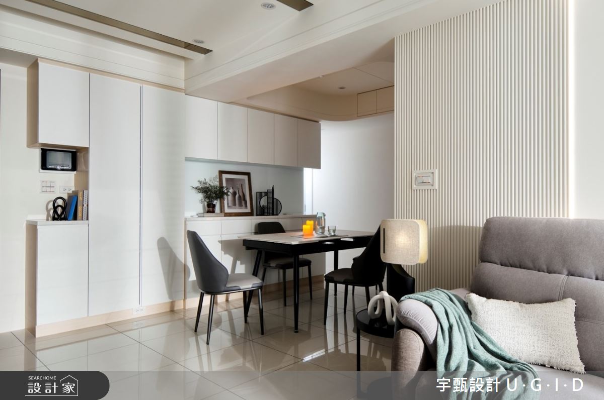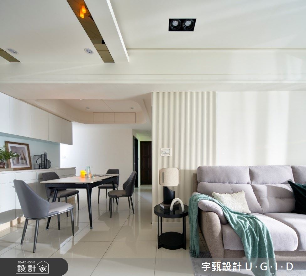 宇甄設計 U.G.I.D以茶玻、烤漆、大理石、實木皮、造型線板、還原漆的搭配應用,呈現現代風居家氛圍,將此間20坪、三房、單層、新成屋(5年以下)打造成舒適愜意的家庭空間,完成2位大人、1位小孩全家人的夢想之居。