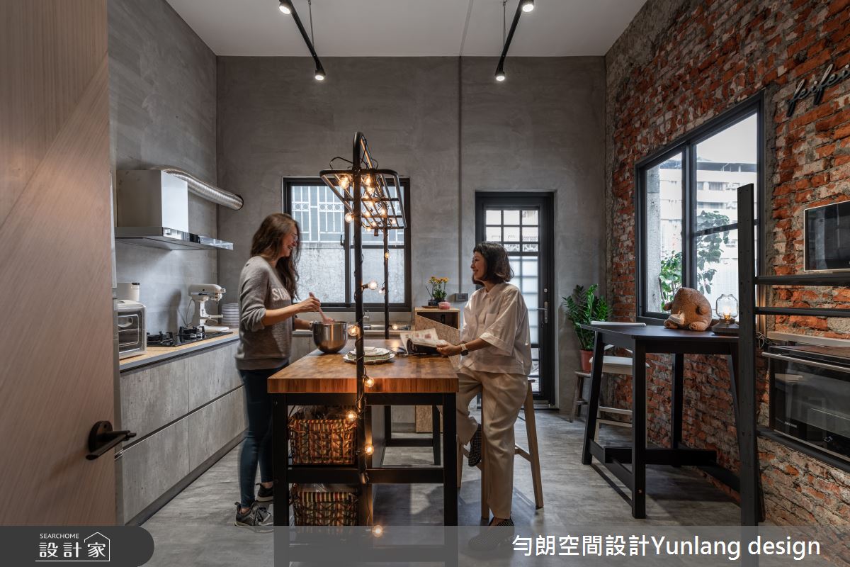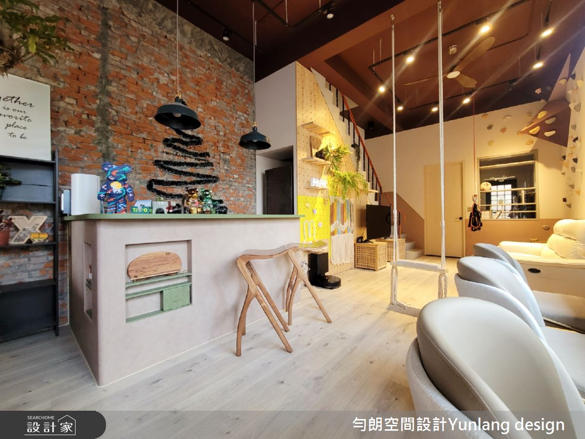 勻朗空間設計以花磚、超耐磨木地板、木紋磚、PVC地板、明鏡、小冰柱玻璃、系統板材、磁磚、水泥/水泥粉光的搭配應用,呈現工業風居家氛圍,將此間40坪、商業空間、複層、老屋(31~40年)打造成舒適愜意的家庭空間,完成1位大人、1位小孩全家人的夢想之居。