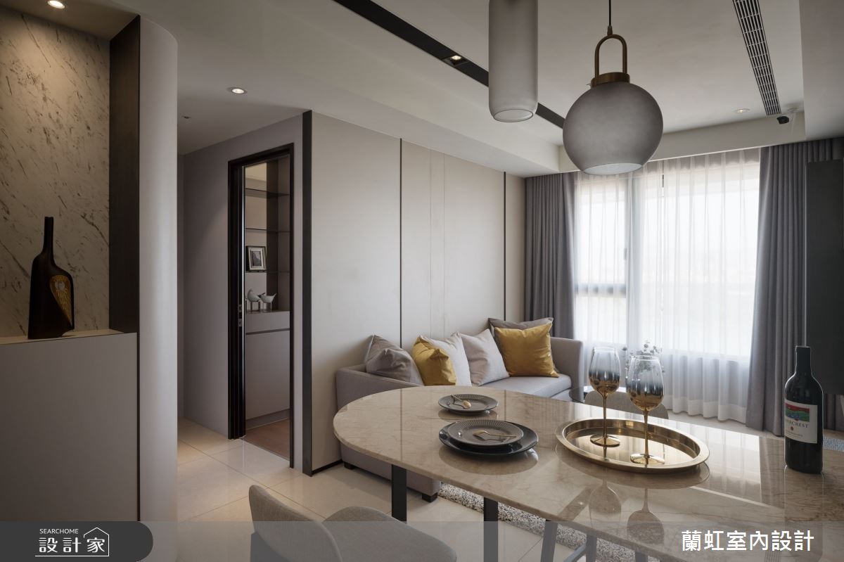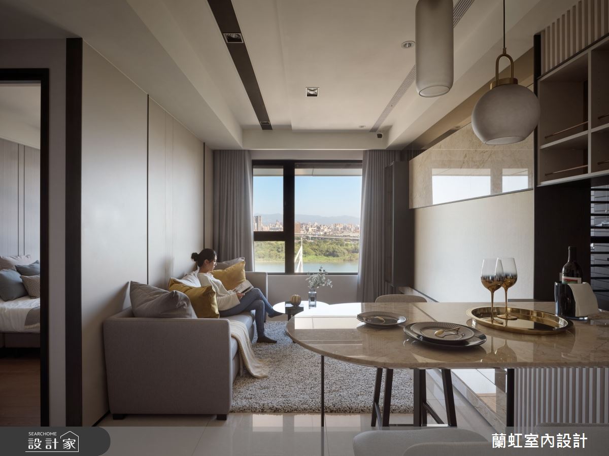 蘭虹設計以油漆、乳膠漆、壁紙、超耐磨木地板、石英磚/拋光石英磚、鐵件、灰鏡、木作貼皮、烤漆、系統板材、大理石、皮革、石材的搭配應用,呈現現代風居家氛圍,將此間35坪、兩房、單層、新成屋(5年以下)打造成舒適愜意的家庭空間,完成2位大人全家人的夢想之居。