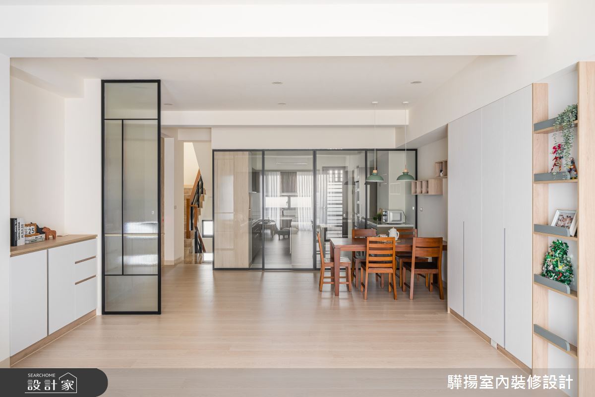 來自驊揚室內裝修設計的65坪現代風住宅案,屋主一家人共有2位大人、2位小孩,是一間透天別墅新成屋(5年以下)的五房格局,設計師藉由建材以油漆、乳膠漆、超耐磨木地板、系統板材、推拉門、格柵門、系統板、小冰柱的搭配應用,實現一家人的理想生活。