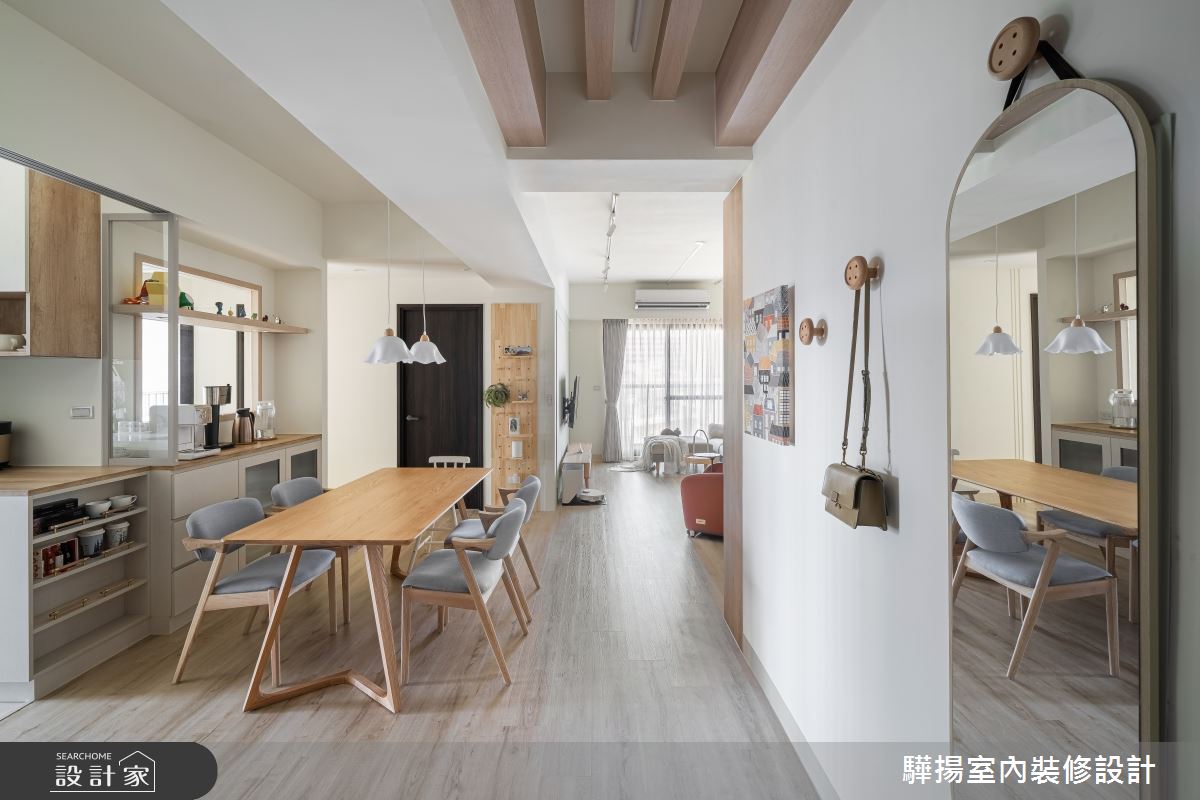 來自驊揚室內裝修設計的35.3坪混搭風住宅案,屋主一家人共有2位大人、1位小孩,是一間複層新成屋(5年以下)的四房格局,設計師藉由建材以油漆、乳膠漆、超耐磨木地板、系統板材、木百葉、平條玻璃、批批板、鋁框推拉門的搭配應用,實現一家人的理想生活。