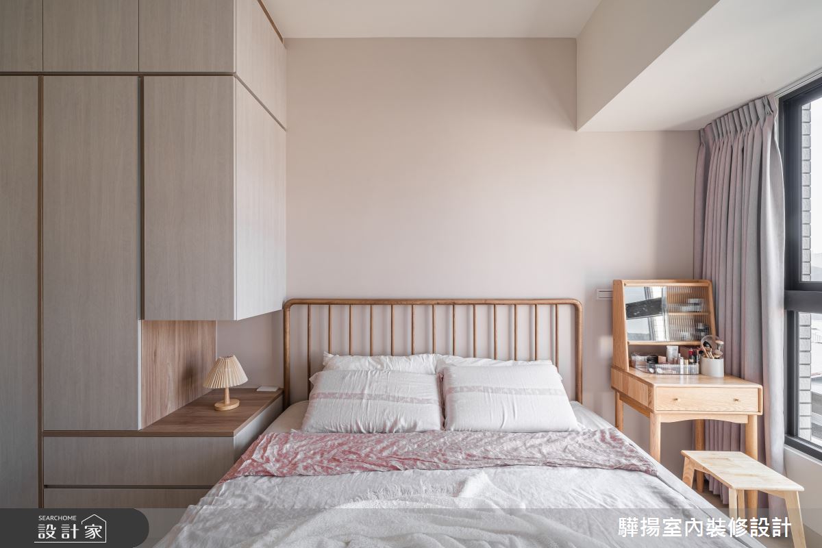 驊揚室內裝修設計以木地板、木質洞洞板的搭配應用,呈現日式風居家氛圍,將此間20坪、四房、單層、新成屋(5年以下)打造成舒適愜意的家庭空間,完成2位大人、1位小孩全家人的夢想之居。