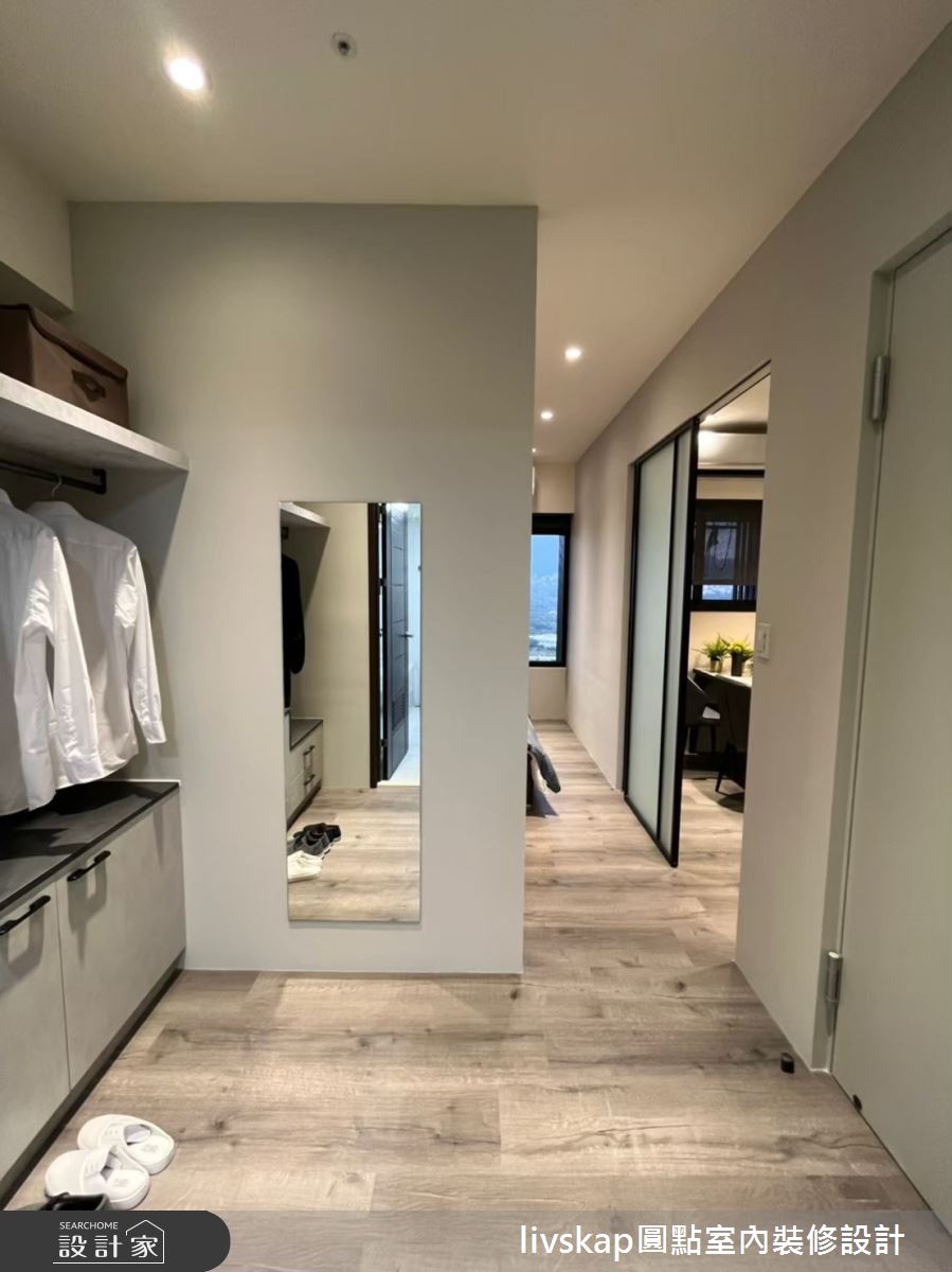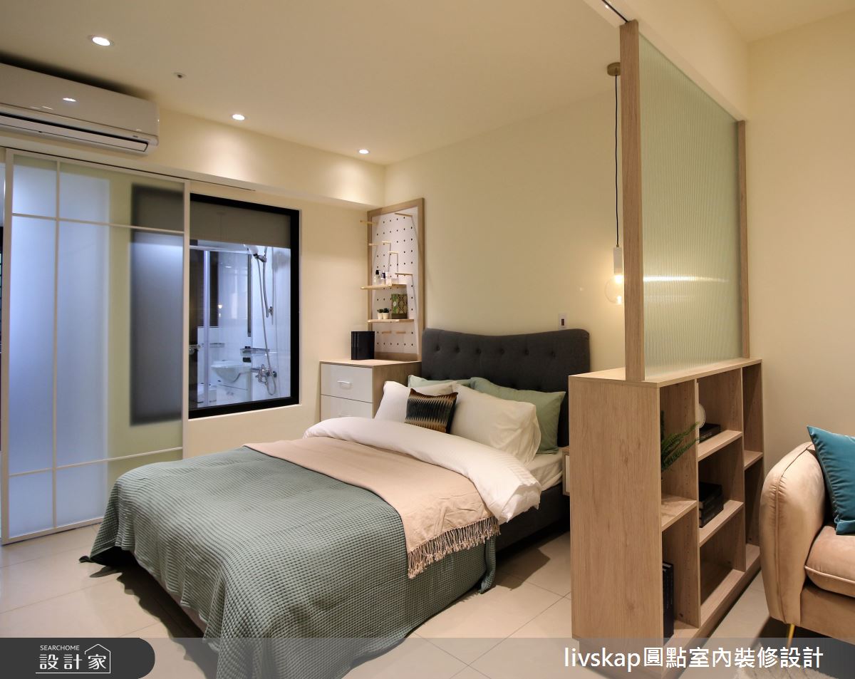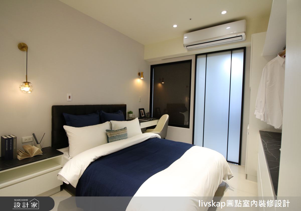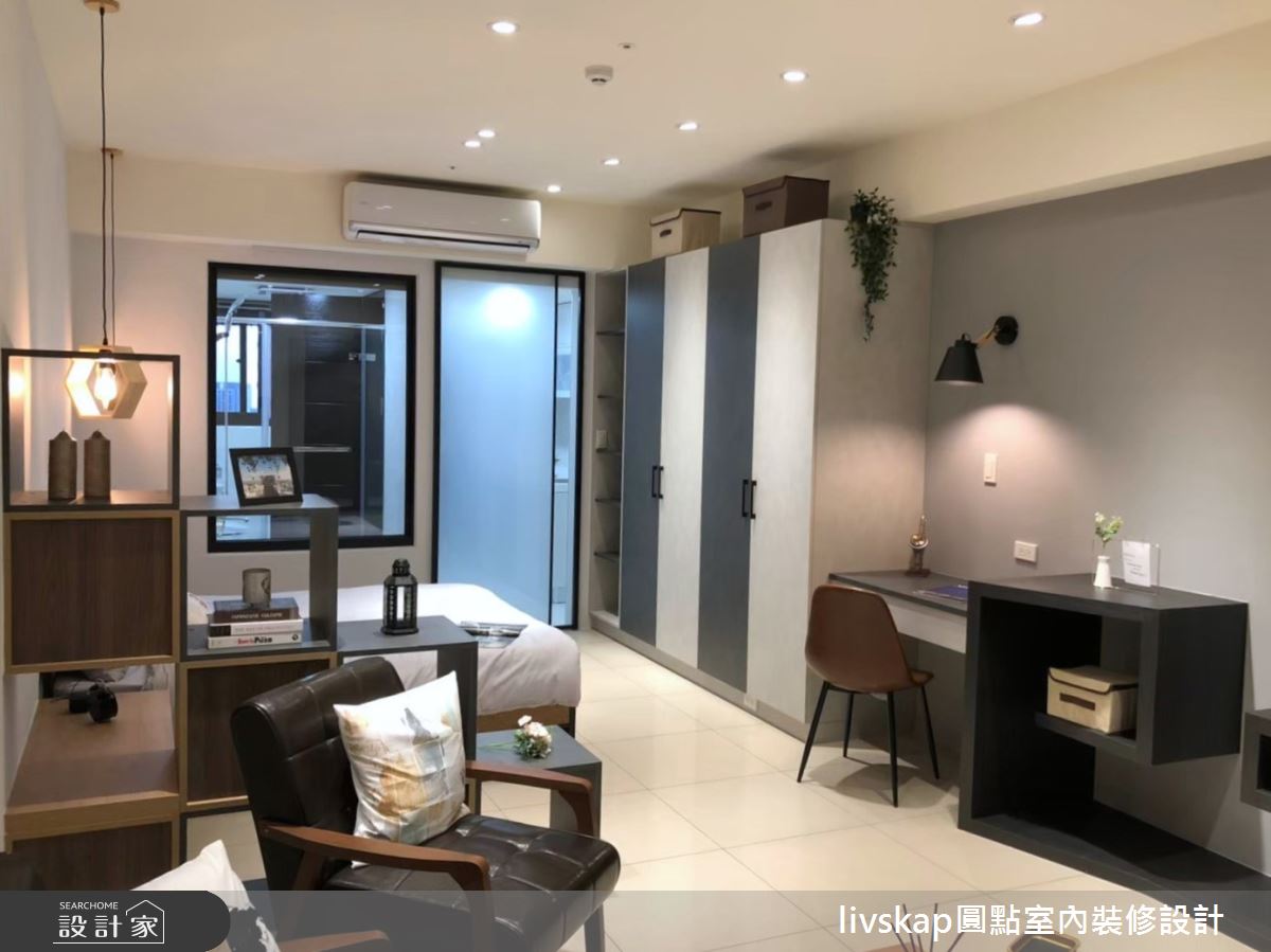 圓點室內裝修國際有限公司以乳膠漆、石英磚/拋光石英磚、鐵件、系統板材、噴砂玻璃的搭配應用,呈現簡約風居家氛圍,將此間10坪、一房、套房、新成屋(5年以下)打造成舒適愜意的家庭空間,完成2位大人全家人的夢想之居。