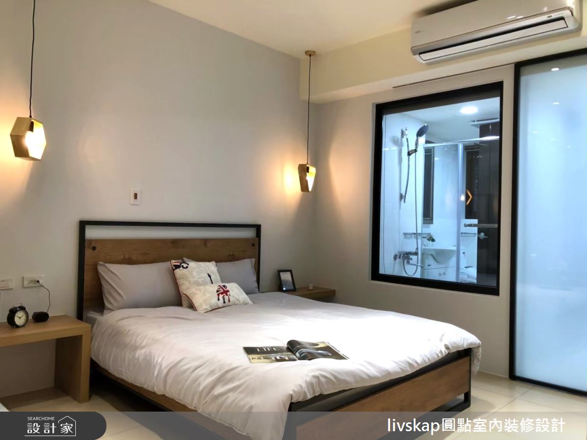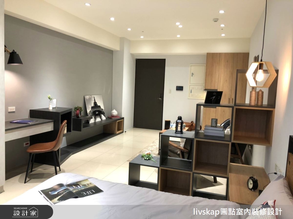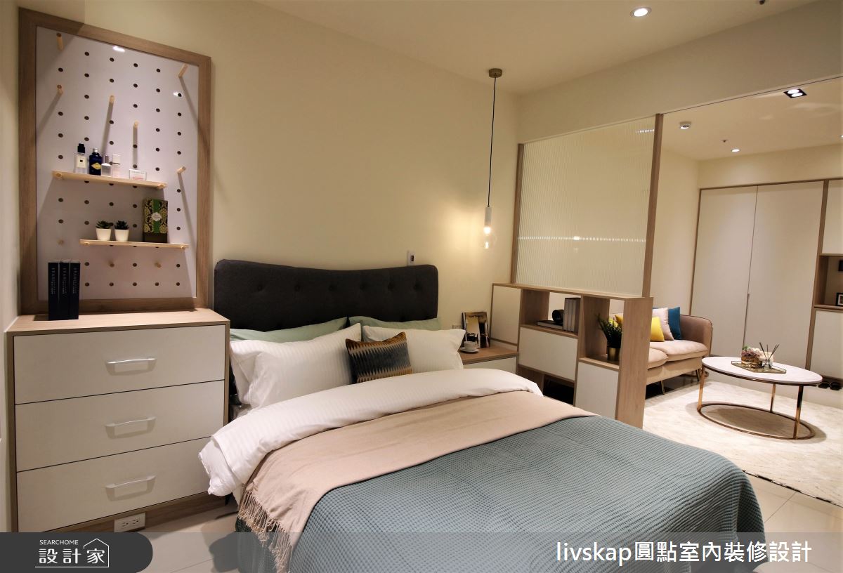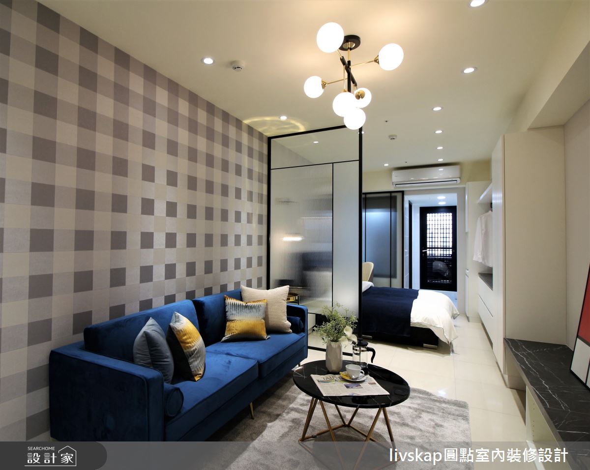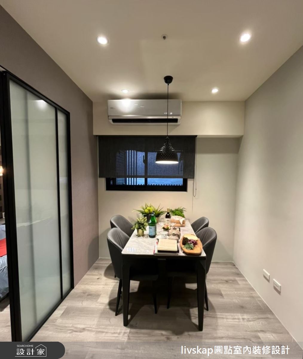 圓點室內裝修國際有限公司以乳膠漆、石英磚/拋光石英磚、鐵件、系統板材、噴砂玻璃的搭配應用,呈現簡約風居家氛圍,將此間10坪、一房、套房、新成屋(5年以下)打造成舒適愜意的家庭空間,完成2位大人全家人的夢想之居。