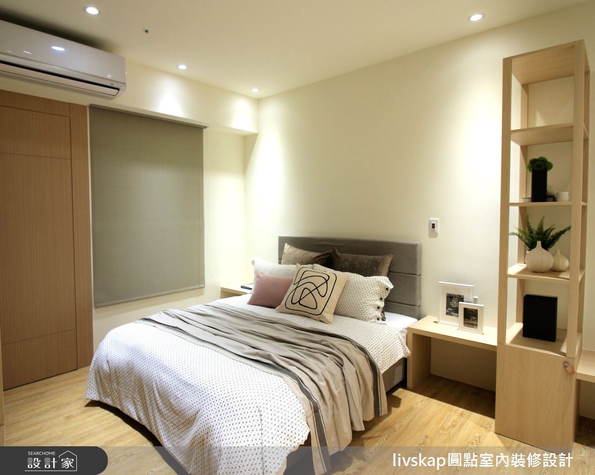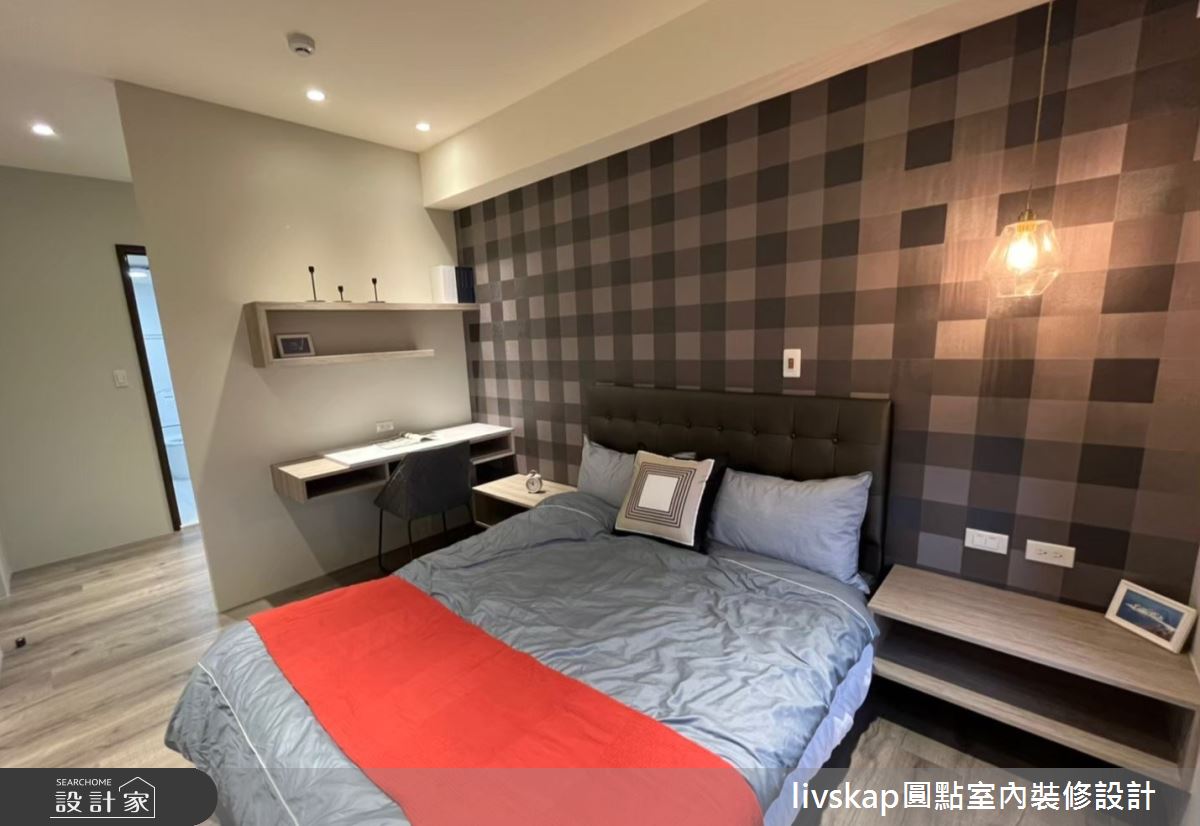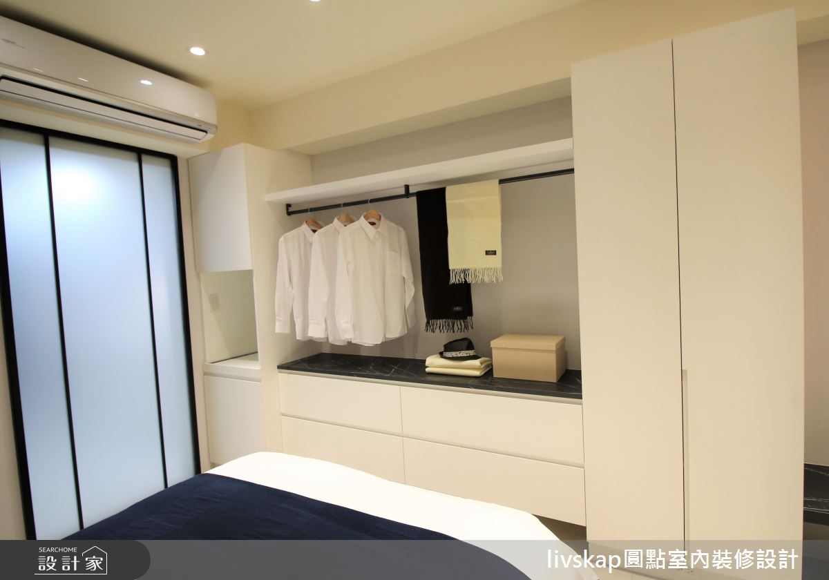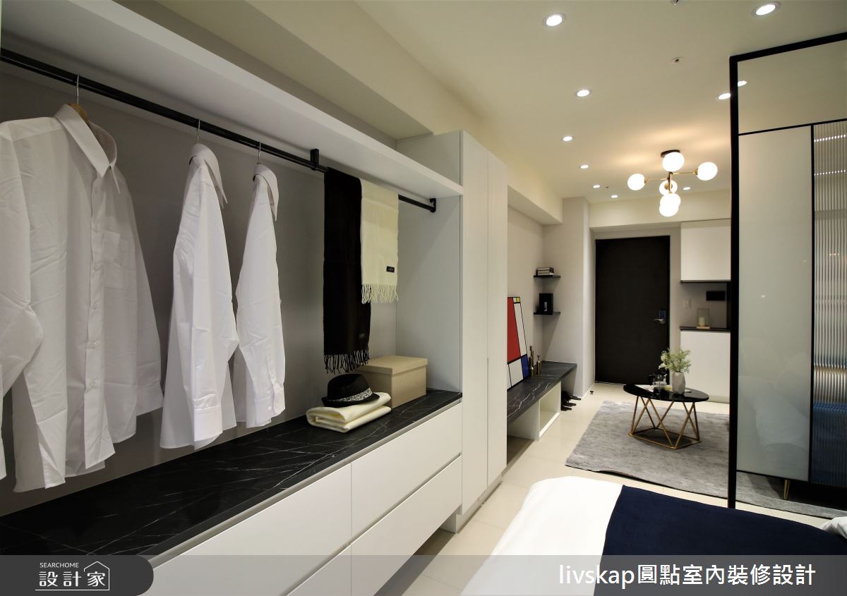 圓點室內裝修國際有限公司以乳膠漆、石英磚/拋光石英磚、鐵件、系統板材、噴砂玻璃的搭配應用,呈現簡約風居家氛圍,將此間10坪、一房、套房、新成屋(5年以下)打造成舒適愜意的家庭空間,完成2位大人全家人的夢想之居。