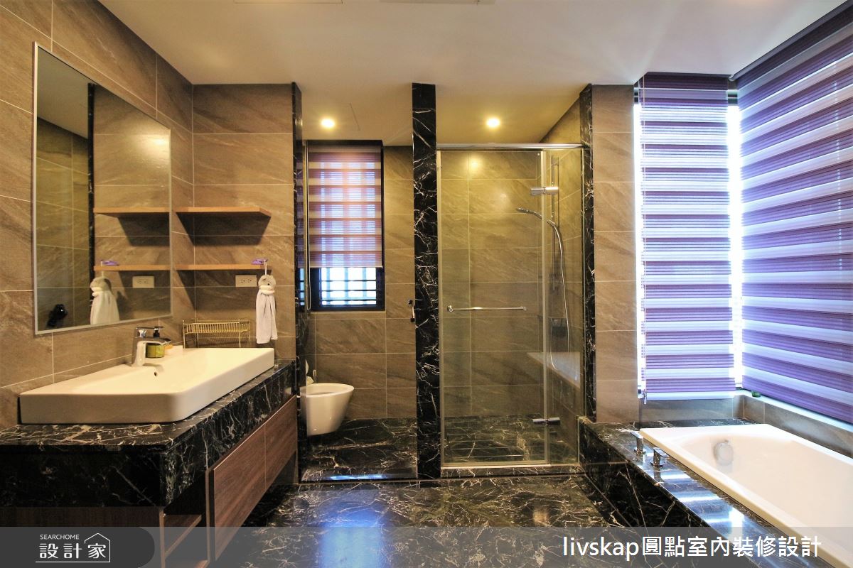 由圓點室內裝修國際有限公司精心規劃的67坪五房住宅空間,家庭成員一共有2位大人。因應屋主需求,設計師運用混搭風作為主軸,搭配乳膠漆、壁紙、木地板、石英磚/拋光石英磚、鐵件、灰鏡、茶玻、烤玻、鍍鈦金屬、木作貼皮、鋼刷木皮、系統板材、大理石、磁磚、水泥/水泥粉光、木百葉、人造石、賽麗石、軌道燈、皮革、石材、繃布、噴漆、藝術漆,打造全家人的夢想家居。
