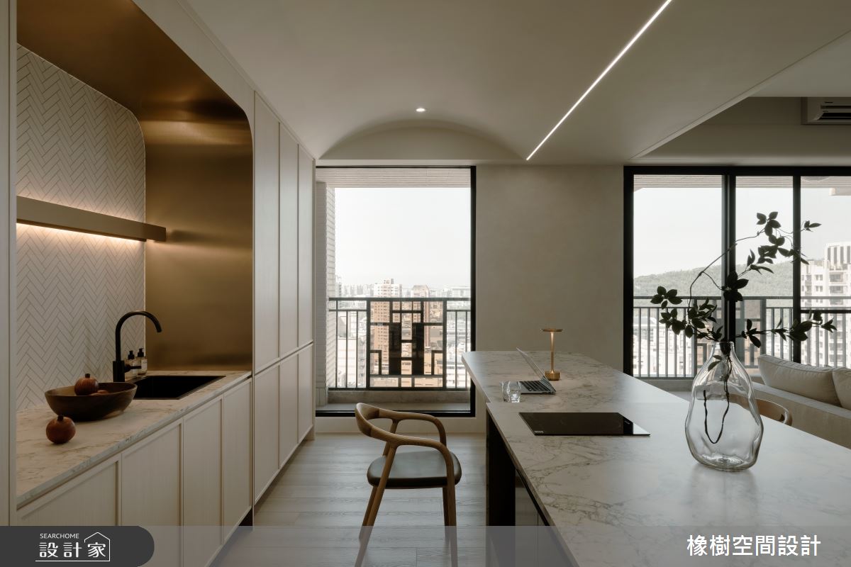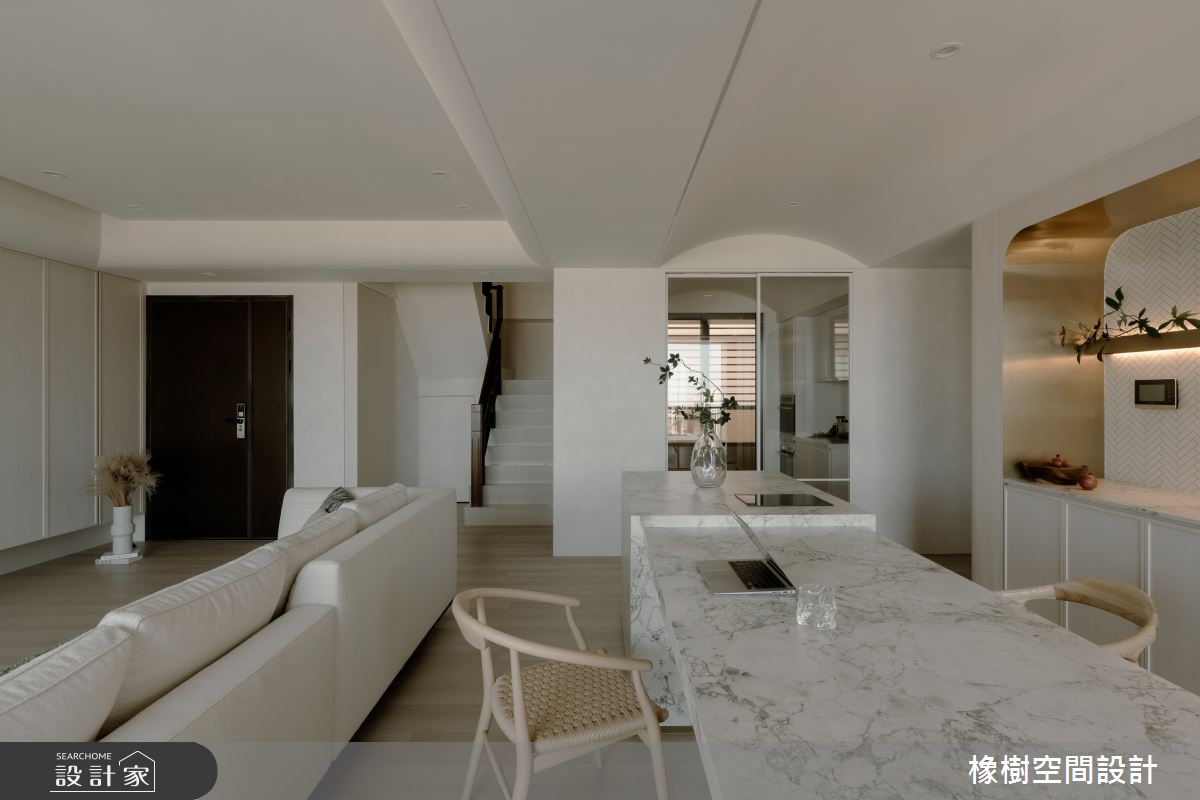 橡樹空間設計以壁紙、水泥漆、大理石、人造石、繃布、SPC木地板、藝術塗料的搭配應用,呈現混搭風居家氛圍,將此間36坪、三房、樓中樓、新成屋(5年以下)打造成舒適愜意的家庭空間,完成2位大人全家人的夢想之居。