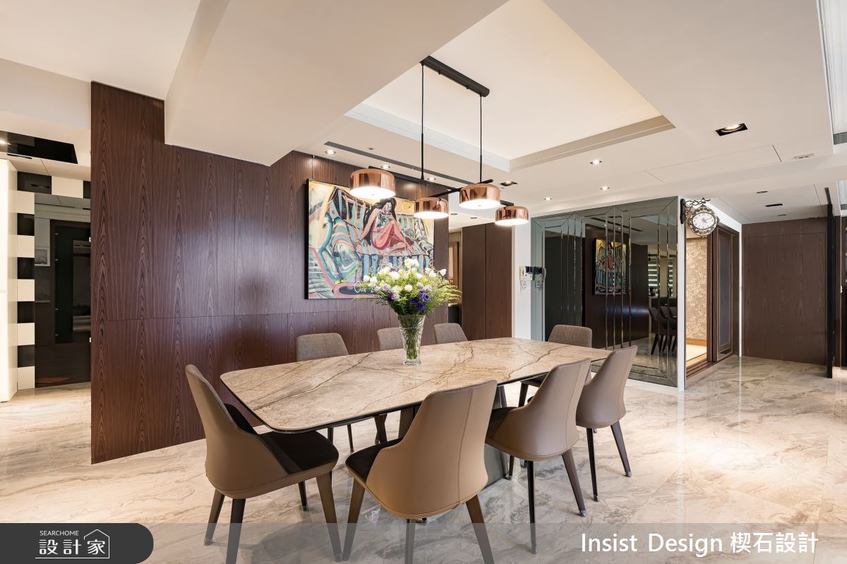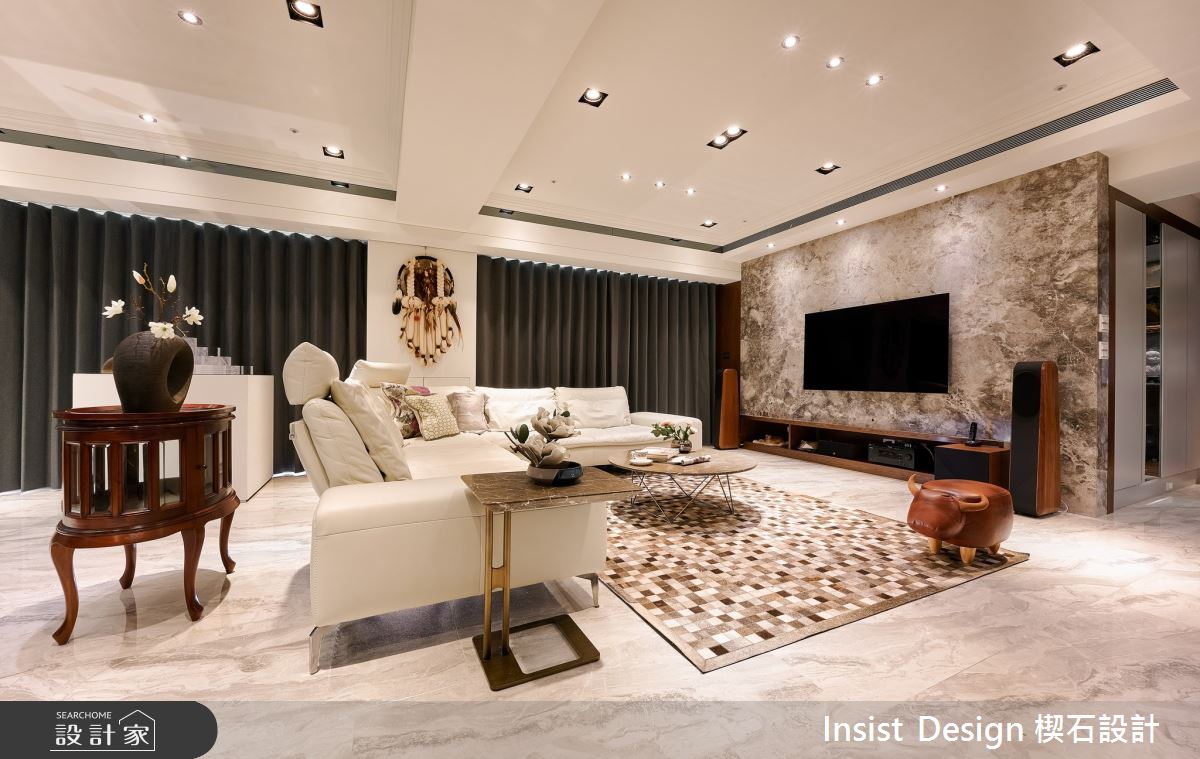本案為楔石設計的55坪奢華風新成屋(5年以下)設計作品,格局為單層五房的居住空間。居住成員包含2位大人、2位小孩。全室建材的搭配,應用乳膠漆、壁紙、超耐磨木地板、石英磚/拋光石英磚、灰鏡、茶玻、烤玻、烤漆、大理石、人造石、石材、繃布、線板、噴漆、噴砂玻璃、鑽雕玻璃、雕刻板、畫框板,展現溫馨的居家氛圍。