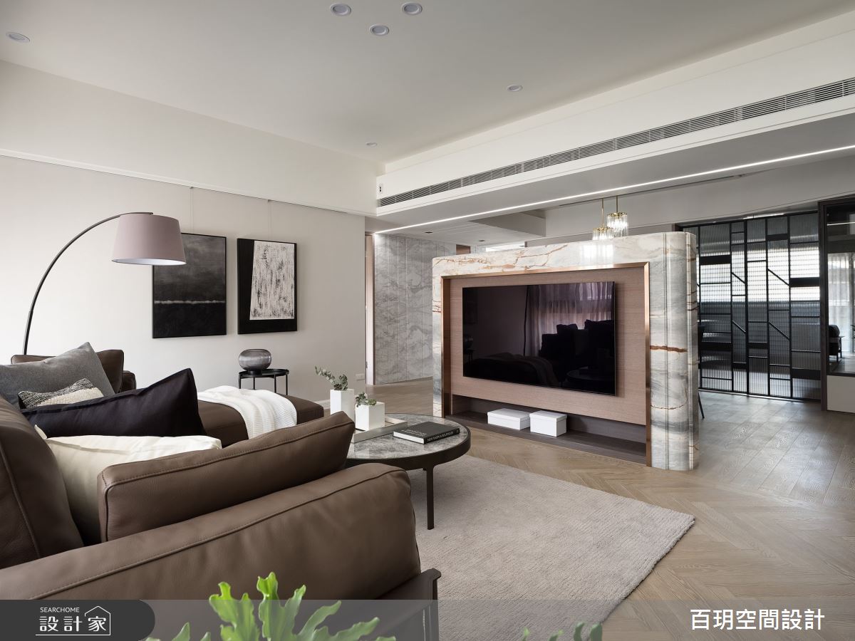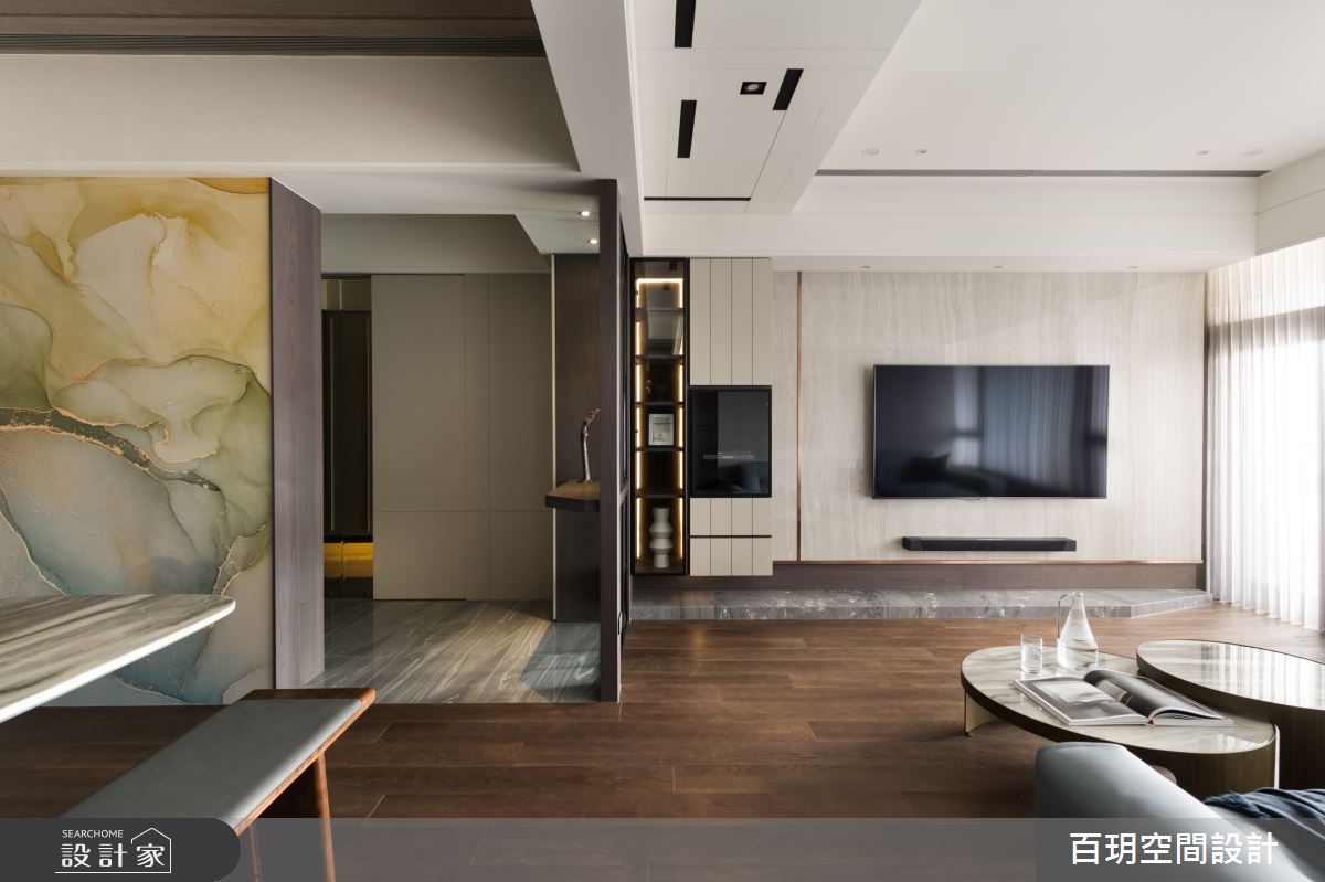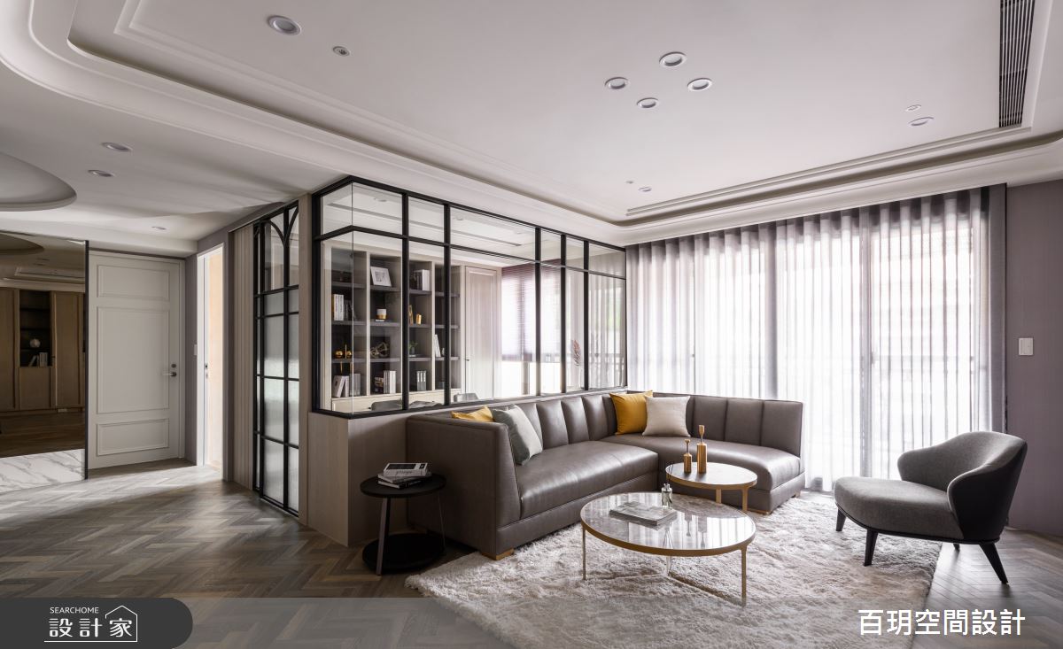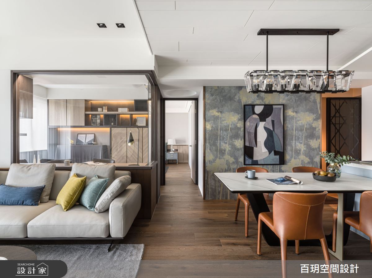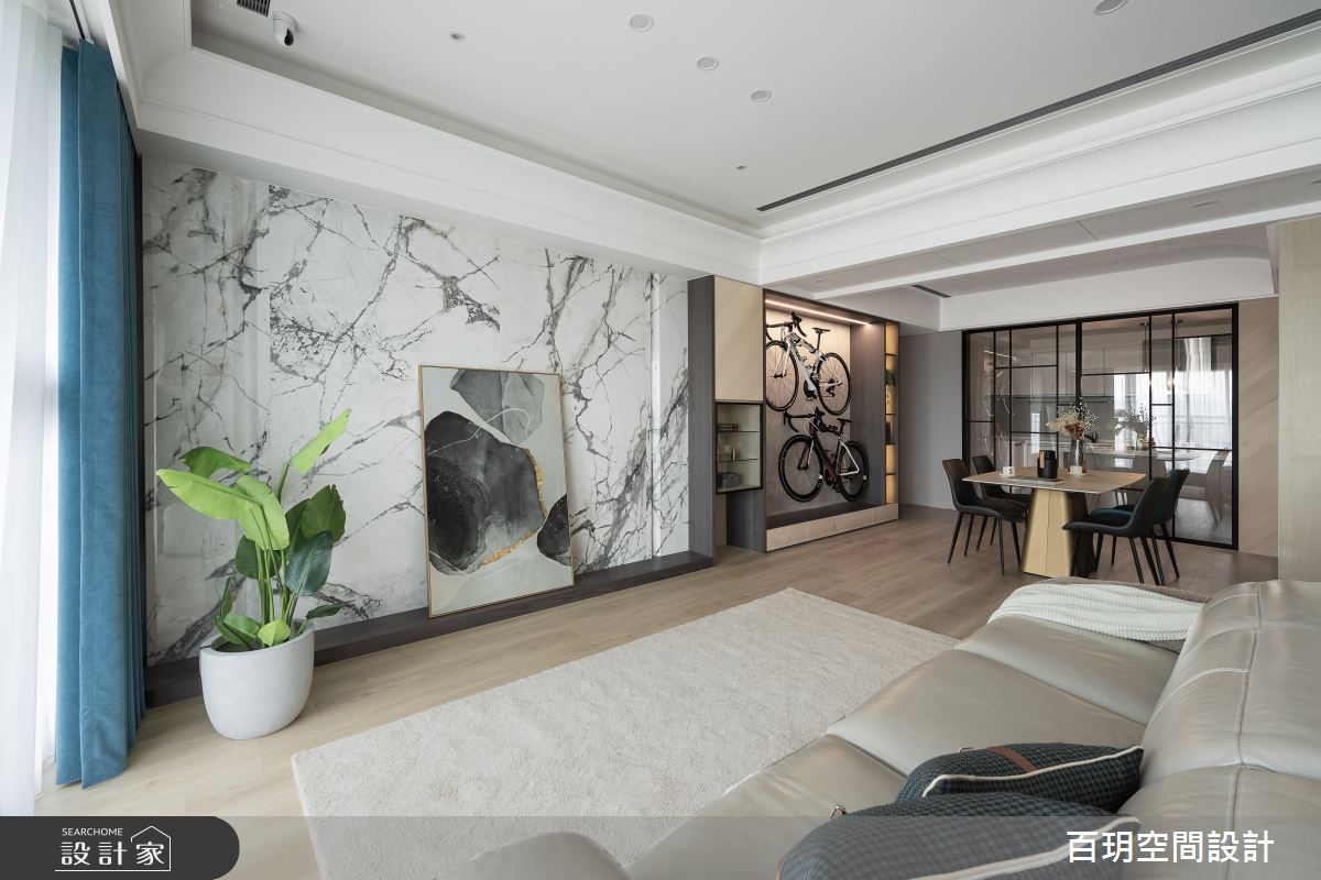 由百玥空間設計精心規劃的65坪三房住宅空間,家庭成員一共有2位大人、1位小孩。因應屋主需求,設計師運用現代風作為主軸,搭配乳膠漆、海島型木地板、鐵件、鍍鈦金屬、木作貼皮、鋼刷木皮、大理石、磁磚、皮革、石材、繃布、噴漆,打造全家人的夢想家居。