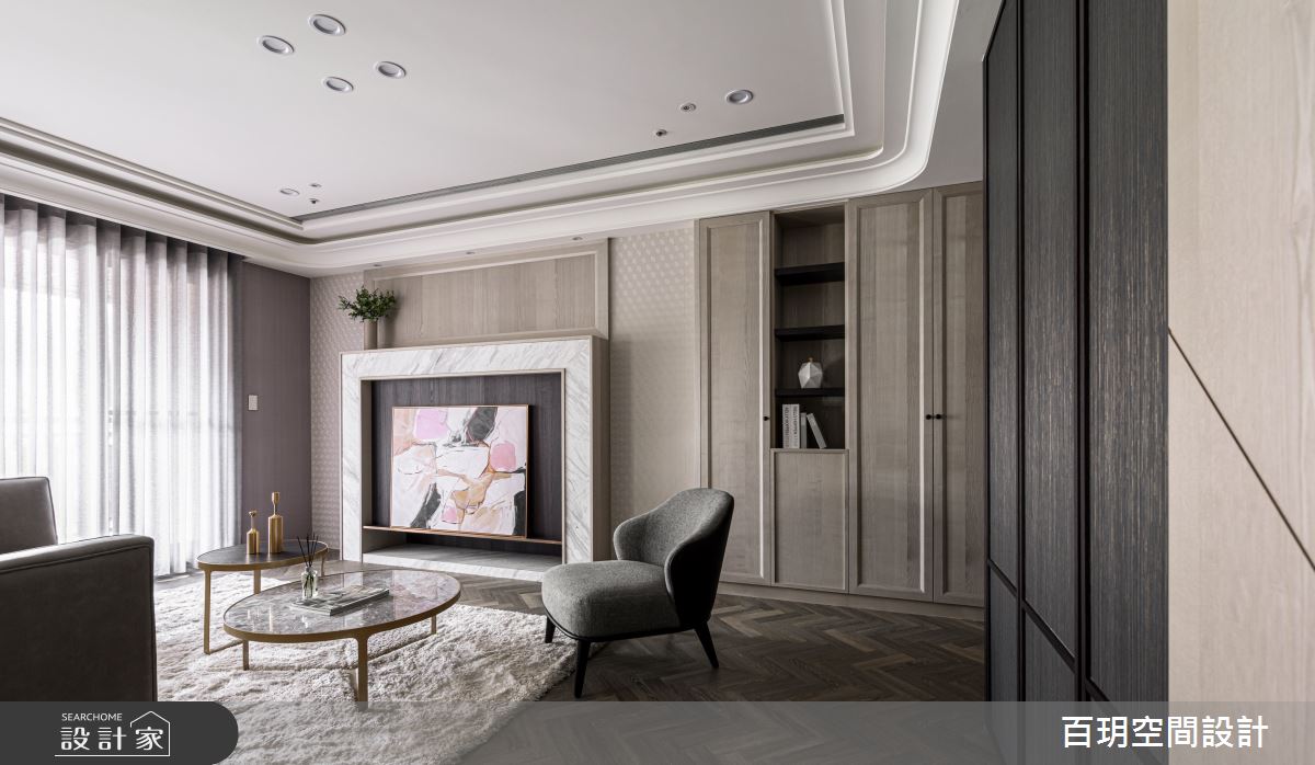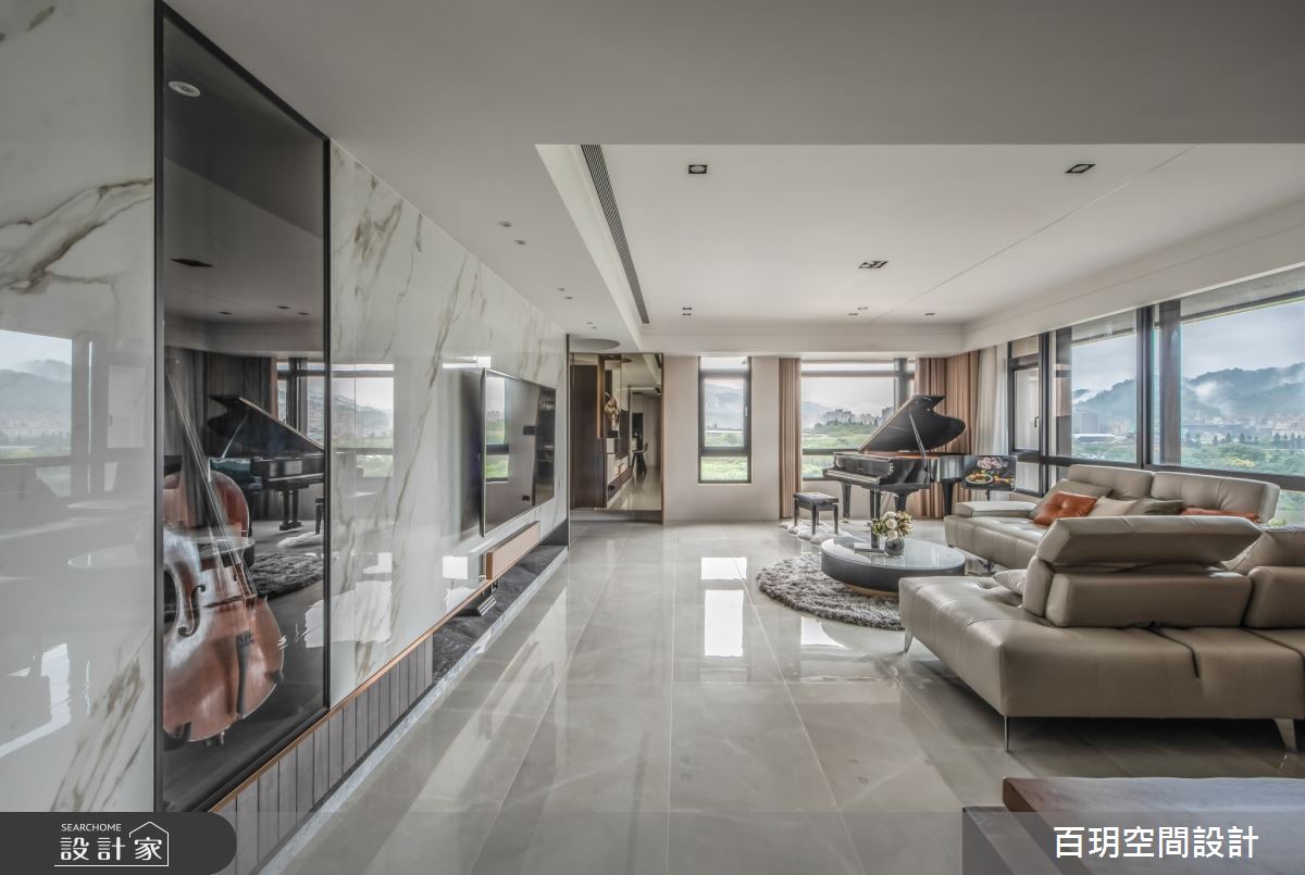 百玥空間設計以乳膠漆、花磚、超耐磨木地板、木紋磚、石英磚/拋光石英磚、鐵件、鍍鈦金屬、木作貼皮、鋼刷木皮、系統板材、大理石、磁磚、皮革、繃布、噴漆的搭配應用,呈現現代風居家氛圍,將此間77坪、五房、樓中樓、新成屋(5年以下)打造成舒適愜意的家庭空間,完成2位大人、1位小孩全家人的夢想之居。