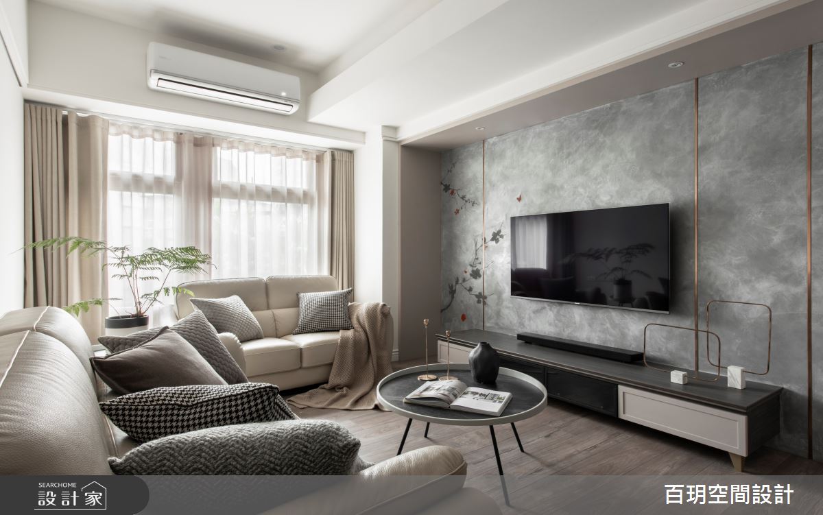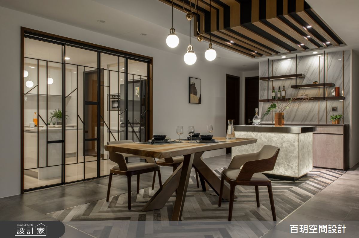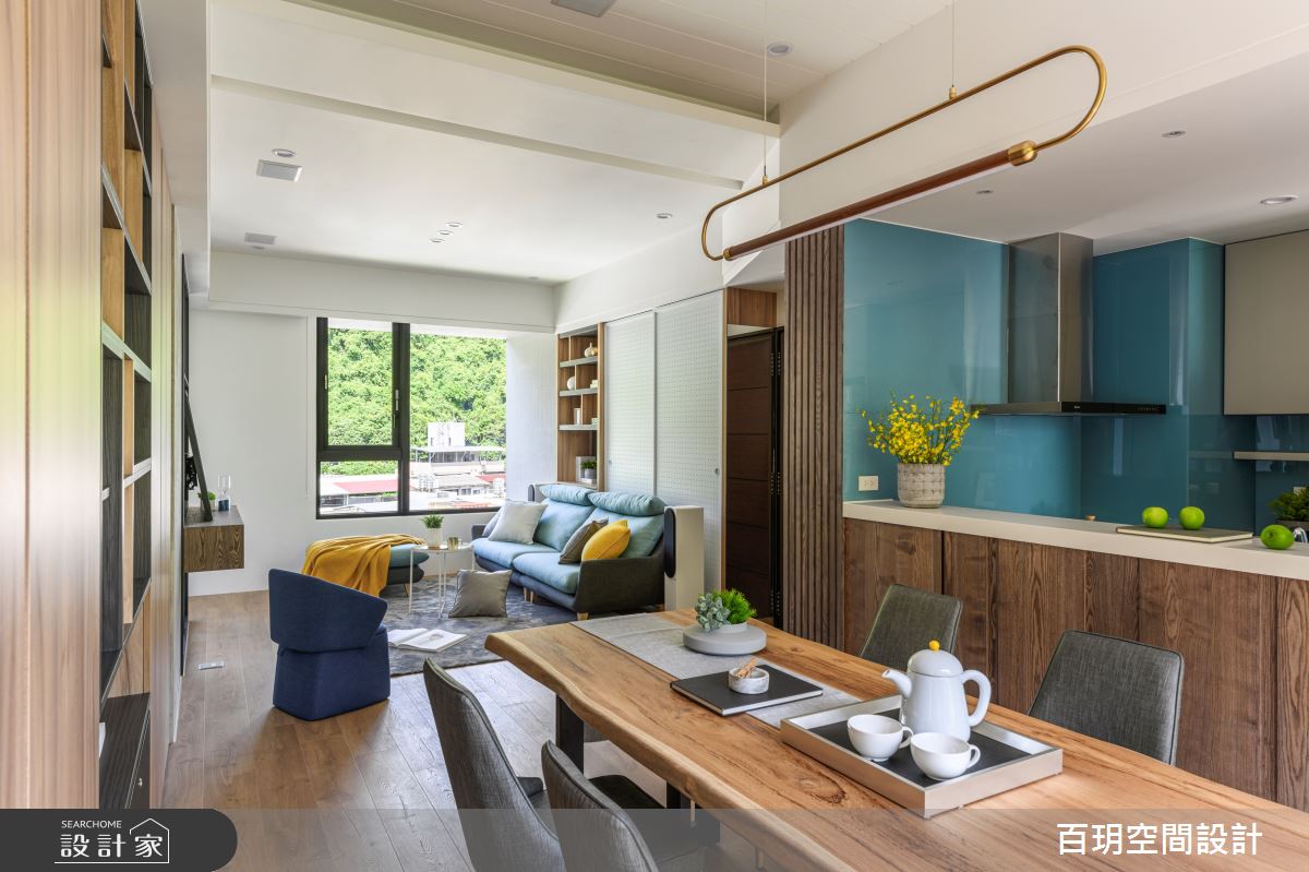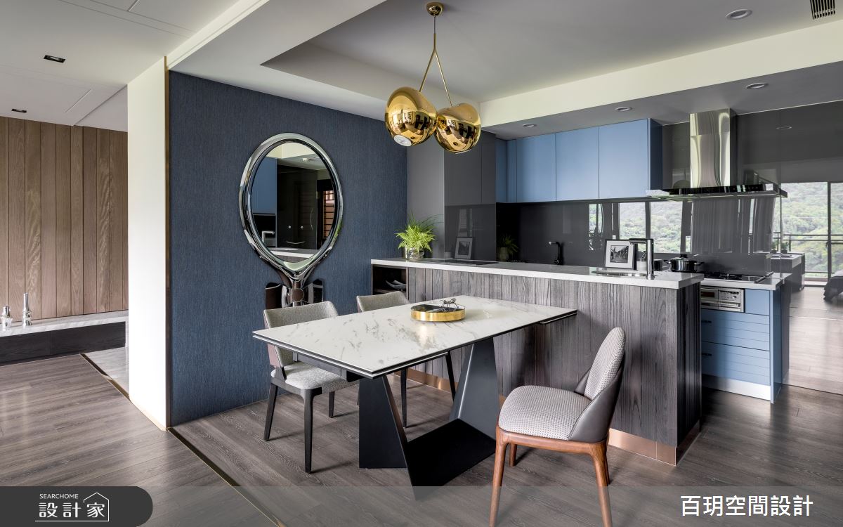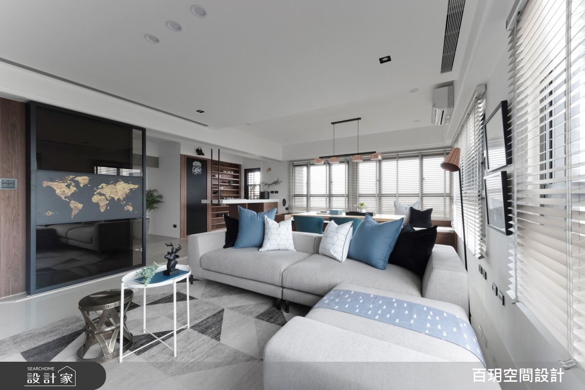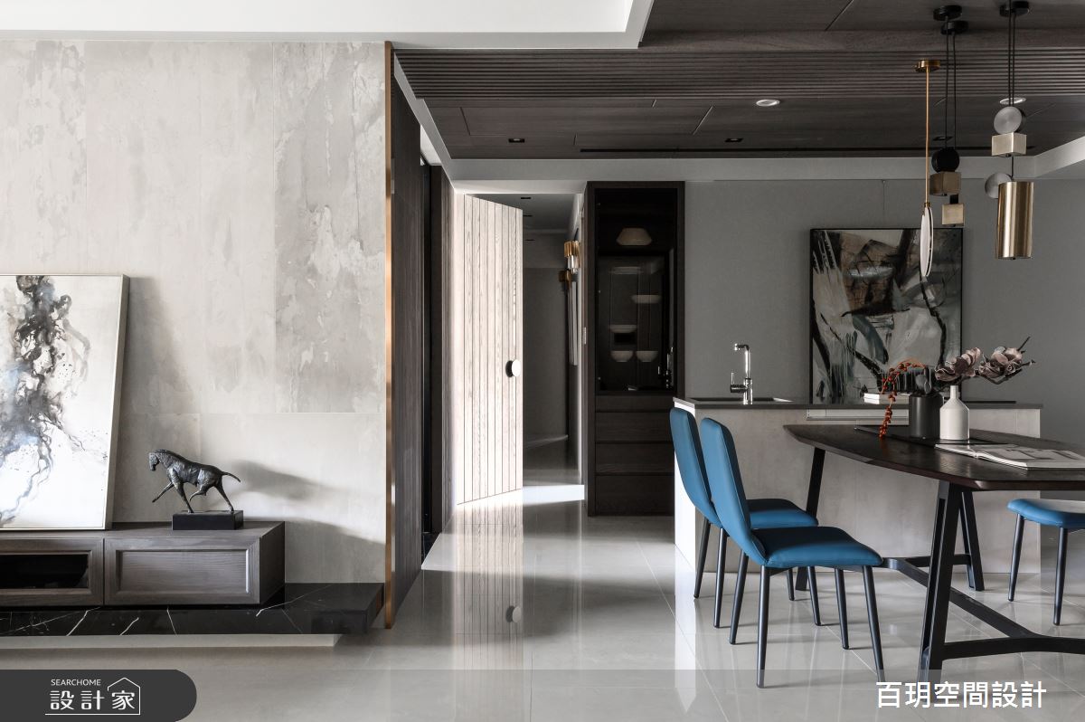 由百玥空間設計精心規劃的50坪三房住宅空間,家庭成員一共有2位大人、1位小孩。因應屋主需求,設計師運用混搭風作為主軸,搭配油漆、乳膠漆、超耐磨木地板、石英磚/拋光石英磚、不鏽鋼、鐵件、鍍鈦金屬、木作貼皮、系統板材、水泥/水泥粉光、樂土、賽麗石、皮革、繃布、噴漆、清水模特殊漆塗料,打造全家人的夢想家居。