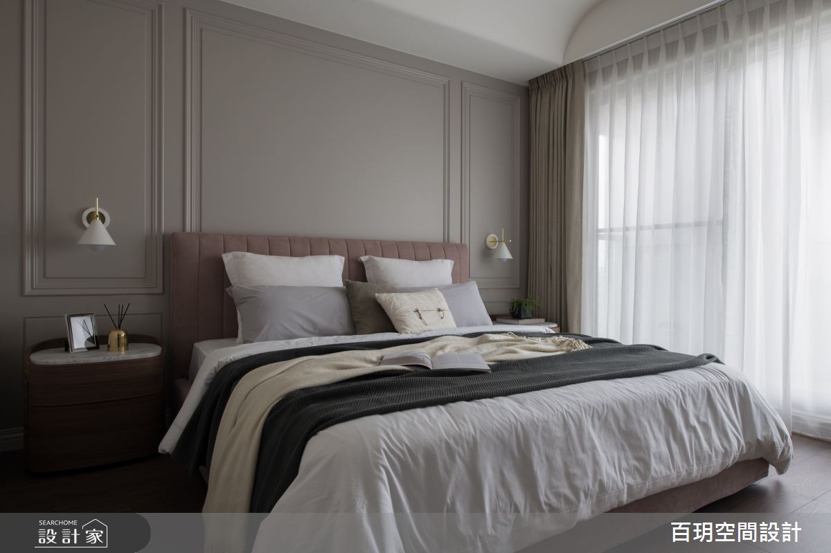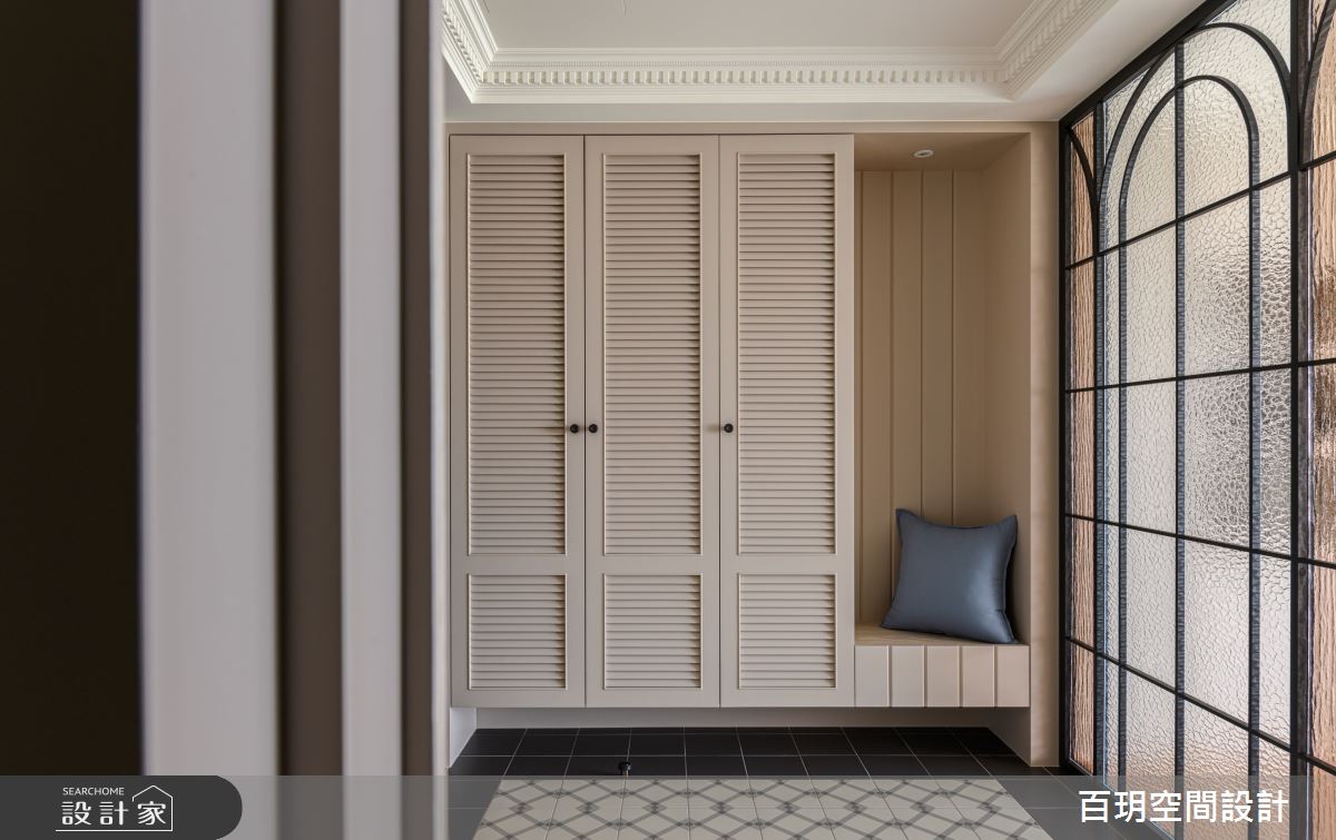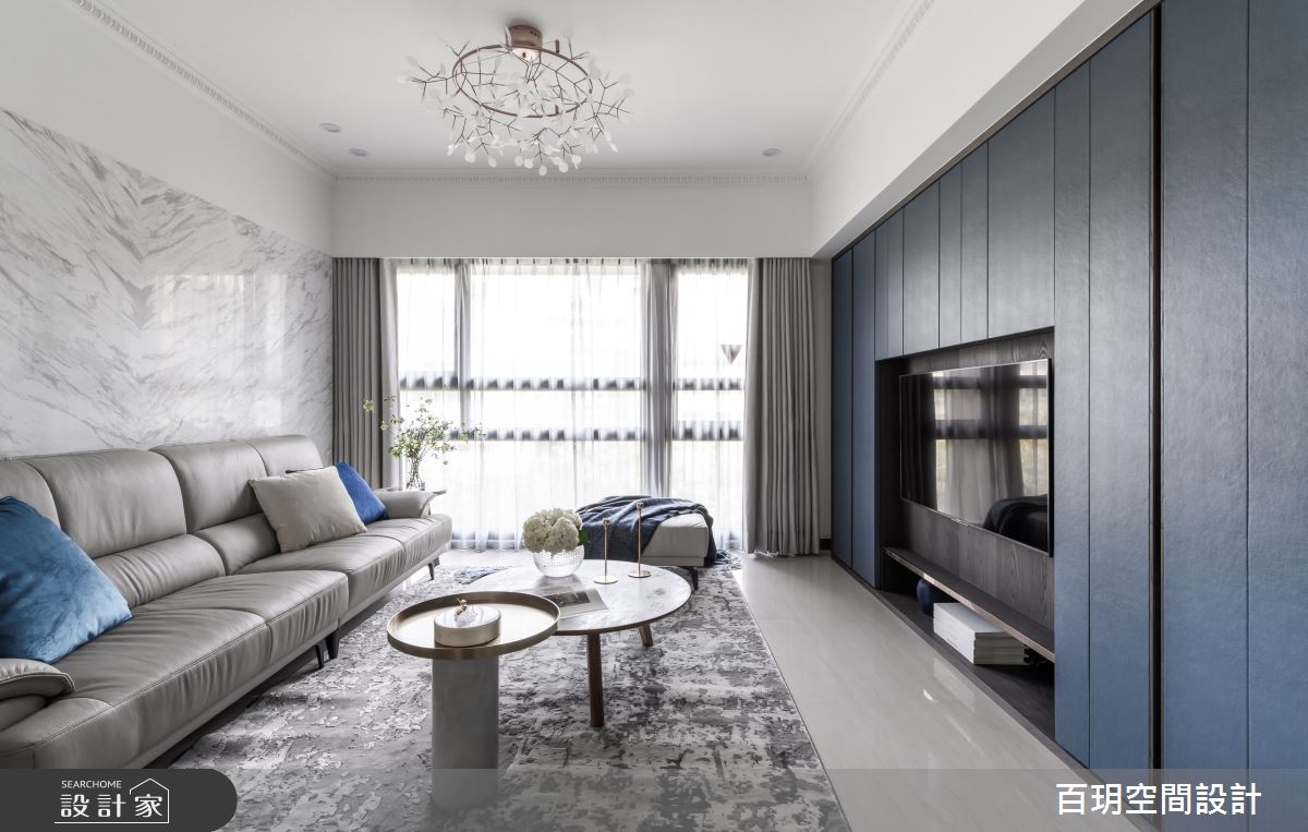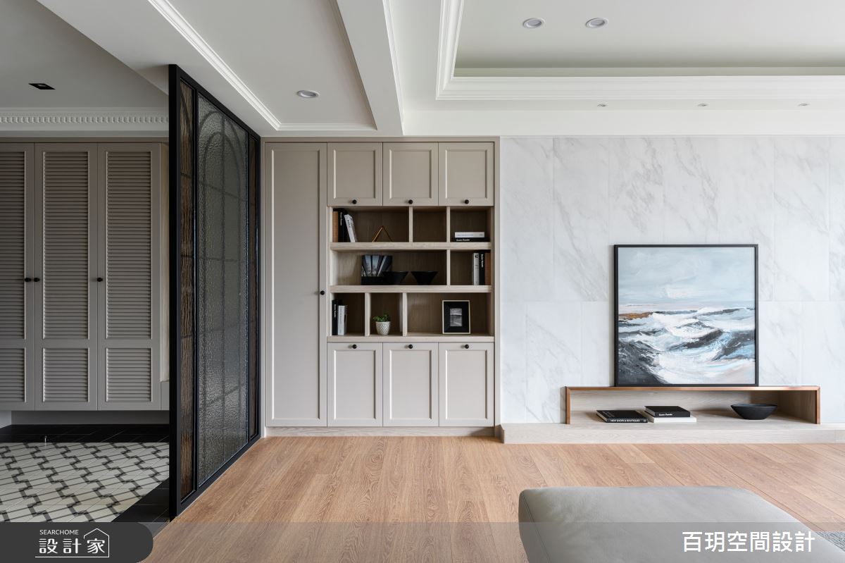 百玥空間設計以油漆、乳膠漆、鐵道磚、花磚、壁紙、海島型木地板、石英磚/拋光石英磚、盤多磨、不鏽鋼、鐵件、茶玻、烤玻、鍍鈦金屬、木作貼皮、系統板材、大理石、磁磚、樂土、賽麗石、皮革、石材、繃布、線板、噴漆、清水模特殊漆塗料的搭配應用,呈現新古典居家氛圍,將此間75坪、四房、單層、新成屋(5年以下)打造成舒適愜意的家庭空間,完成2位大人、3位小孩全家人的夢想之居。