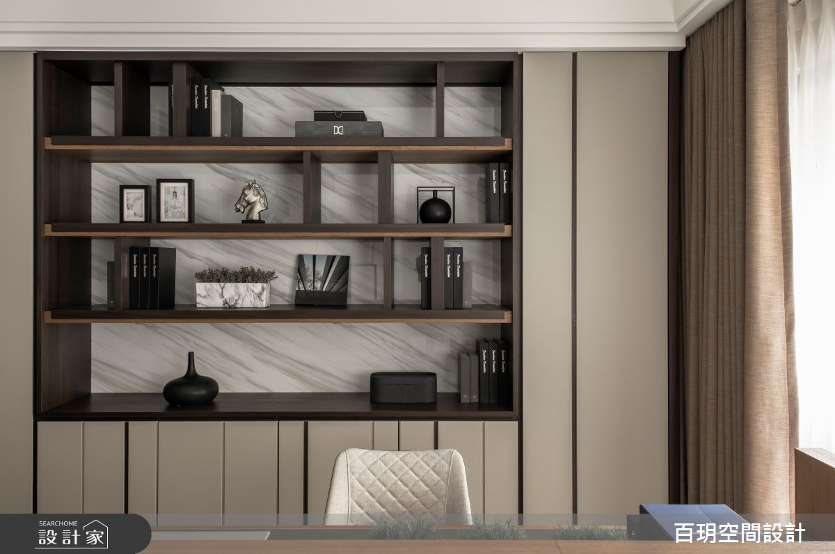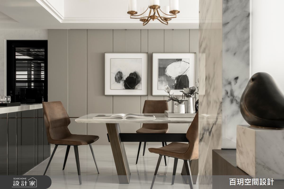 百玥空間設計以油漆、乳膠漆、超耐磨木地板、不鏽鋼、鐵件、木作貼皮、鋼刷木皮、系統板材、大理石、磁磚、水泥/水泥粉光、木百葉、賽麗石、皮革、石材、噴漆的搭配應用,呈現新古典居家氛圍,將此間113坪、三房、單層、中古屋(5~15年)打造成舒適愜意的家庭空間,完成2位大人全家人的夢想之居。