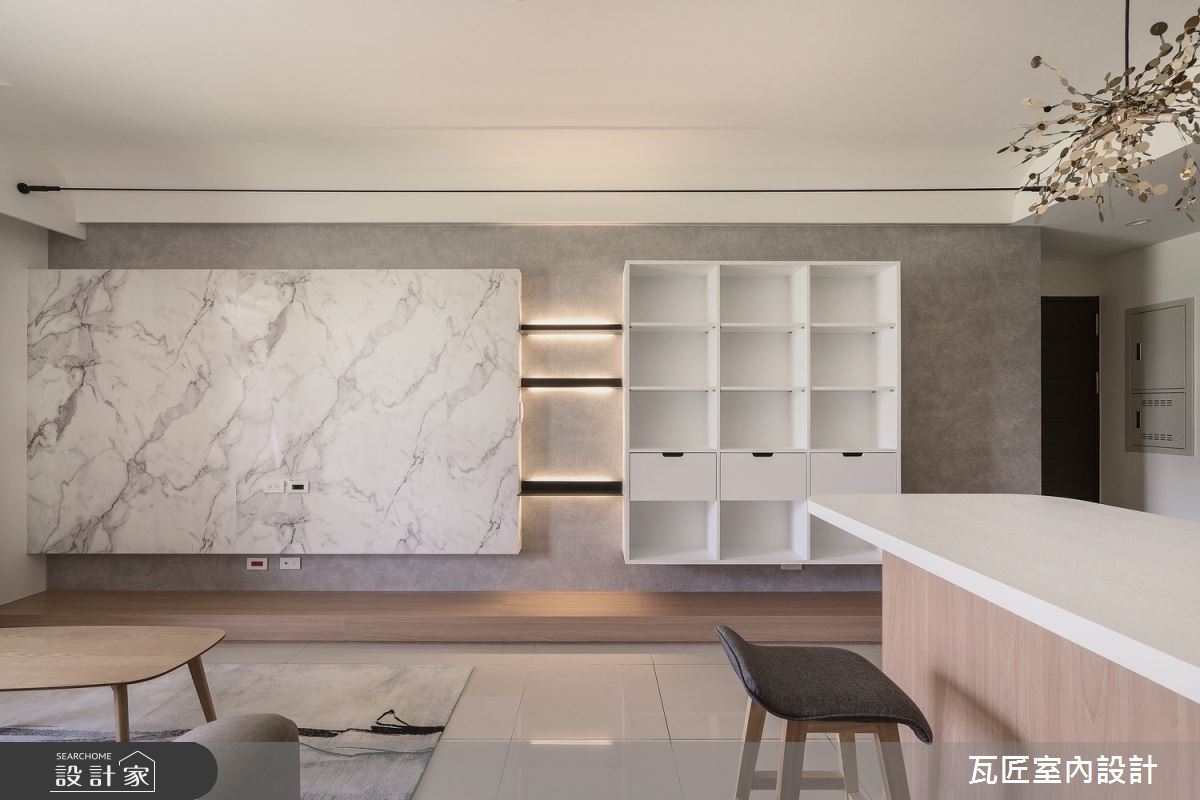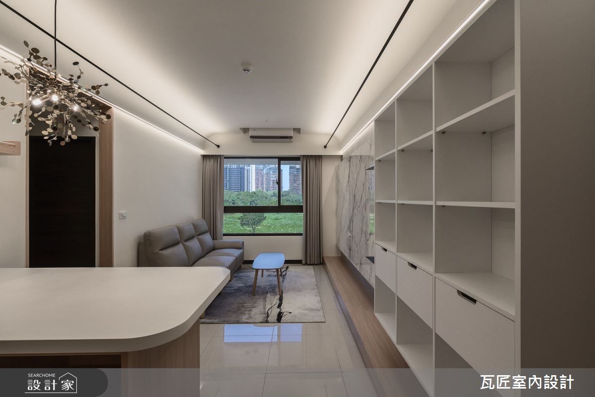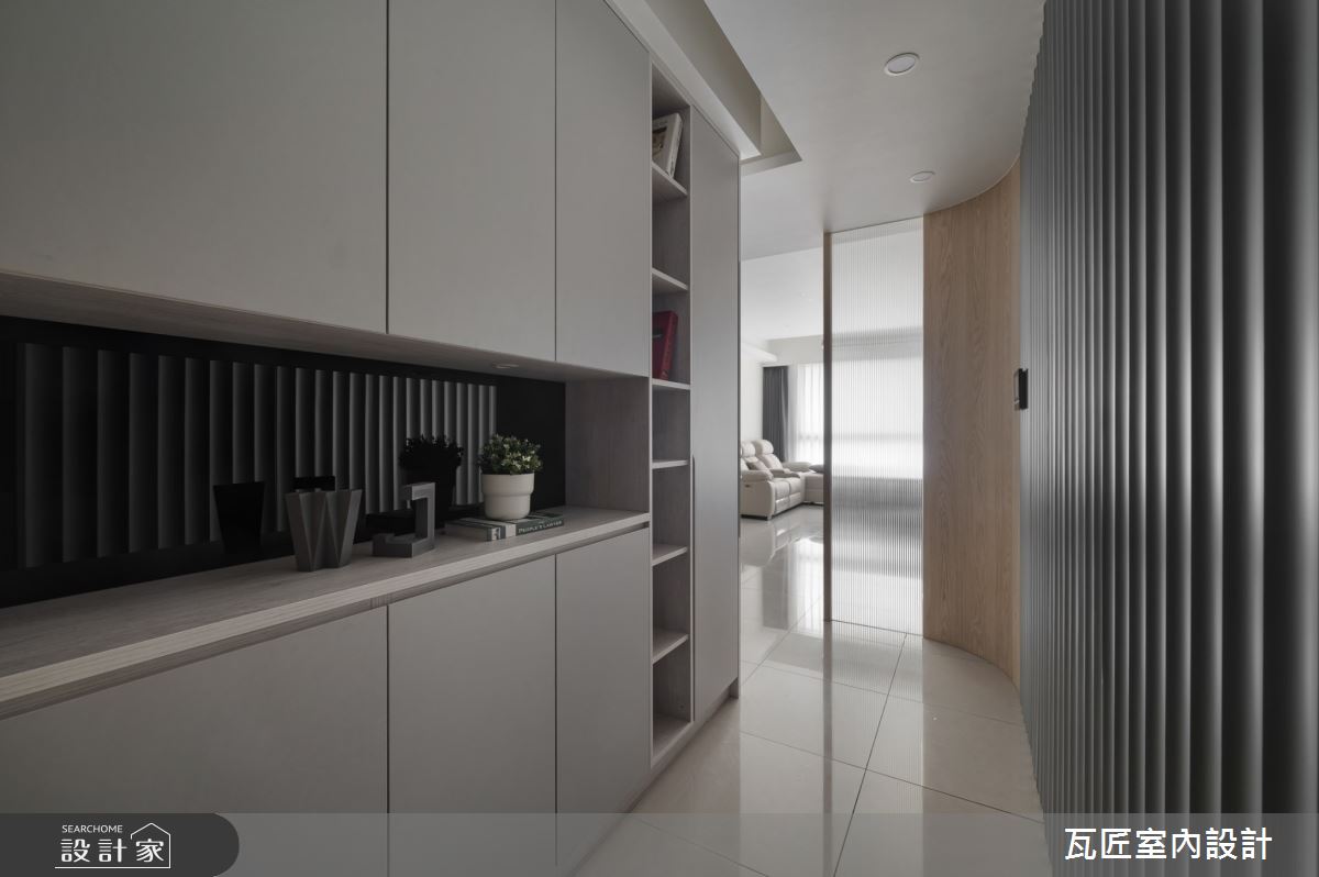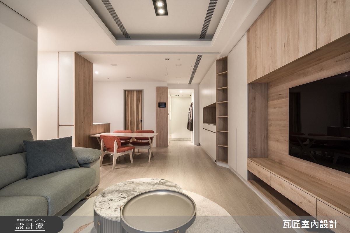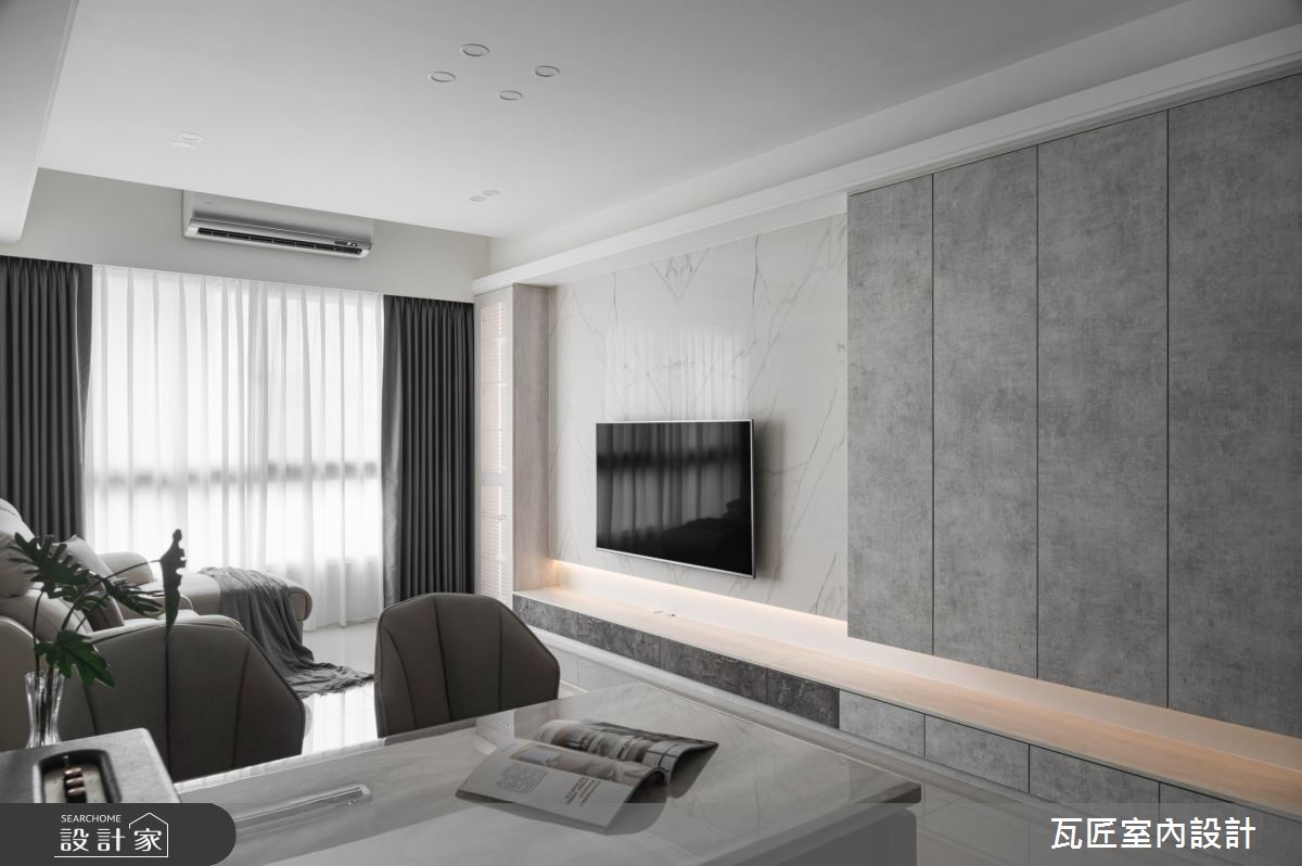 瓦匠室內設計以乳膠漆、拋光石英磚、鐵件、灰鏡(鋁框玻璃造型拉門)、烤玻、木作貼皮、烤漆、系統板材、磁磚(薄板磁磚)、石材、長虹玻璃、LED燈條的搭配應用,呈現現代風居家氛圍,將此間25坪、三房、單層、新成屋(5年以下)打造成舒適愜意的家庭空間,完成2位大人、2位小孩全家人的夢想之居。