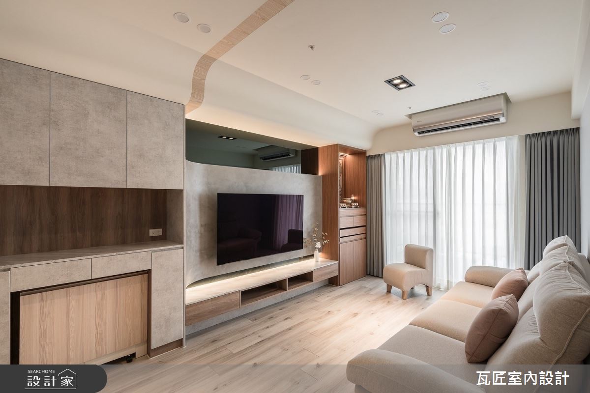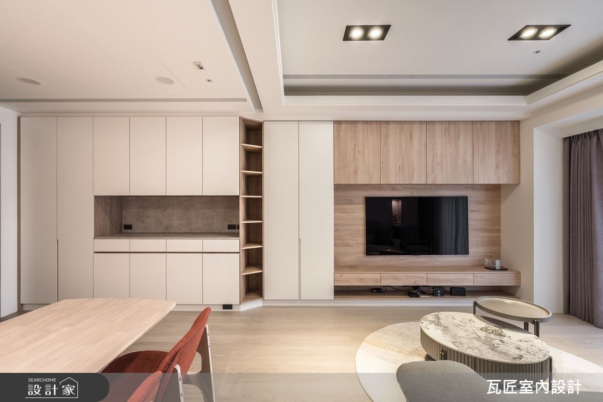 瓦匠室內設計以日本麗仕矽酸鈣板、實木木皮、系統家具、進口五金、乳膠漆、電動窗簾、繃布、造型玻璃、進口木地板的搭配應用,呈現日式風居家氛圍,將此間23坪、兩房、單層、新成屋(5年以下)打造成舒適愜意的家庭空間,完成2位大人全家人的夢想之居。