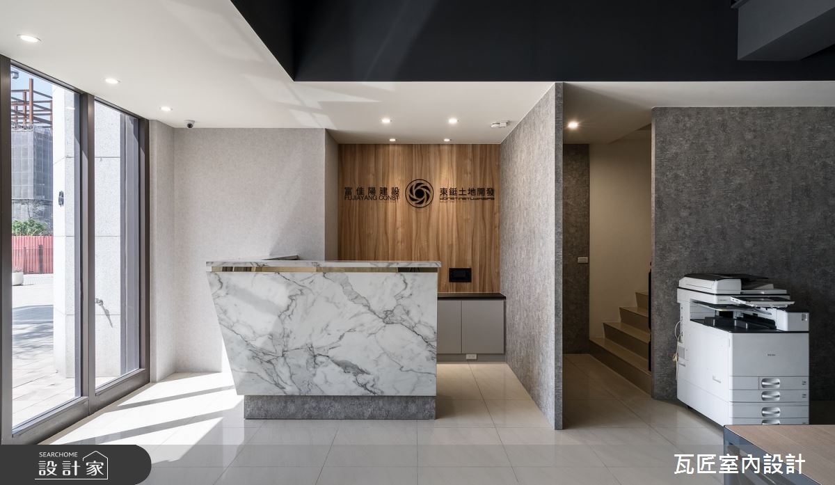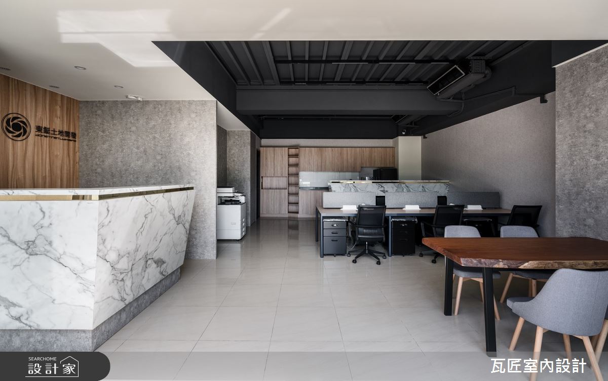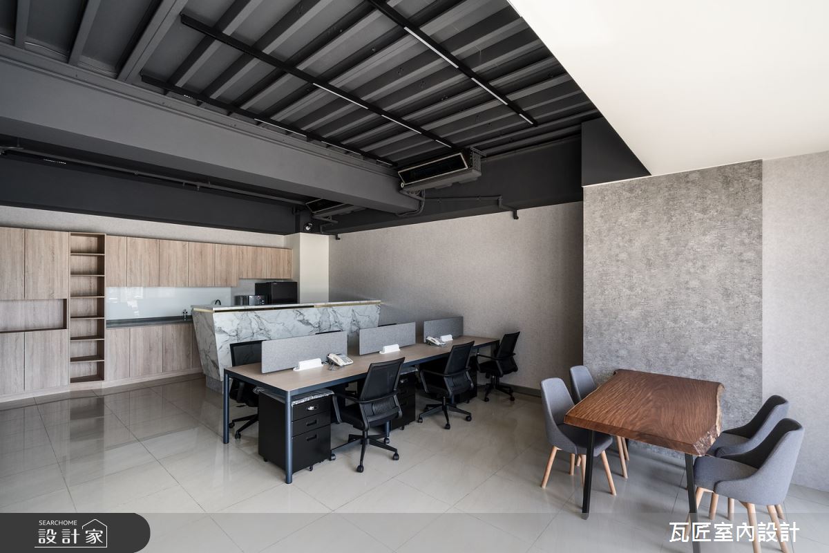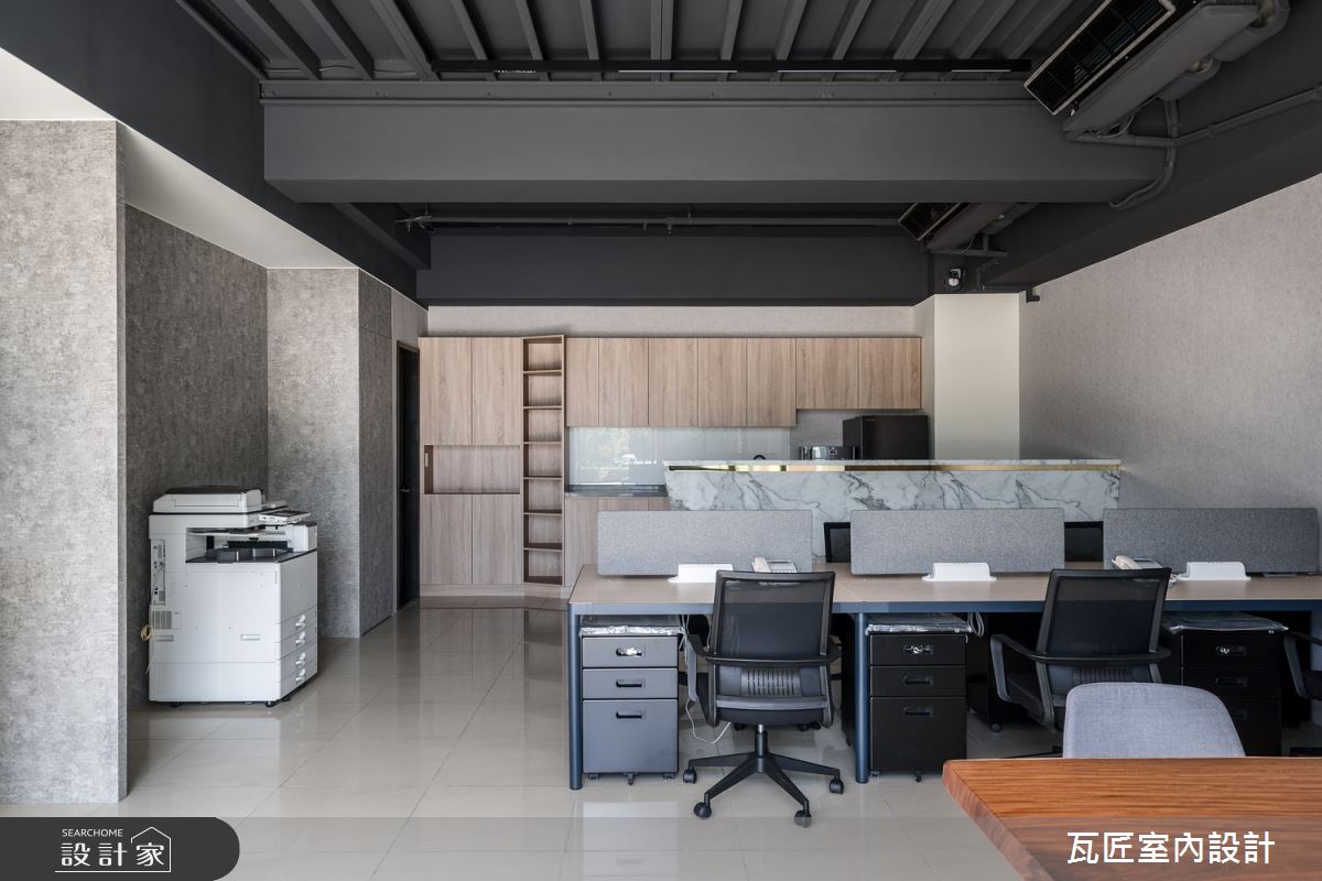 瓦匠室內設計以壁紙、矽酸鈣板、C型鋼、美耐板、系統家具、玻璃、調色漆的搭配應用,呈現工業風的風格氣息,將此間38坪新成屋(5年以下)優雅詮釋成舒適愜意的商業空間。