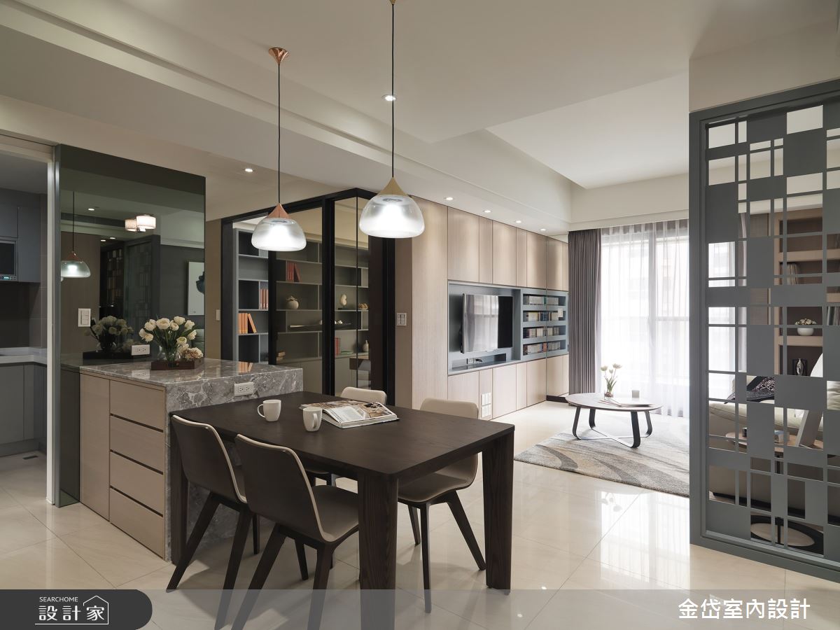 由金岱室內裝修有限公司精心規劃的60坪三房住宅空間,家庭成員一共有2位大人、2位小孩。因應屋主需求,設計師運用現代風作為主軸,搭配乳膠漆、壁紙、超耐磨木地板、灰鏡、茶玻、烤玻、木作貼皮、鋼刷木皮、大理石、磁磚,打造全家人的夢想家居。