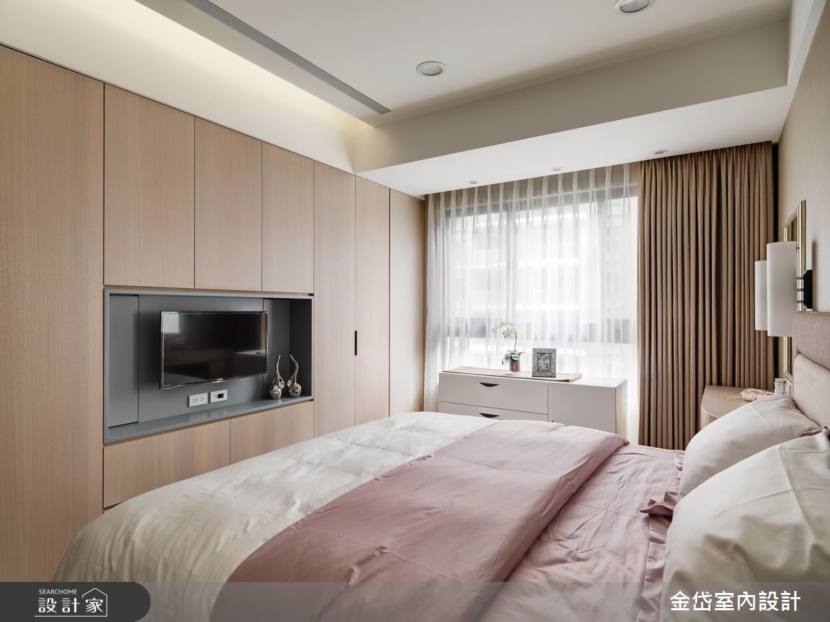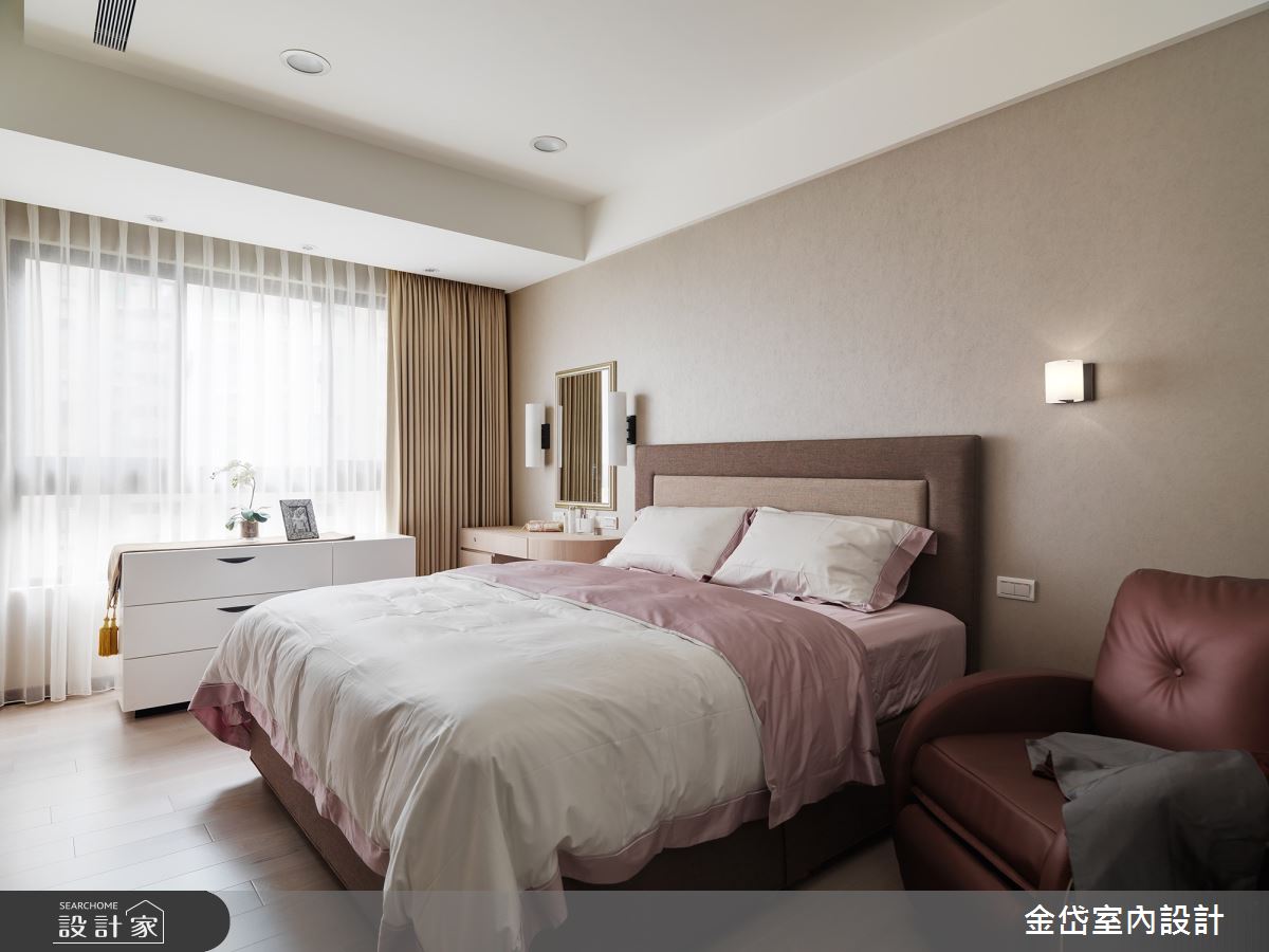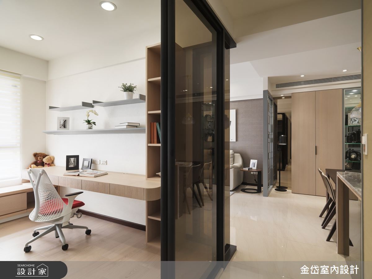 金岱室內裝修有限公司以乳膠漆、花磚、壁紙、超耐磨木地板、石英磚/拋光石英磚、灰鏡、茶玻、烤玻、木作貼皮、鋼刷木皮、系統板材、大理石、賽麗石、石材的搭配應用,呈現現代風居家氛圍,將此間36坪、三房、單層、新成屋(5年以下)打造成舒適愜意的家庭空間,完成2位大人全家人的夢想之居。