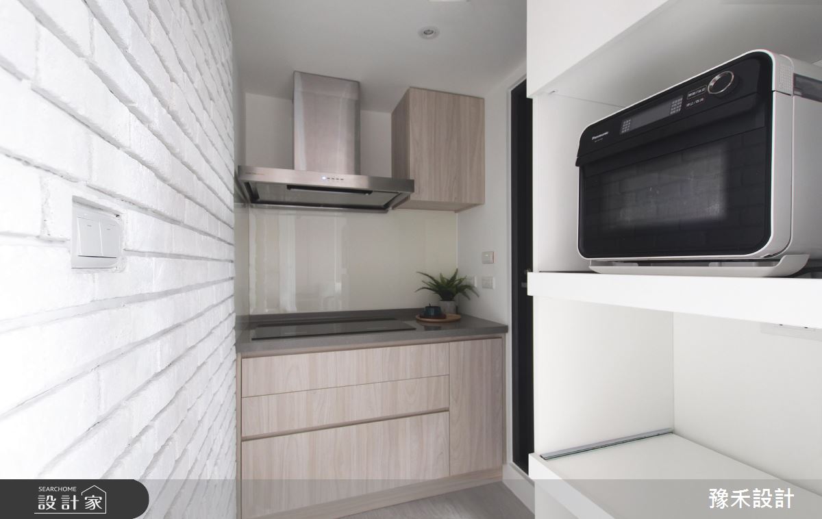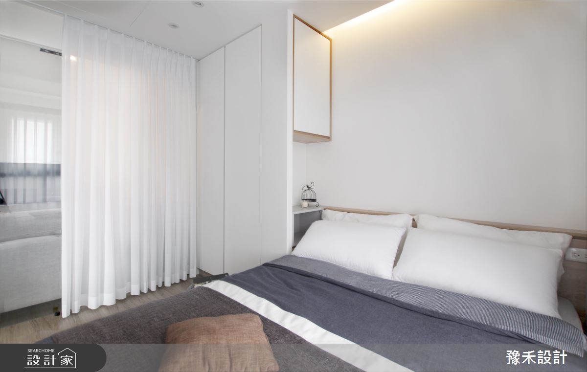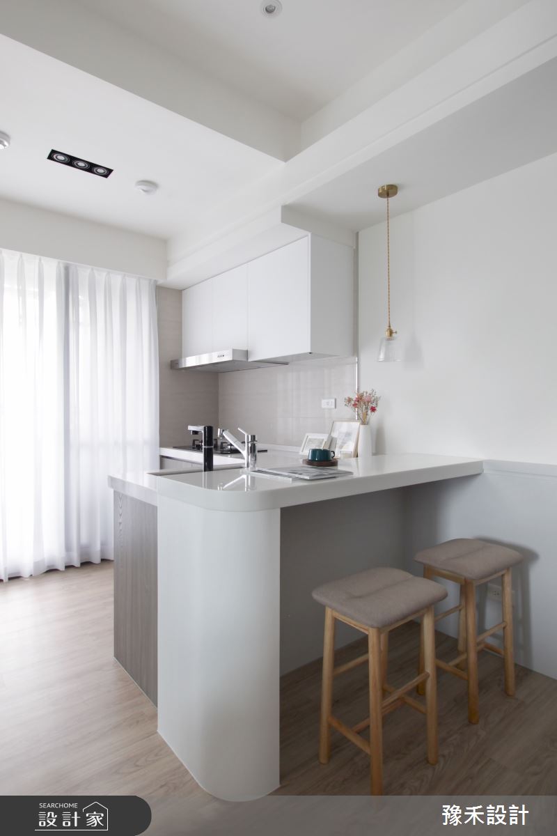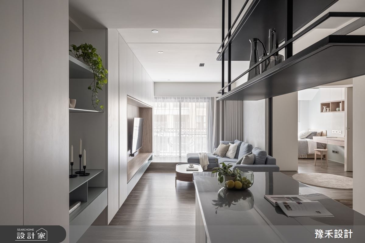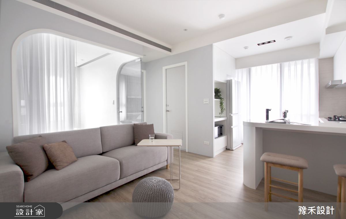 「皚如山上雪,皎若雲間月」抹去過多的裝飾,以優雅白淨的調性,裝載雅緻生活調性,也給予小坪數寬裕的居家場域。 極致收納不壓迫 從隔間開始,將機能按比例劃分,妥善分配收納及生活空間,增厚電視牆於左側近廚房處規劃電器櫃,加以置入各種儲物機能,讓電視牆不僅是電視牆;同時將天花板拉至最高,將儲物需求延伸至頂,舒緩空間壓力同時滿足收納需求。小坪數也有夢想臥榻 延伸電視機櫃結合過道區域,創造屋主夢想的架高地台,享受坐臥於落地窗邊享受山間林蔭的悠閒愜意,彈性放上坐墊成為L型的座區,擴增了客廳的活動空間,當客人來訪時就也成了團聚的溫馨場域。讓孩子揮灑創意 透過變更主臥門板材料成為吸磁白板,成為家人間的交流中心,並搭配著臥榻坐區,留給了孩子一個玩樂及牆面創作的小天地。圖文提供_豫禾設計