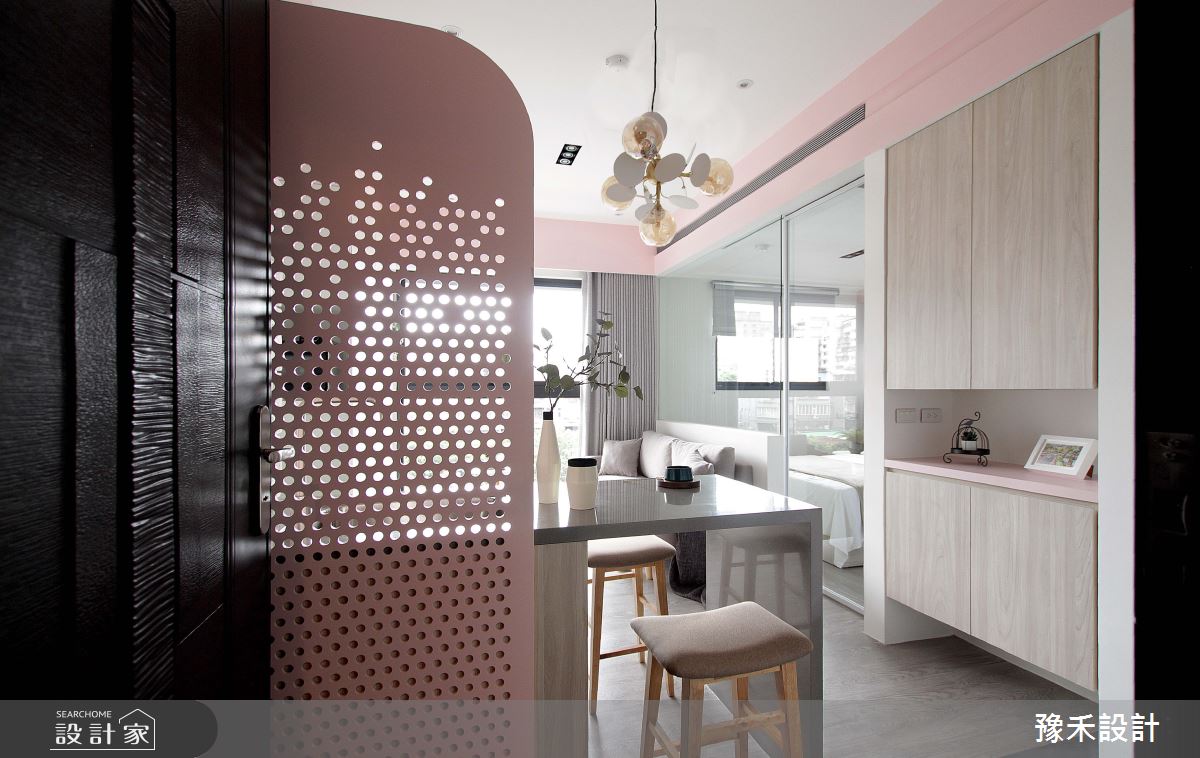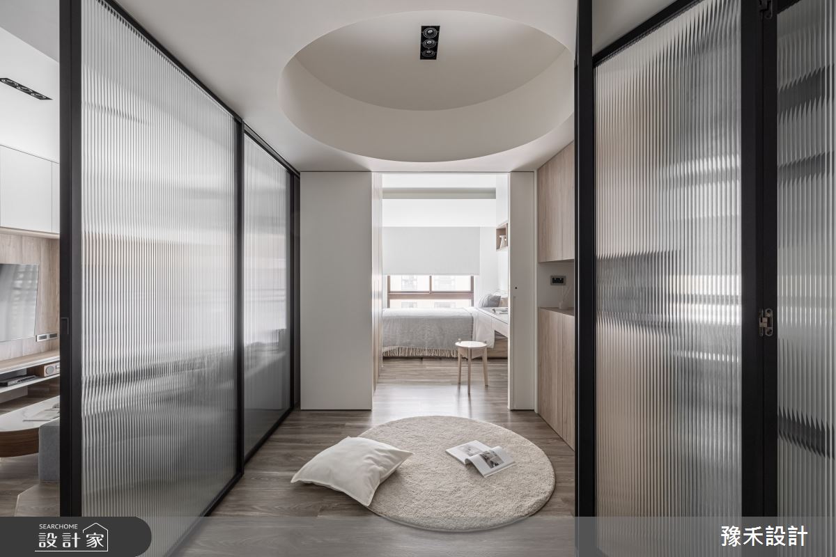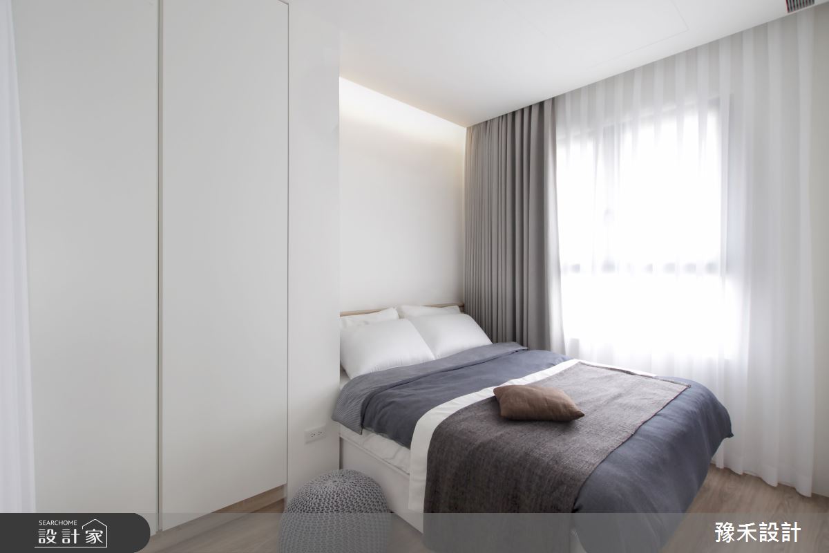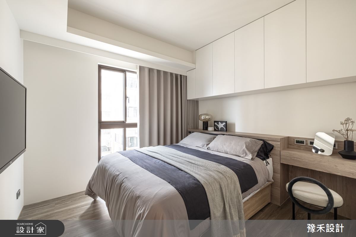 「皚如山上雪,皎若雲間月」抹去過多的裝飾,以優雅白淨的調性,裝載雅緻生活調性,也給予小坪數寬裕的居家場域。 極致收納不壓迫 從隔間開始,將機能按比例劃分,妥善分配收納及生活空間,增厚電視牆於左側近廚房處規劃電器櫃,加以置入各種儲物機能,讓電視牆不僅是電視牆;同時將天花板拉至最高,將儲物需求延伸至頂,舒緩空間壓力同時滿足收納需求。小坪數也有夢想臥榻 延伸電視機櫃結合過道區域,創造屋主夢想的架高地台,享受坐臥於落地窗邊享受山間林蔭的悠閒愜意,彈性放上坐墊成為L型的座區,擴增了客廳的活動空間,當客人來訪時就也成了團聚的溫馨場域。讓孩子揮灑創意 透過變更主臥門板材料成為吸磁白板,成為家人間的交流中心,並搭配著臥榻坐區,留給了孩子一個玩樂及牆面創作的小天地。圖文提供_豫禾設計