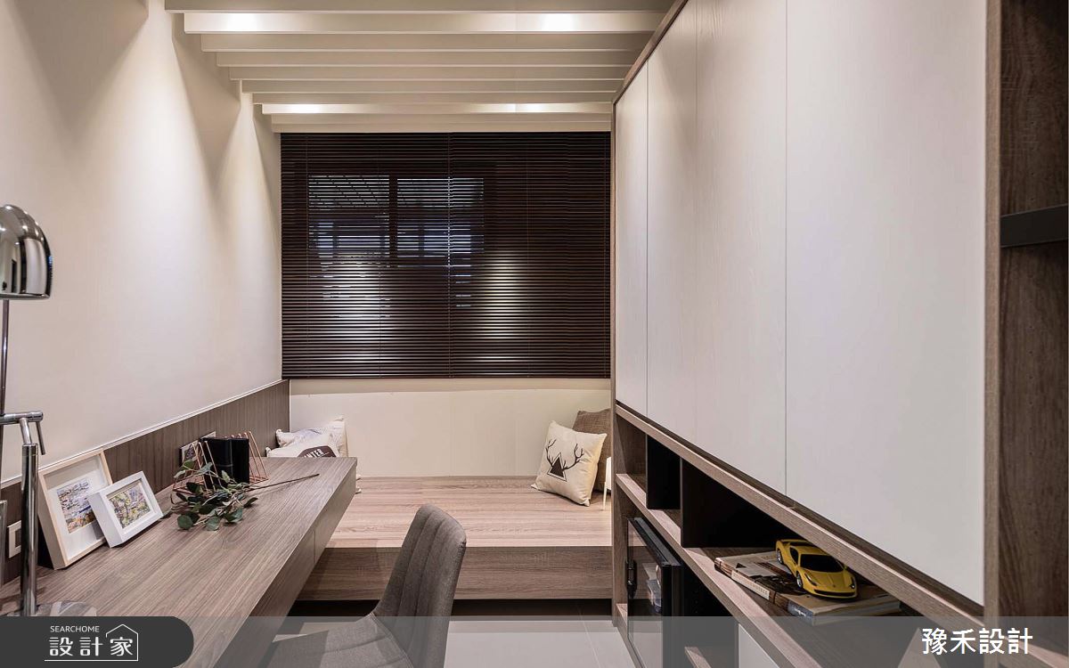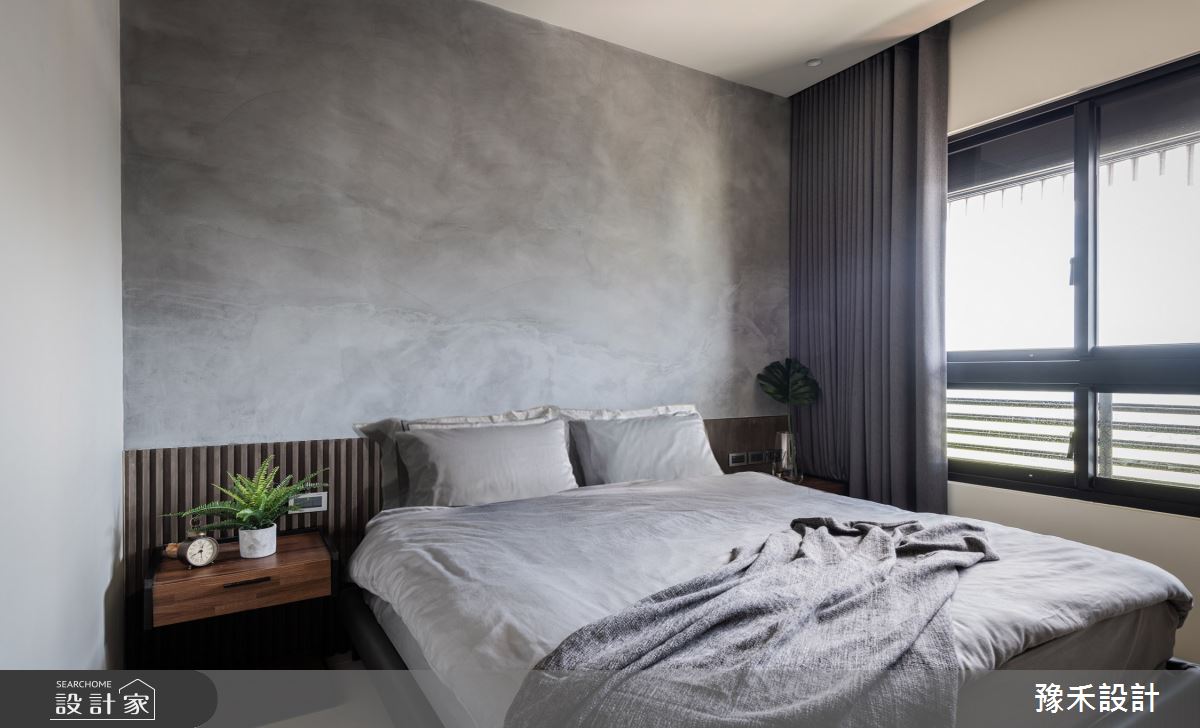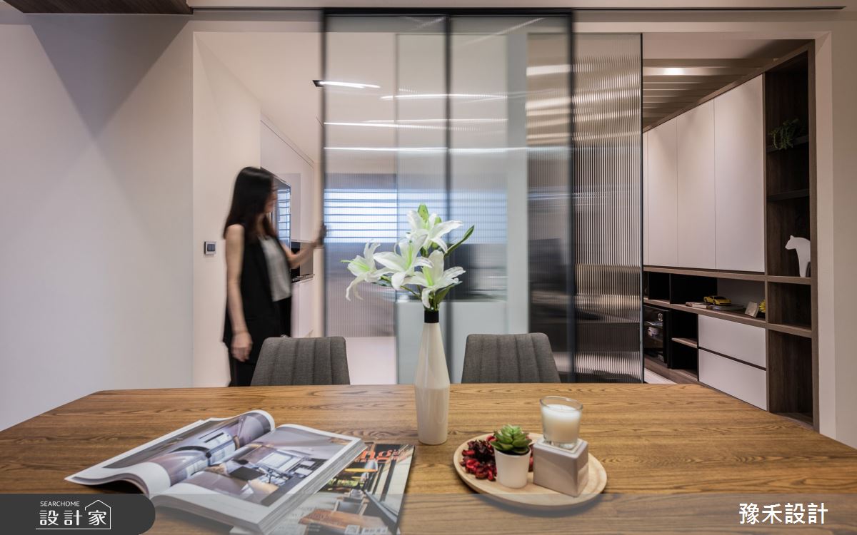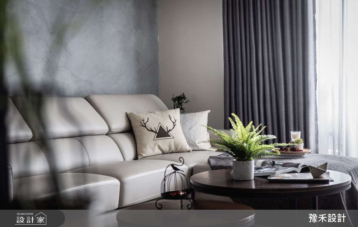 豫禾設計以乳膠漆、超耐磨木地板、鐵件、鍍鈦金屬、木作貼皮、烤漆、鋼刷木皮、系統板材、木百葉、人造石、軌道燈、礦物塗料、塑化木、間接燈的搭配應用,呈現現代風居家氛圍,將此間36坪、三房、單層、新成屋(5年以下)打造成舒適愜意的家庭空間,完成2位大人全家人的夢想之居。