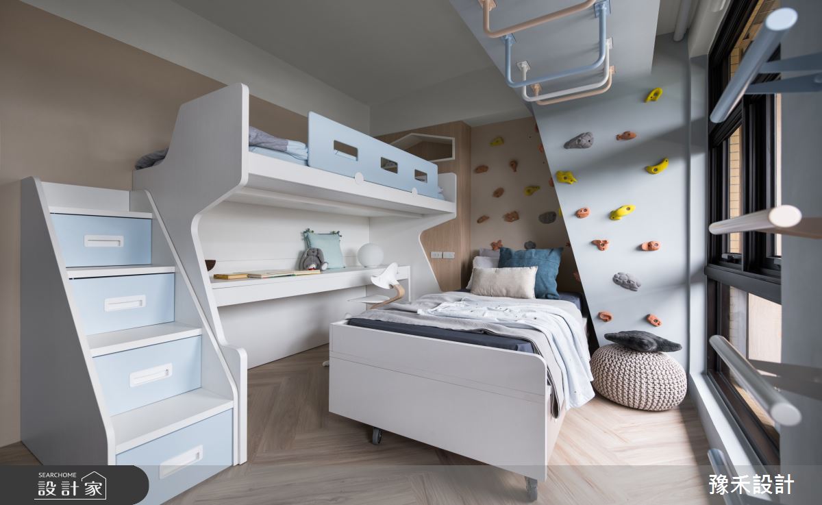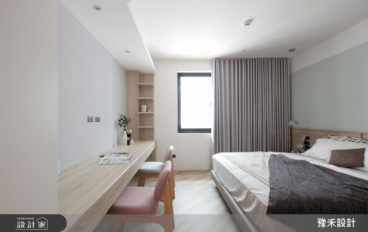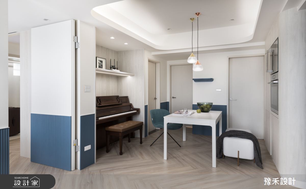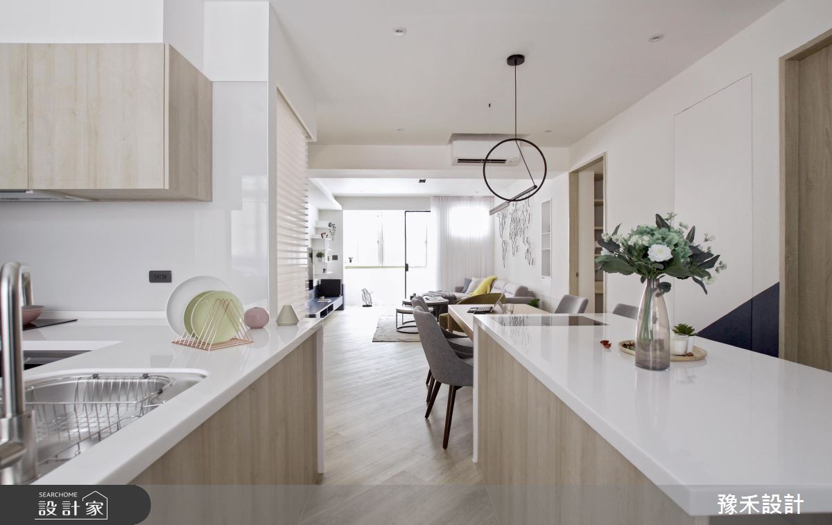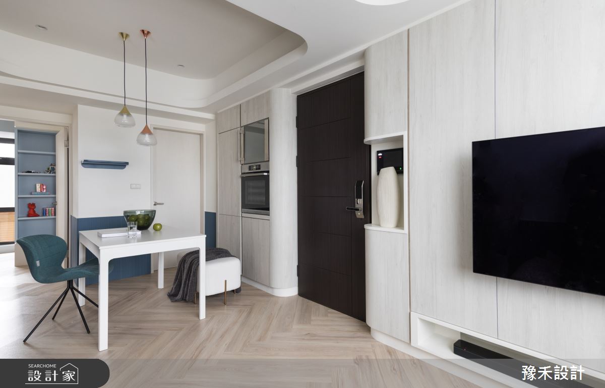 豫禾設計以乳膠漆、PVC地板、鐵件、木作貼皮、烤漆、系統板材、風琴簾、造型板、人字拼地板、崁門板冰箱、鋁製線燈、單槓的搭配應用,呈現現代風居家氛圍,將此間16坪、兩房、單層、新成屋(5年以下)打造成舒適愜意的家庭空間,完成1位大人、1位小孩全家人的夢想之居。