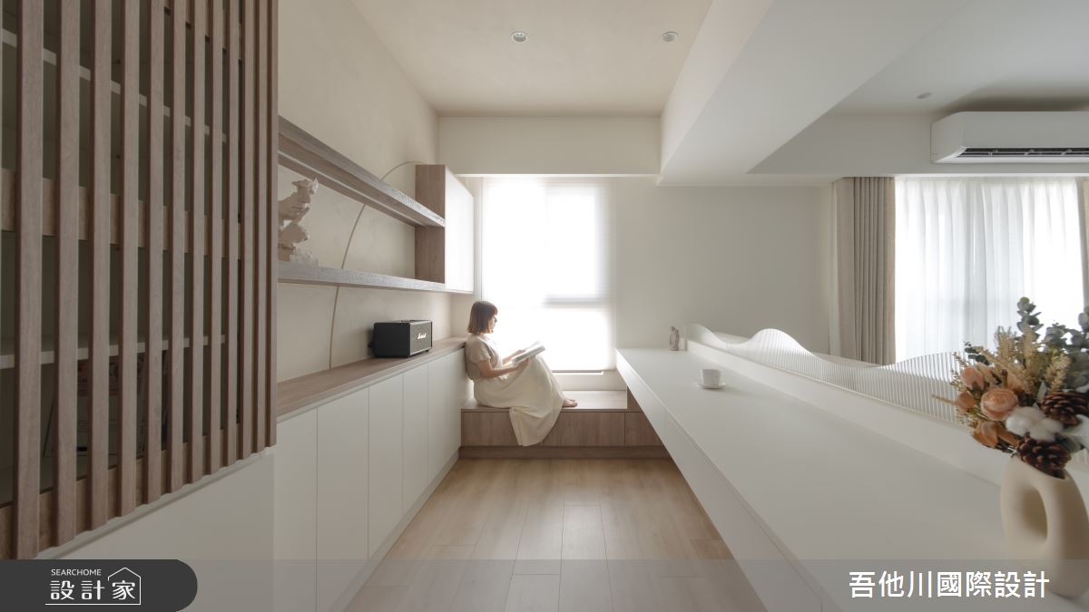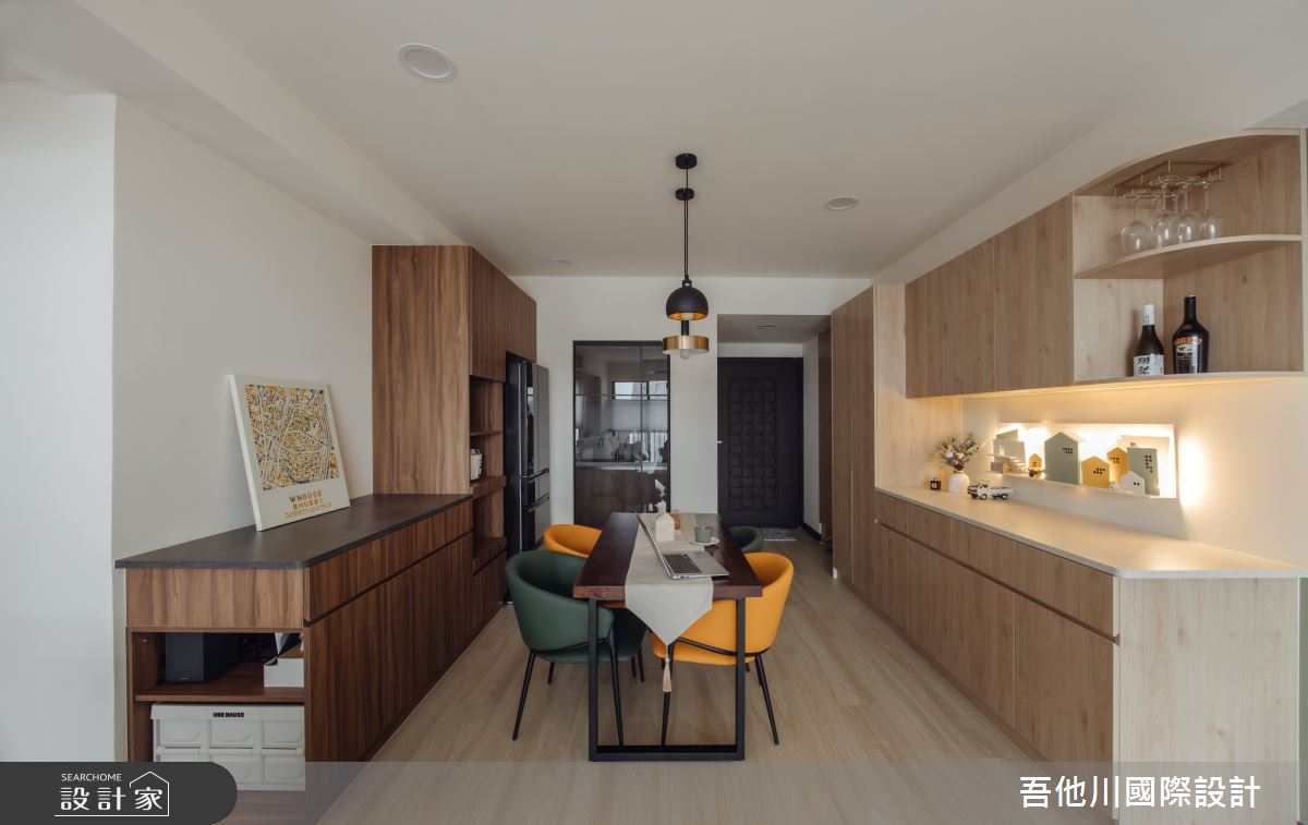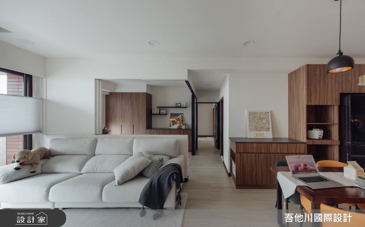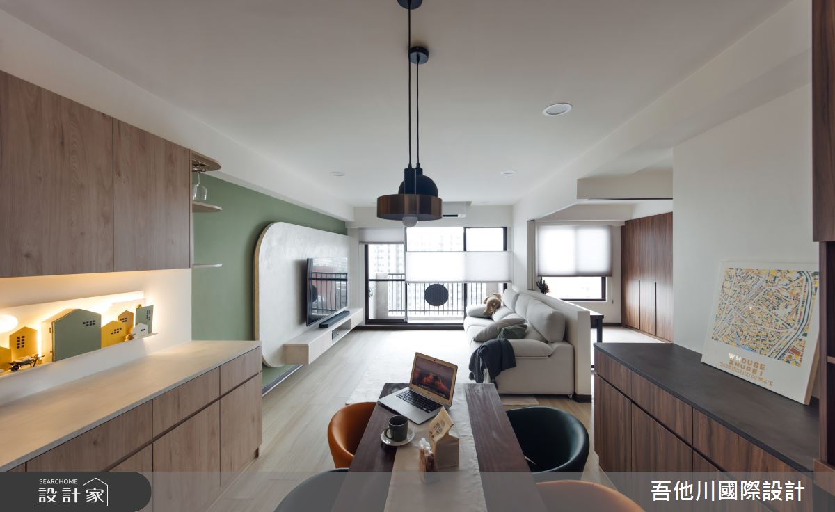 吾他川國際室內裝修有限公司以油漆、乳膠漆、大圖輸出、超耐磨木地板、木地板、木作貼皮、系統板材、軌道燈的搭配應用,呈現混搭風居家氛圍,將此間20坪、三房、單層、預售屋打造成舒適愜意的家庭空間,完成全家人的夢想之居。