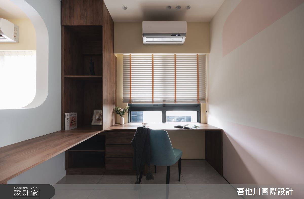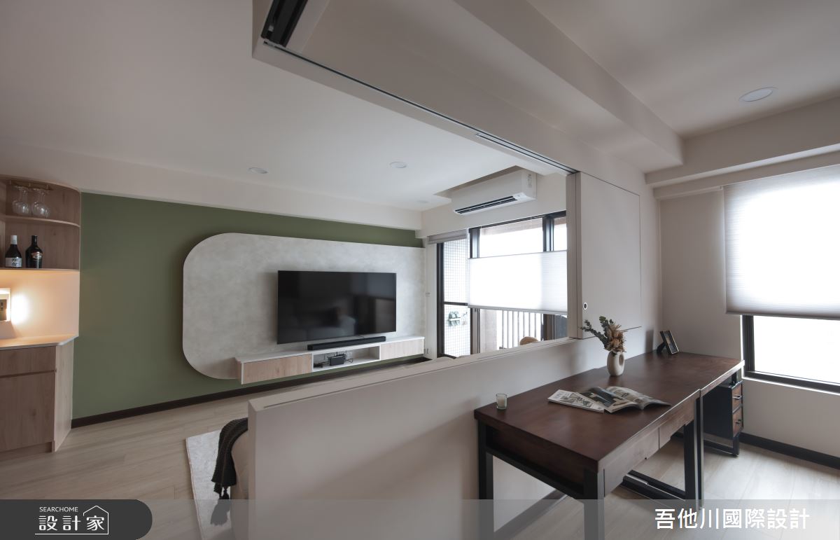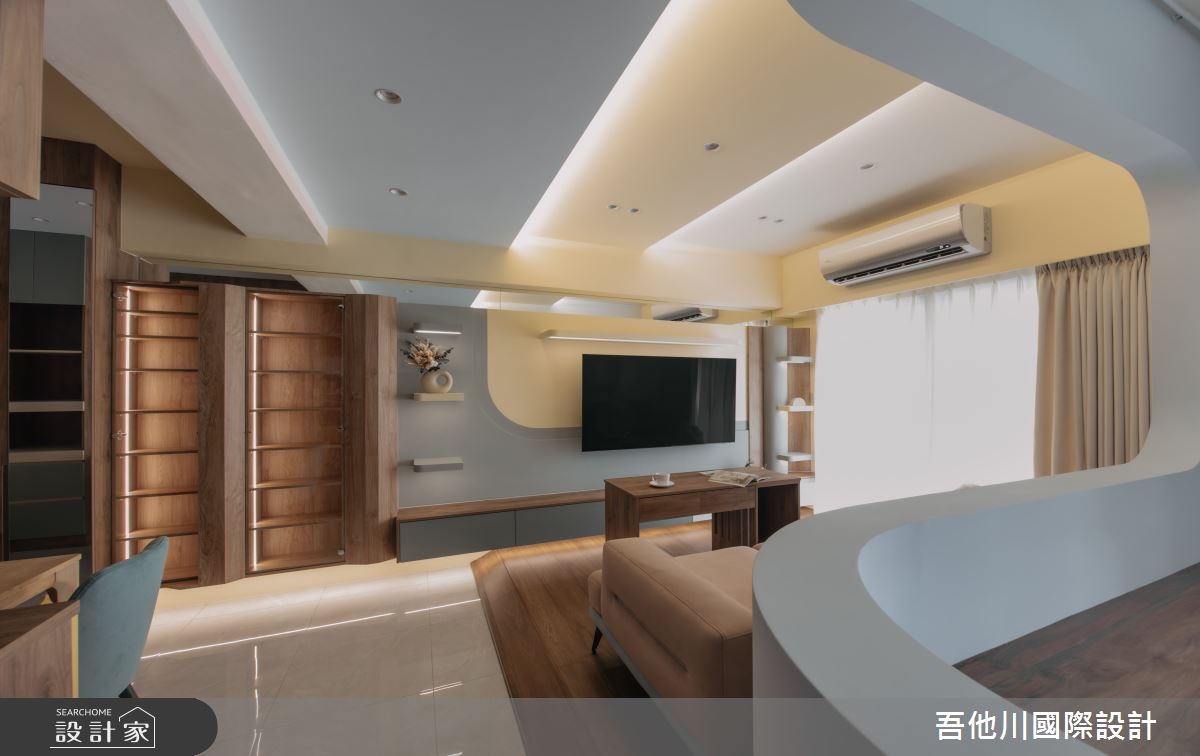 吾他川國際室內裝修有限公司以油漆、乳膠漆、大圖輸出、超耐磨木地板、木地板、木作貼皮、系統板材、軌道燈的搭配應用,呈現混搭風居家氛圍,將此間20坪、三房、單層、預售屋打造成舒適愜意的家庭空間,完成全家人的夢想之居。