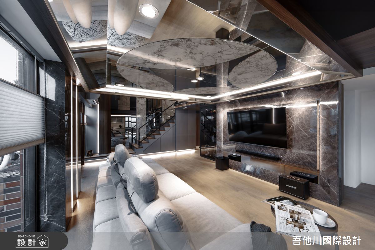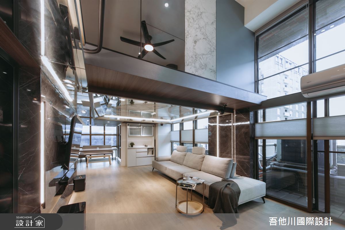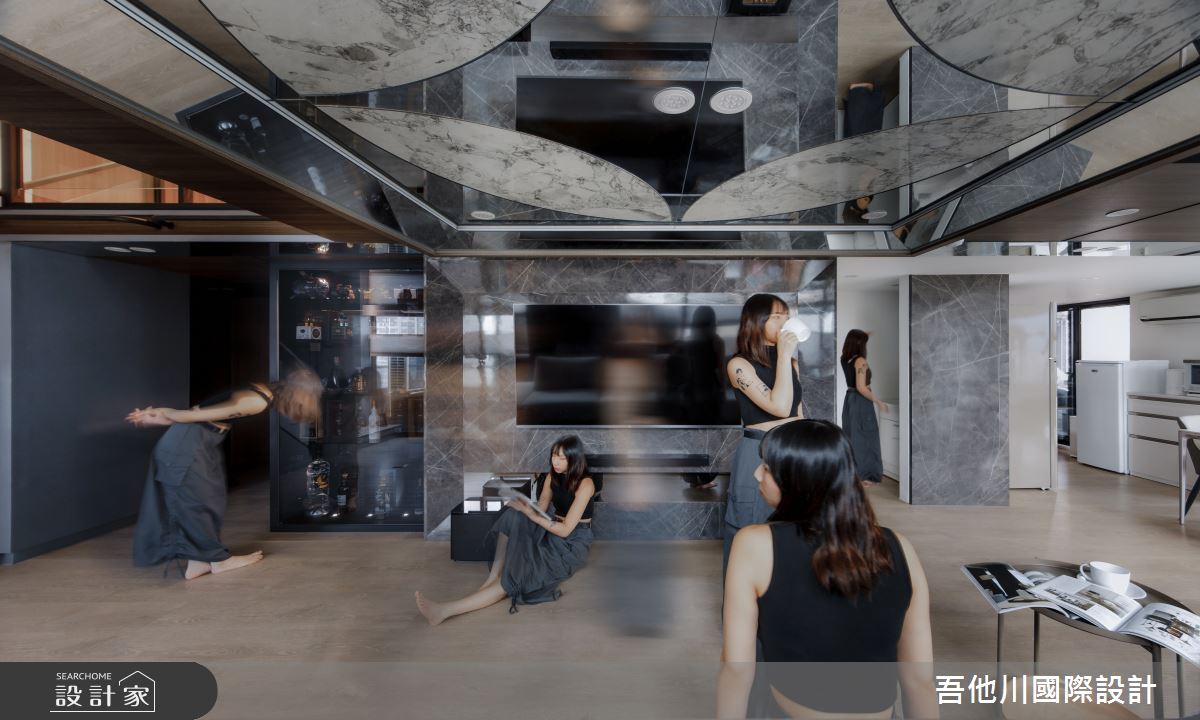 吾他川國際室內裝修有限公司以乳膠漆、磁性漆/磁性黑板漆、PVC地板、鐵件、灰鏡、烤玻、木作貼皮、系統板材、磁磚的搭配應用,呈現現代風居家氛圍,將此間42坪、三房、夾層、老屋(16~30年)打造成舒適愜意的家庭空間,完成2位大人、4位小孩全家人的夢想之居。