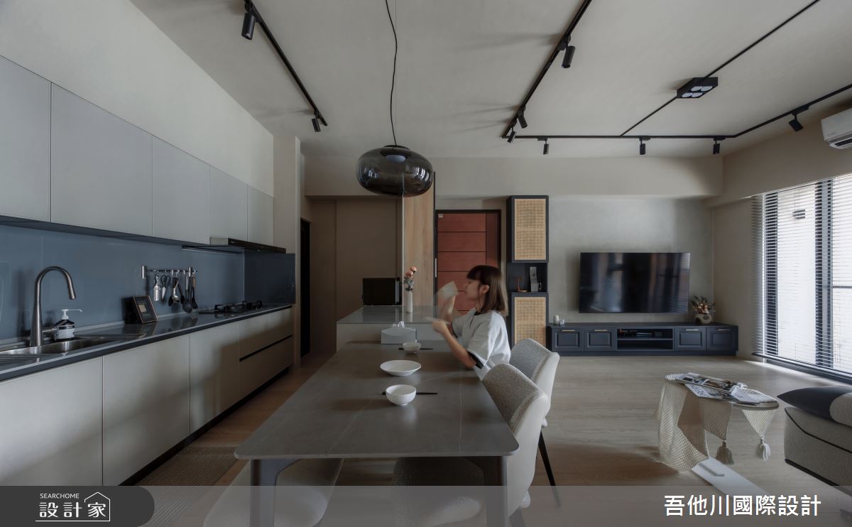 吾他川國際室內裝修有限公司以油漆、鐵道磚、花磚、水泥漆、木地板、灰鏡、木作貼皮、烤漆、系統板材、磁磚、人造石、軌道燈的搭配應用,呈現混搭風居家氛圍,將此間22.5坪、三房、單層、新成屋(5年以下)打造成舒適愜意的家庭空間,完成2位大人全家人的夢想之居。