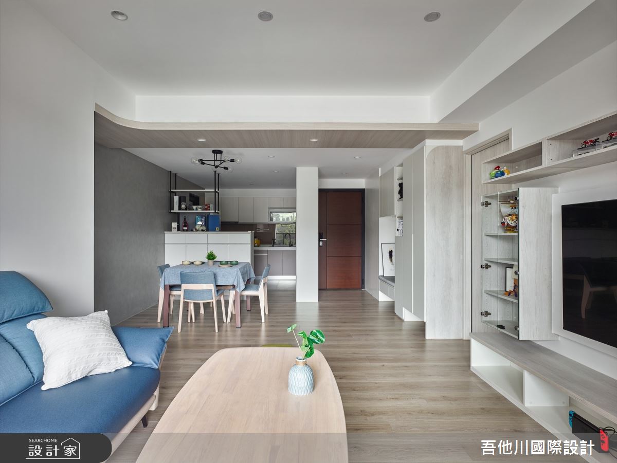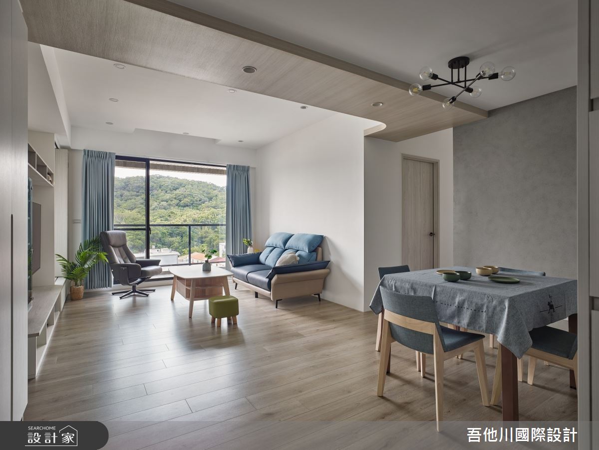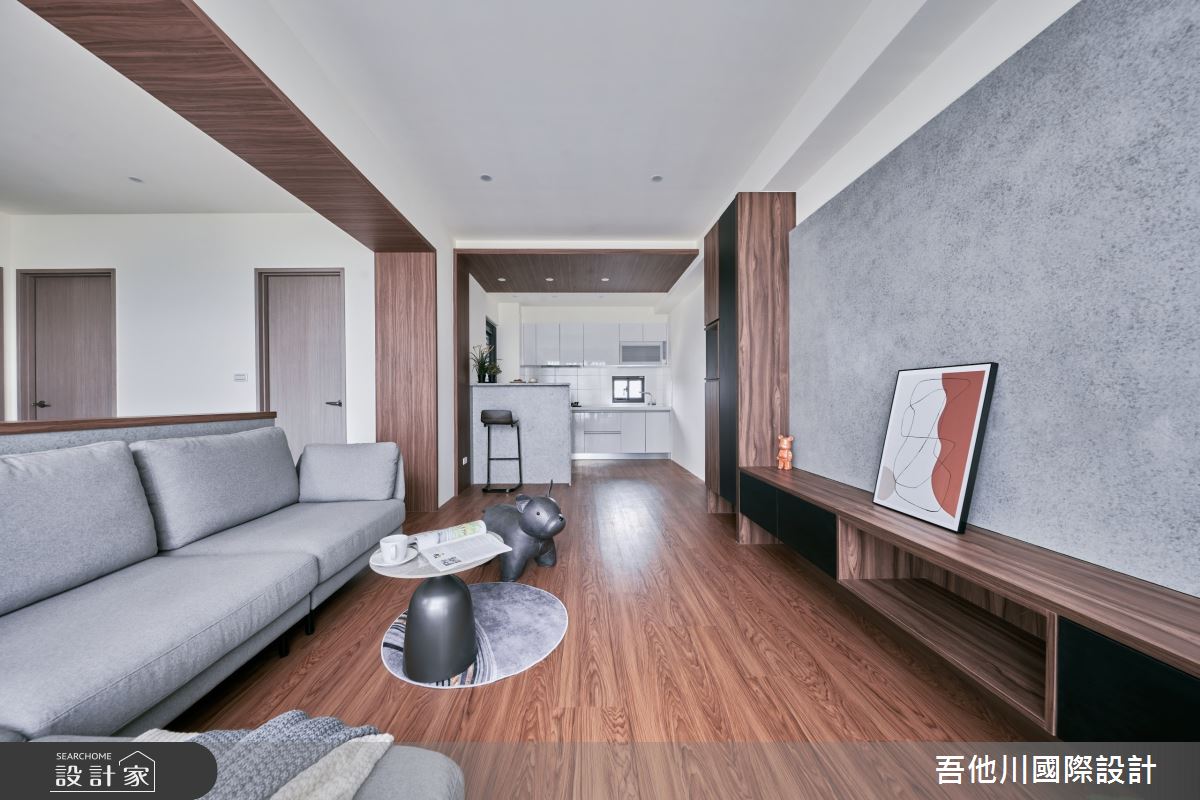吾他川國際室內裝修有限公司以油漆、乳膠漆、壁紙、超耐磨木地板、鐵件、水泥/水泥粉光、人造石、噴漆的搭配應用,呈現簡約風居家氛圍,將此間35坪、兩房、單層、新成屋(5年以下)打造成舒適愜意的家庭空間,完成2位大人全家人的夢想之居。