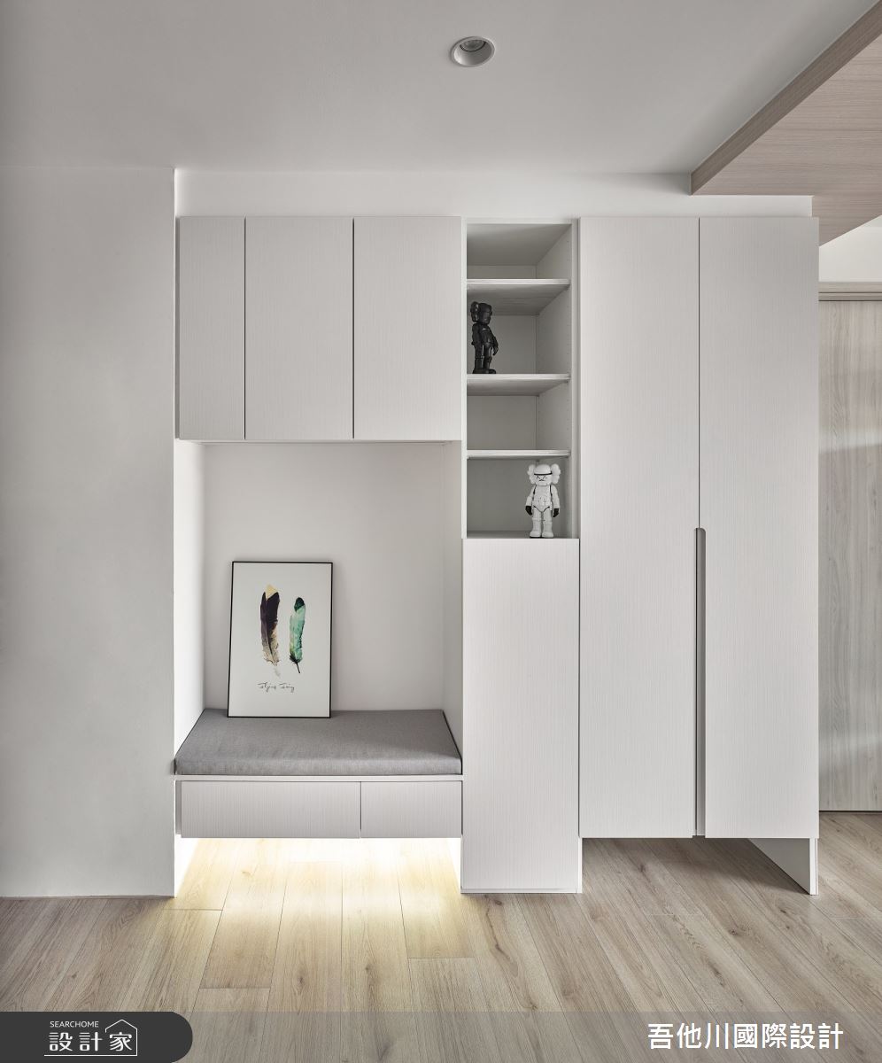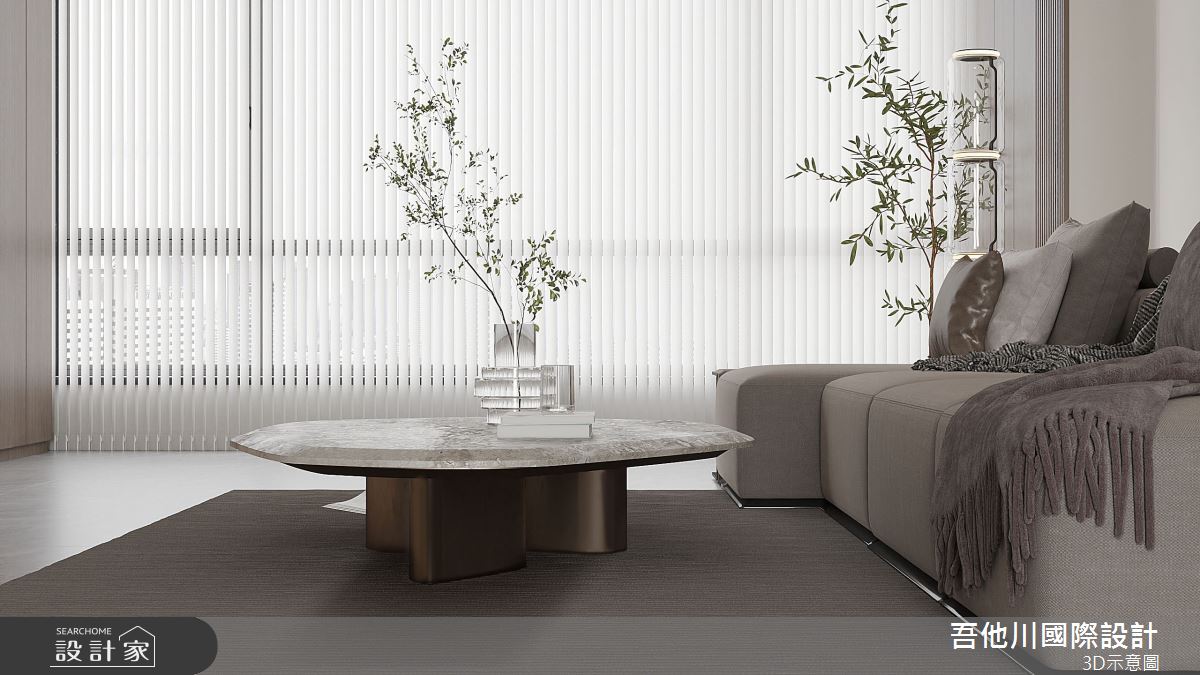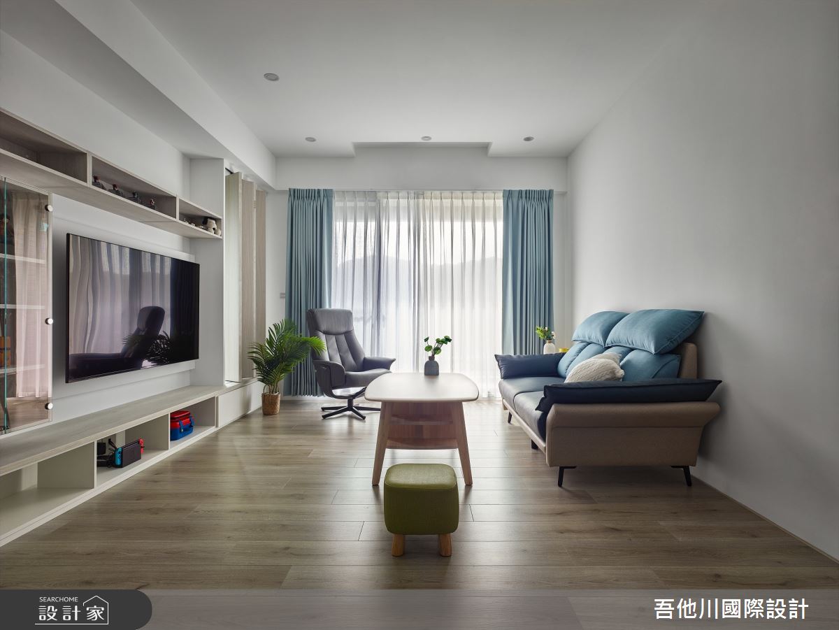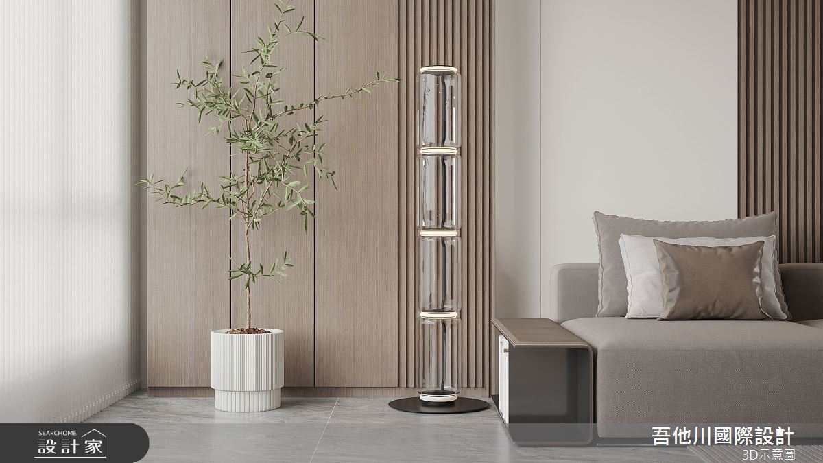 吾他川國際室內裝修有限公司以油漆、乳膠漆、壁紙、超耐磨木地板、鐵件、水泥/水泥粉光、人造石、噴漆的搭配應用,呈現簡約風居家氛圍,將此間35坪、兩房、單層、新成屋(5年以下)打造成舒適愜意的家庭空間,完成2位大人全家人的夢想之居。