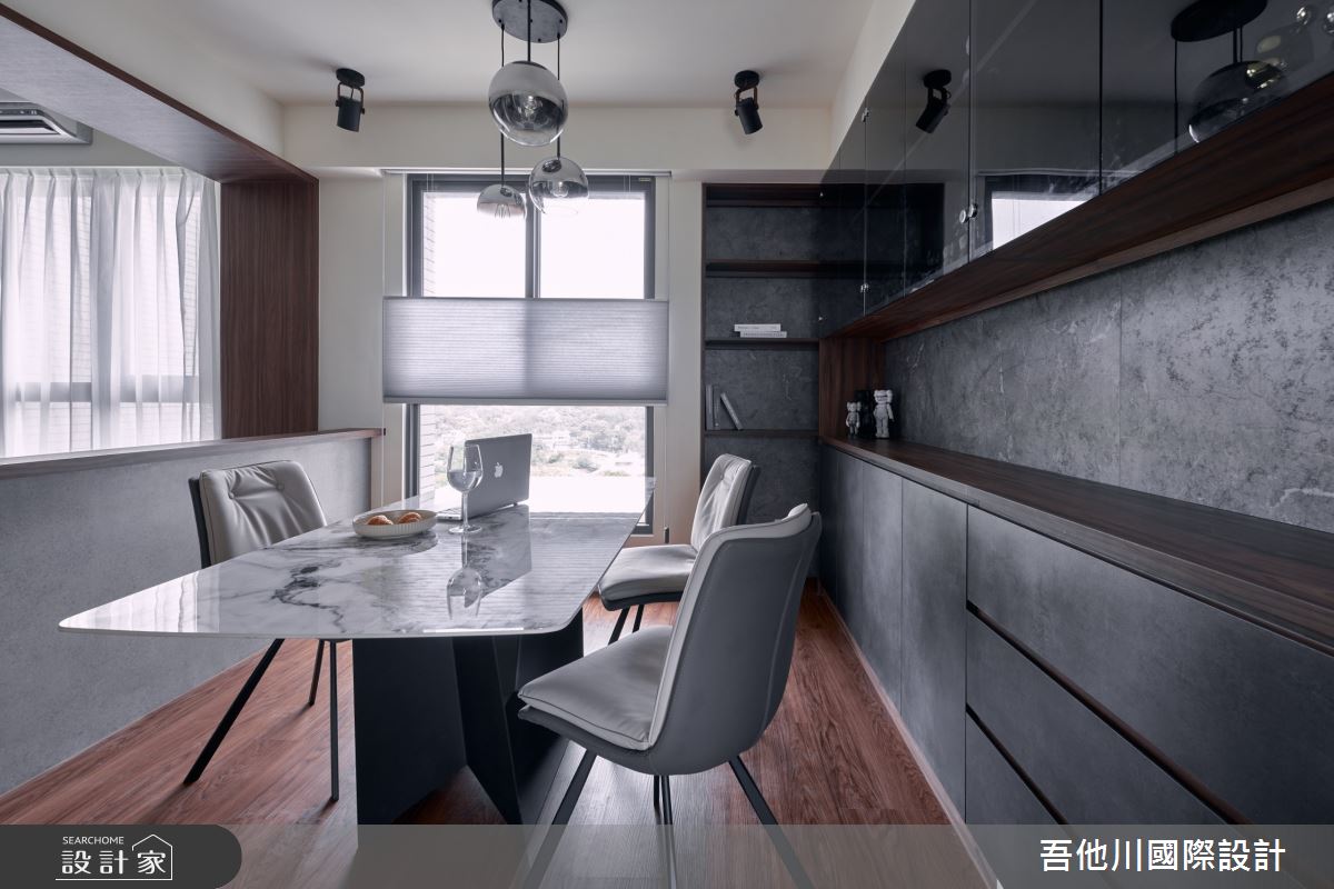 由吾他川國際室內裝修有限公司精心規劃的28坪兩房住宅空間,家庭成員一共有2位大人。因應屋主需求,設計師運用現代風作為主軸,搭配乳膠漆、壁紙、磁性漆/磁性黑板漆、超耐磨木地板、灰鏡、木作貼皮、大理石、磁磚、樂土、石材、繃布,打造全家人的夢想家居。