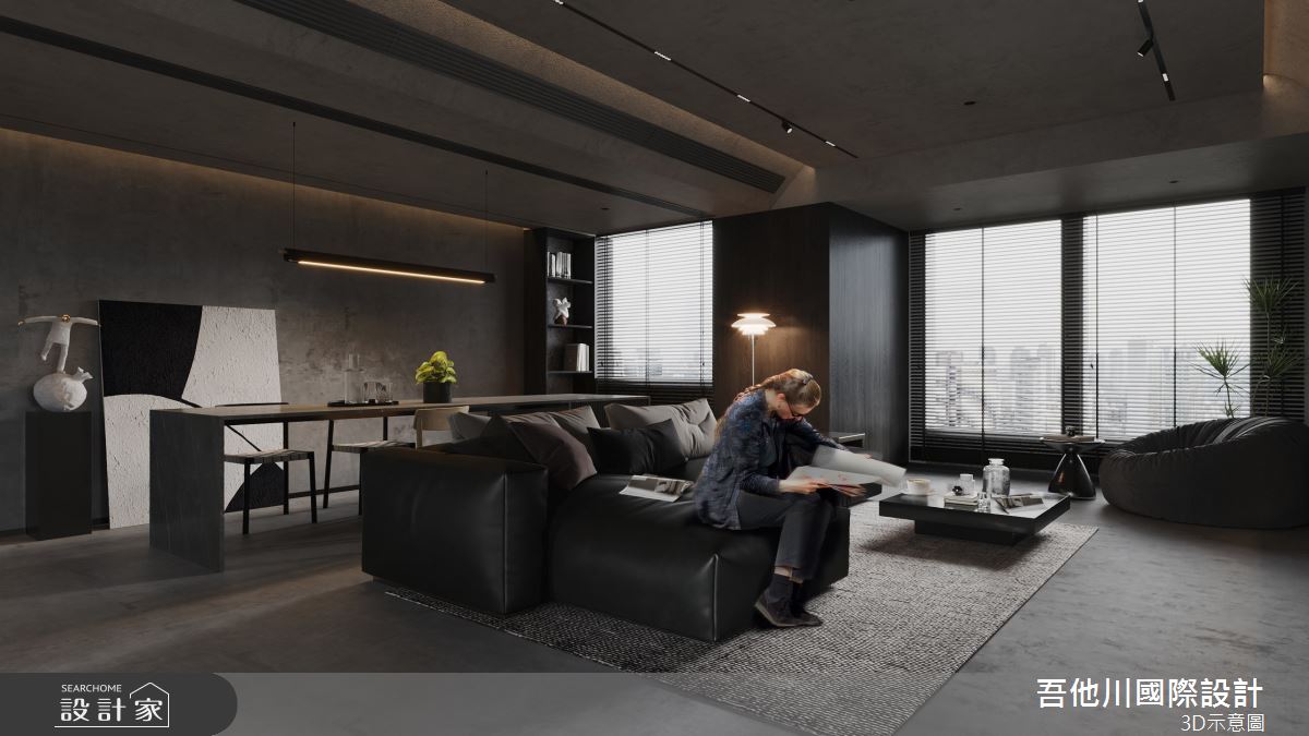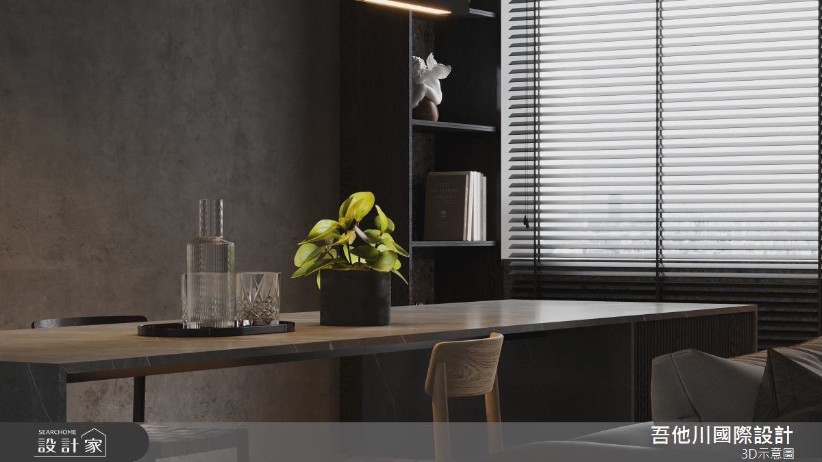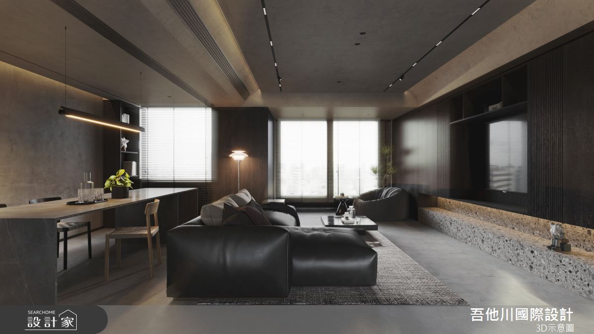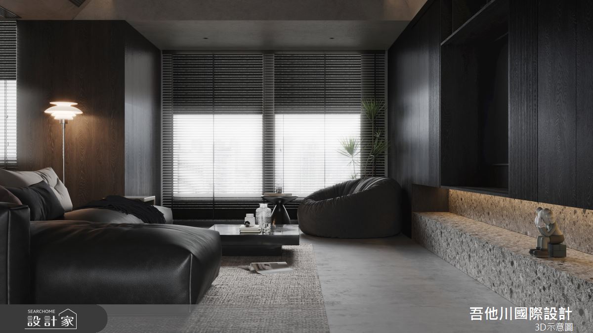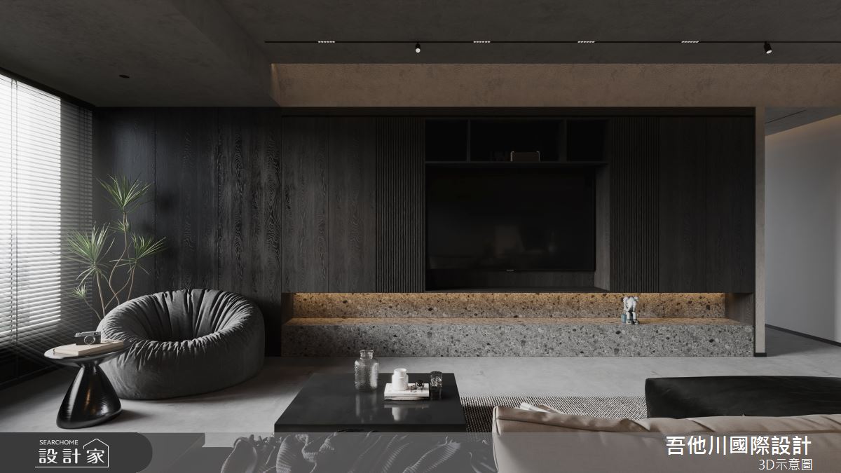 吾他川國際室內裝修有限公司以乳膠漆、壁紙、磁性漆/磁性黑板漆、超耐磨木地板、灰鏡、木作貼皮、大理石、磁磚、樂土、石材、繃布、鏡面貼皮的搭配應用,呈現現代風居家氛圍,將此間55.7坪、三房、透天別墅、新成屋(5年以下)打造成舒適愜意的家庭空間,完成全家人的夢想之居。