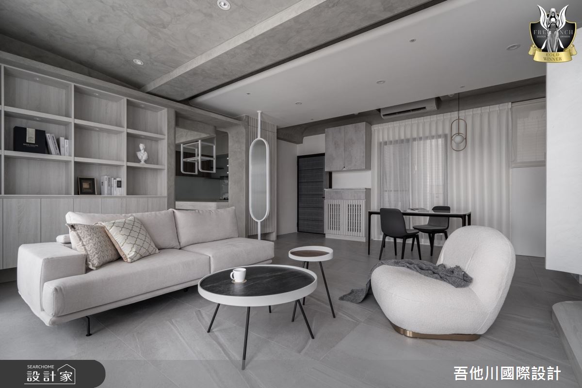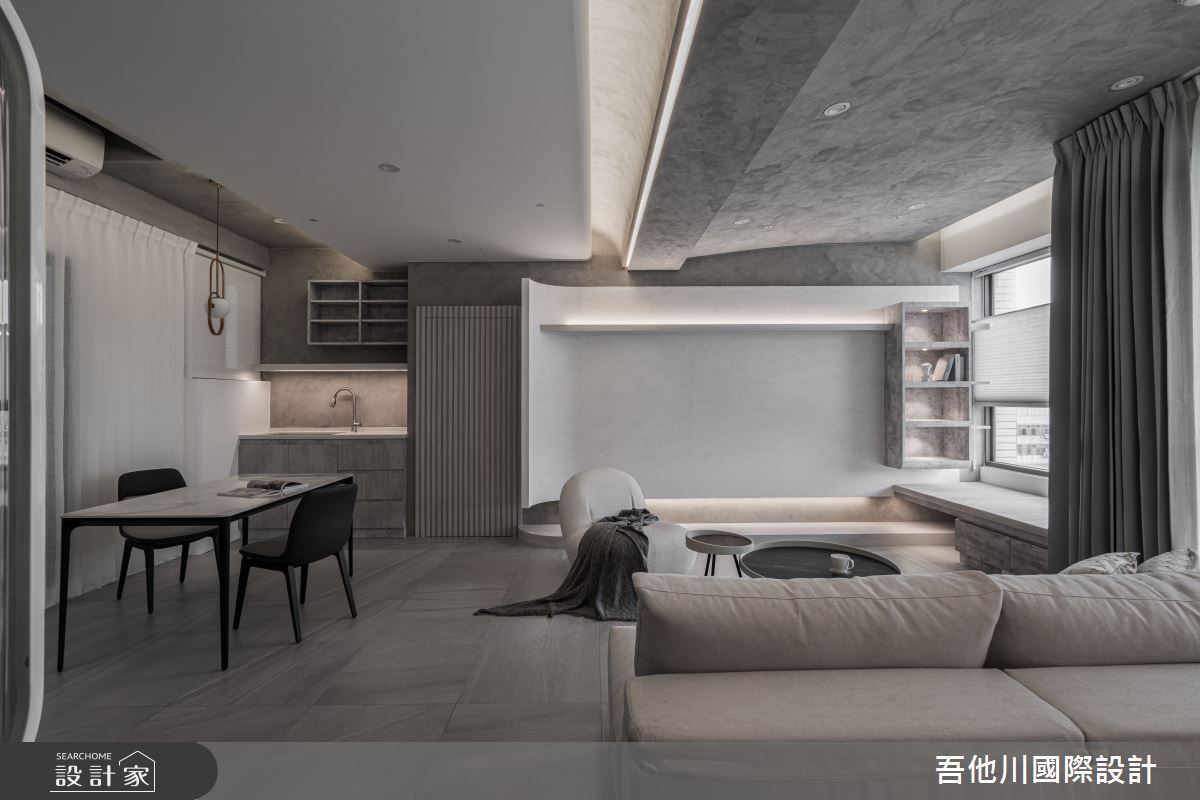 本案為吾他川國際室內裝修有限公司的28坪混搭風新成屋(5年以下)設計作品,格局為單層兩房的居住空間。居住成員包含5位大人、1位小孩。全室建材的搭配,應用乳膠漆、壁紙、磁性漆/磁性黑板漆、石英磚/拋光石英磚、灰鏡、木作貼皮、大理石、樂土、石材、繃布,展現溫馨的居家氛圍。