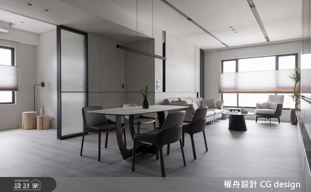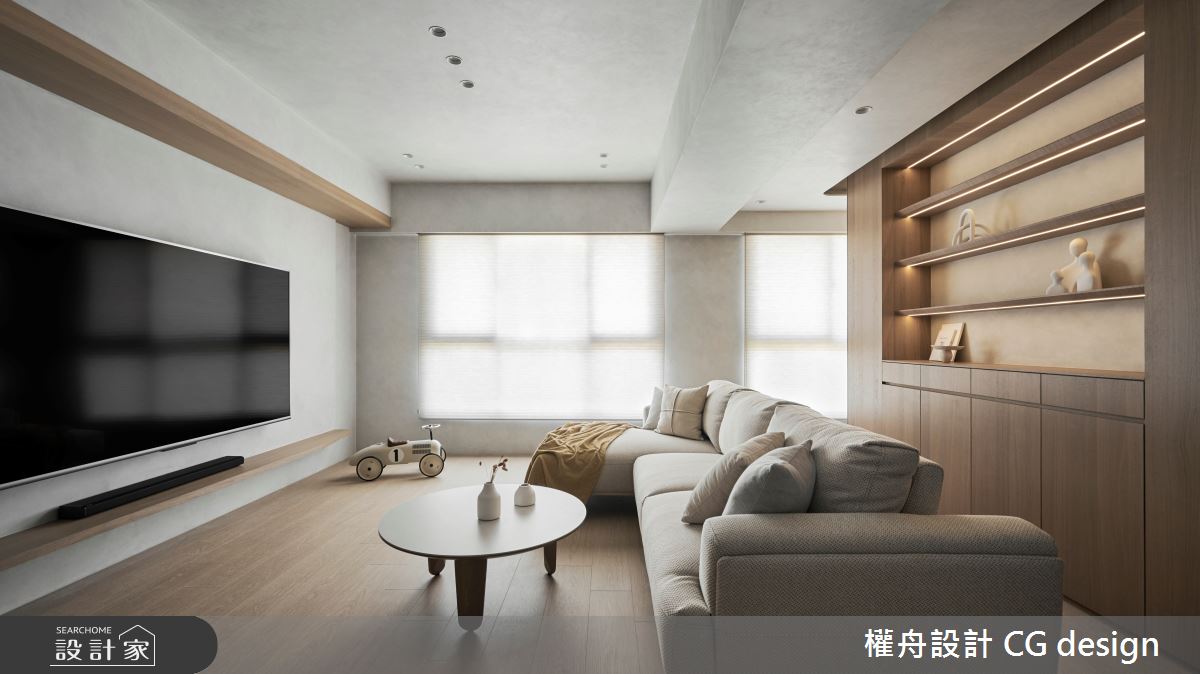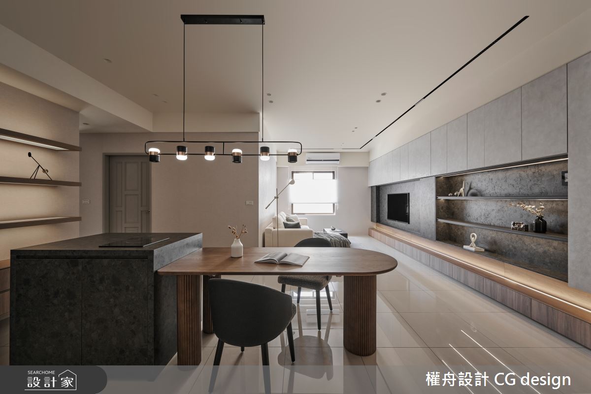 由權舟室內設計有限公司精心規劃的25坪三房住宅空間,家庭成員一共有2位大人、2位小孩。因應屋主需求,設計師運用混搭風作為主軸,搭配壁紙、水泥漆、石英磚/拋光石英磚、系統板材、磁吸式軌道燈,打造全家人的夢想家居。
